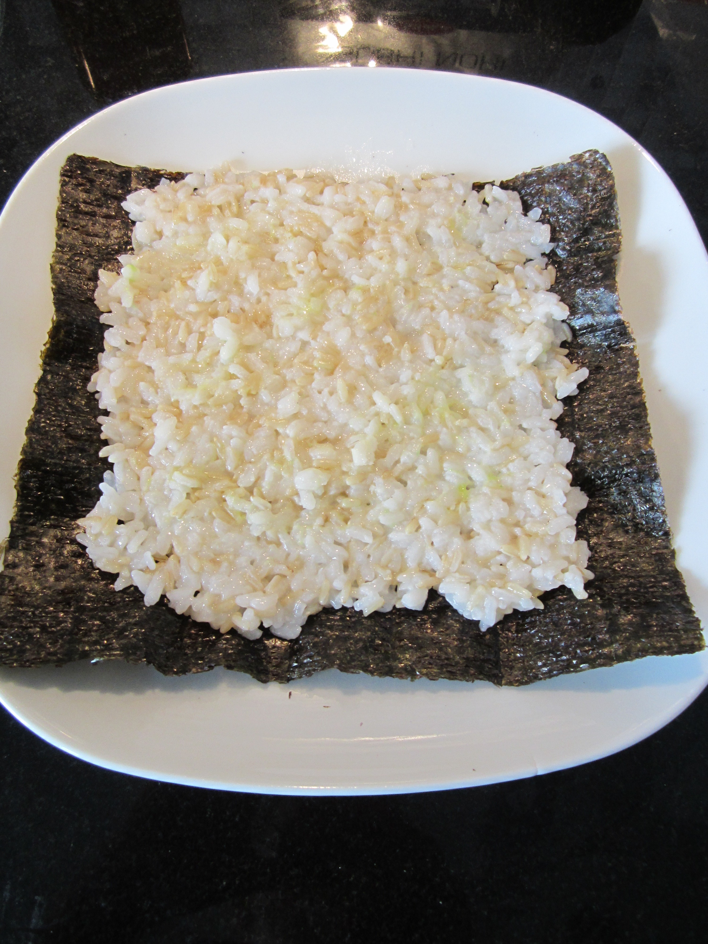Vask og kok opp ris. Jeg bruker som regel en 50/50 blanding med sushiris og brun ris. Mot slutten av koketiden har jeg en slant eddik i vannet. Vannet skal koke ut, men risen må gjerne være ganske klebrig.