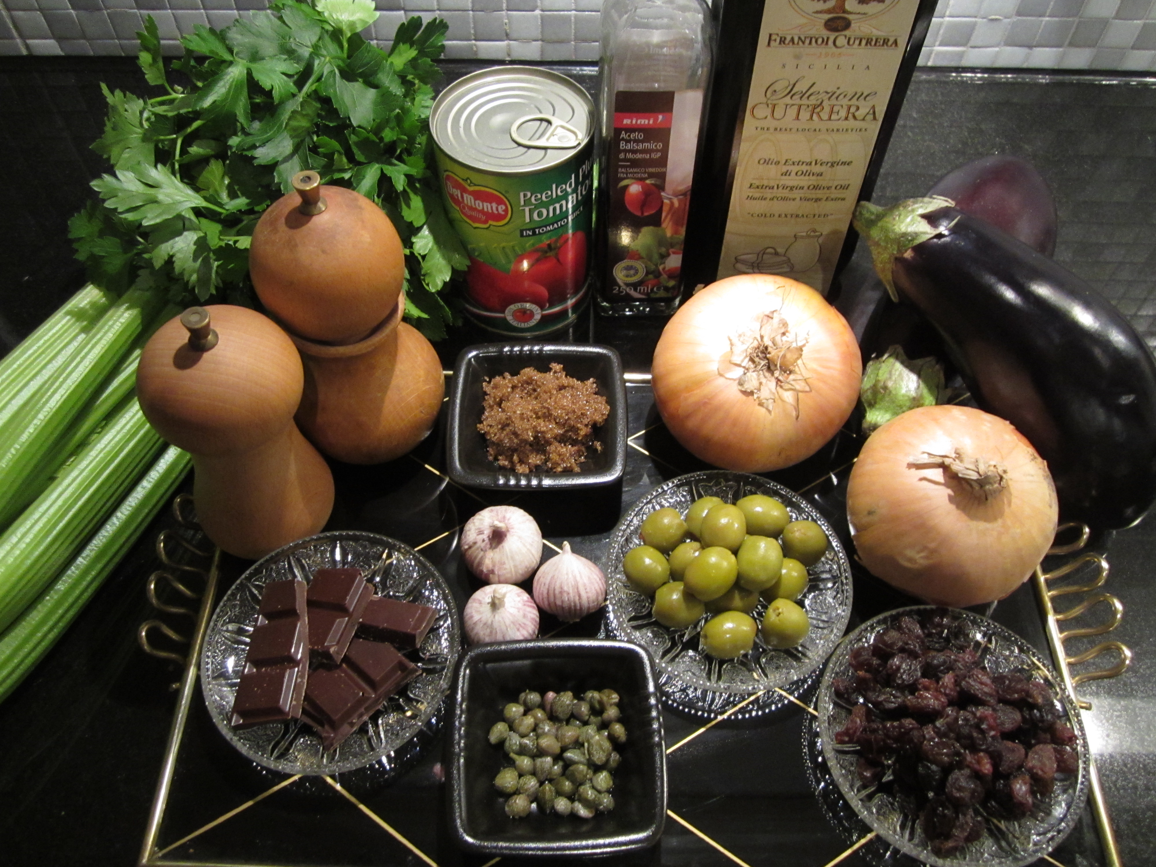 Varm 1 ss olje i en gryte. Ha i stangselleri, løk og hvitløk. La dette surre over ganske lav varme i rundt 10 minutter, til det grønnsakene er møre. Tilsett så hakket tomat. La blandingen koke ytterligere 5 minutter slik at den reduseres noe. Tilsett deretter balsamicoeddik, sukker, sjokolade, kapers og rosiner. La retten koke 5 – 10 minutter, trekk så gryten av pannen. Smak til med salt og pepper.