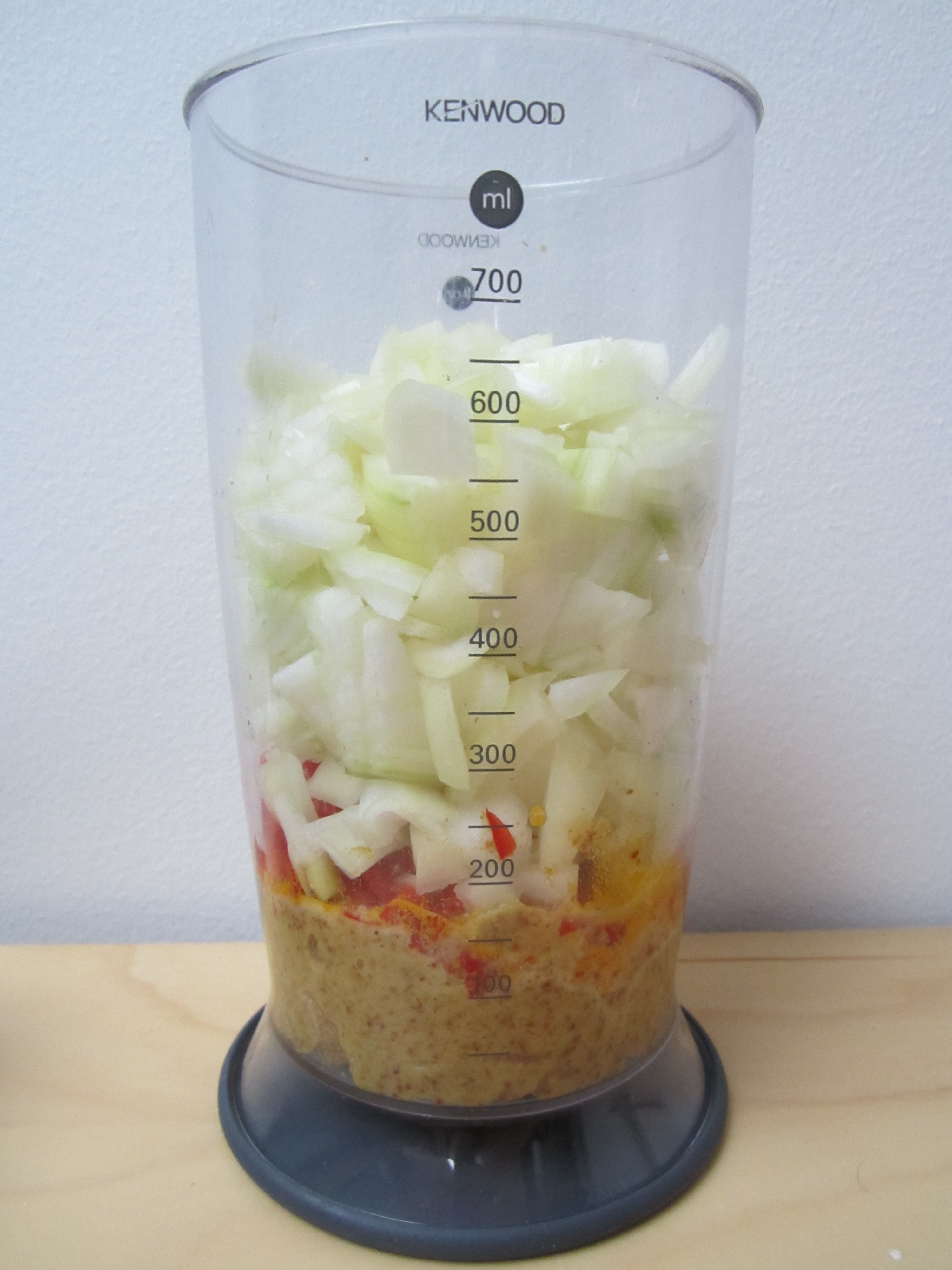 Mål opp sennep, eddik og krydder. Finhakk chili, hvitløk og løk.