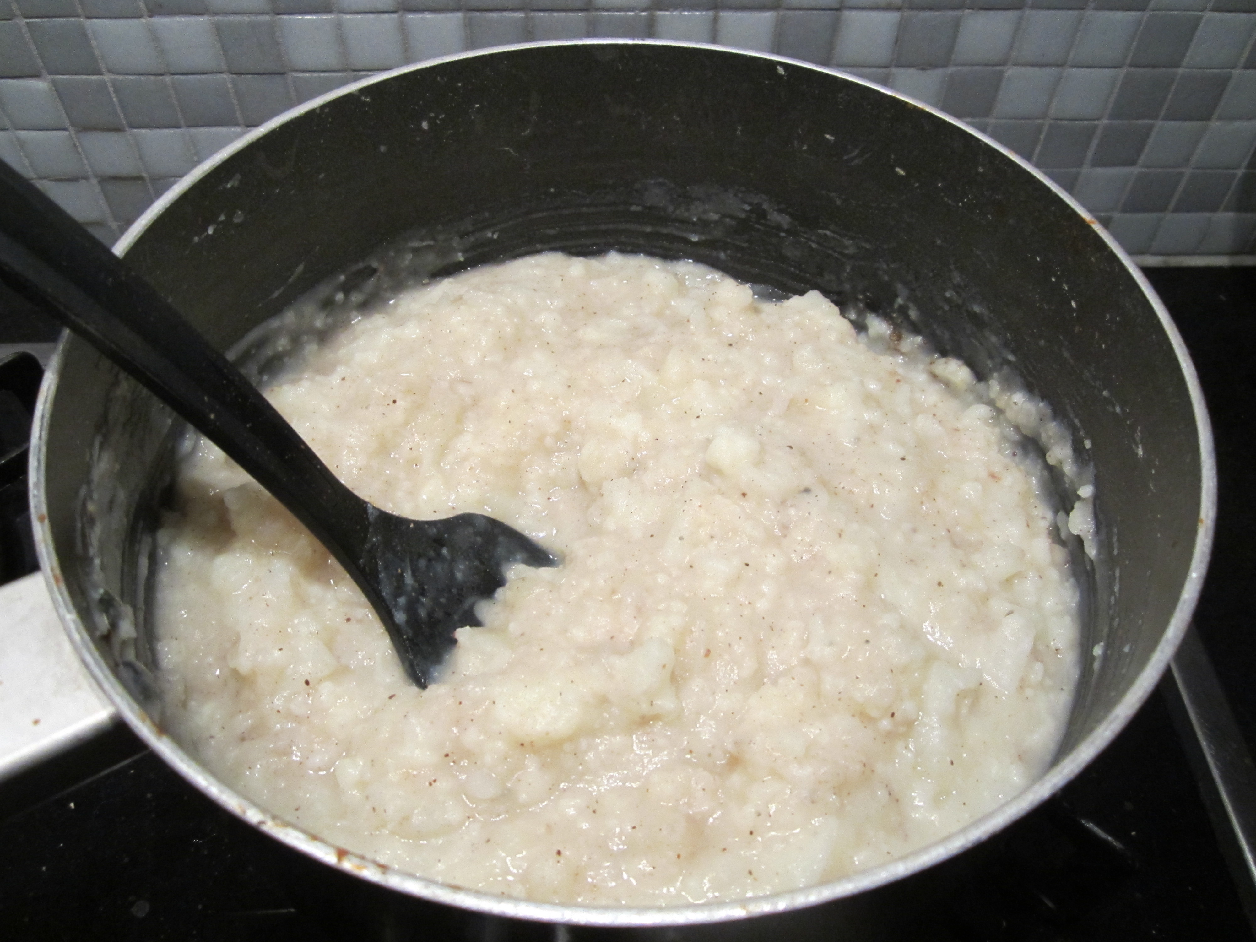 Gjør mosen smidig med melk. Jeg brukte havremelk, men hvilken som helst type er ok. Smaksett med tørket muskat og pepper.