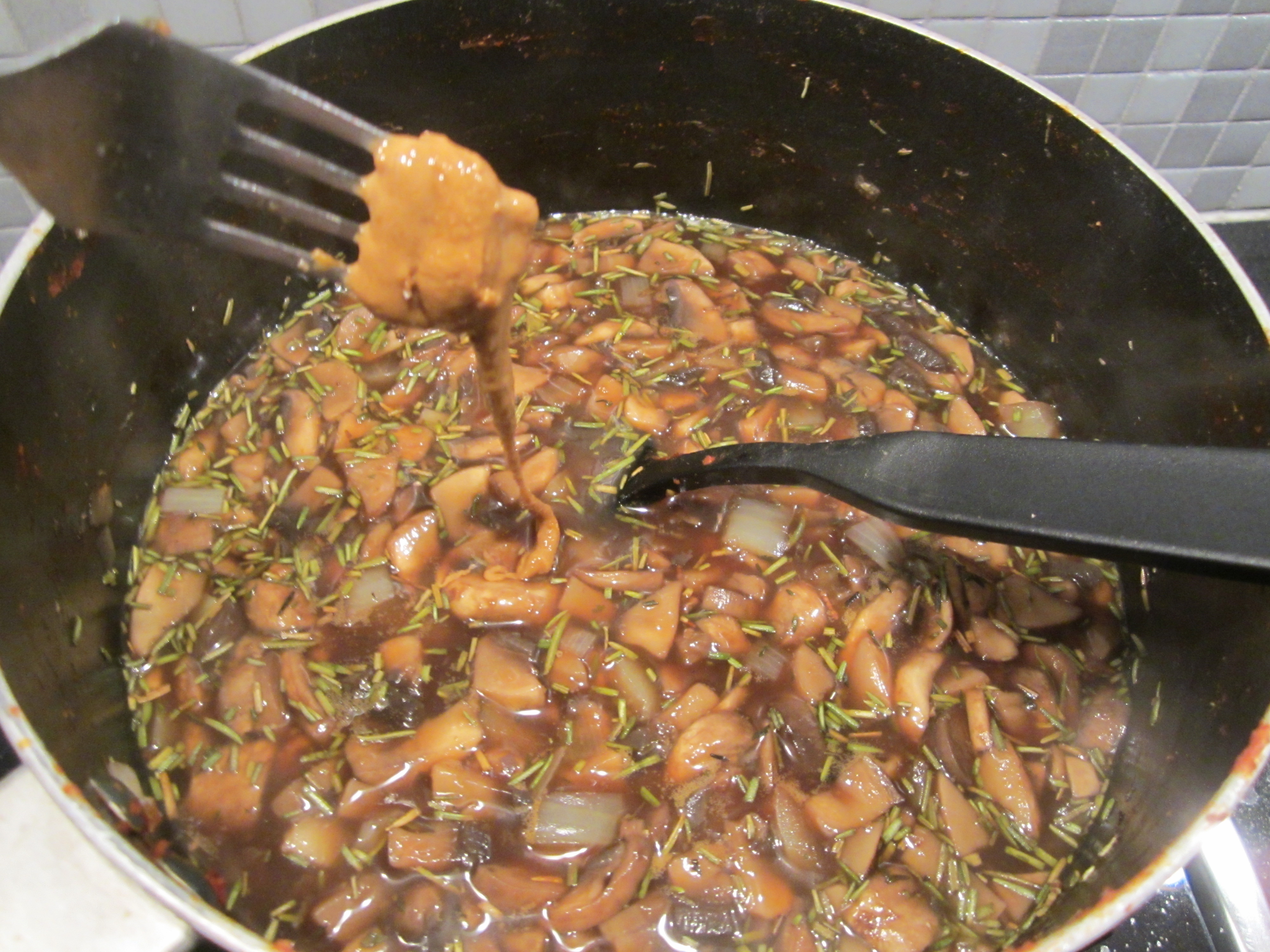 Tilsett så hakket sopp, samt timian, rosmarin og laurbærblad. Dersom du bruker friske urter, ha i noe mer enn hva som er angitt i oppskriften. Kok i et par minutter til soppen blir litt myk.