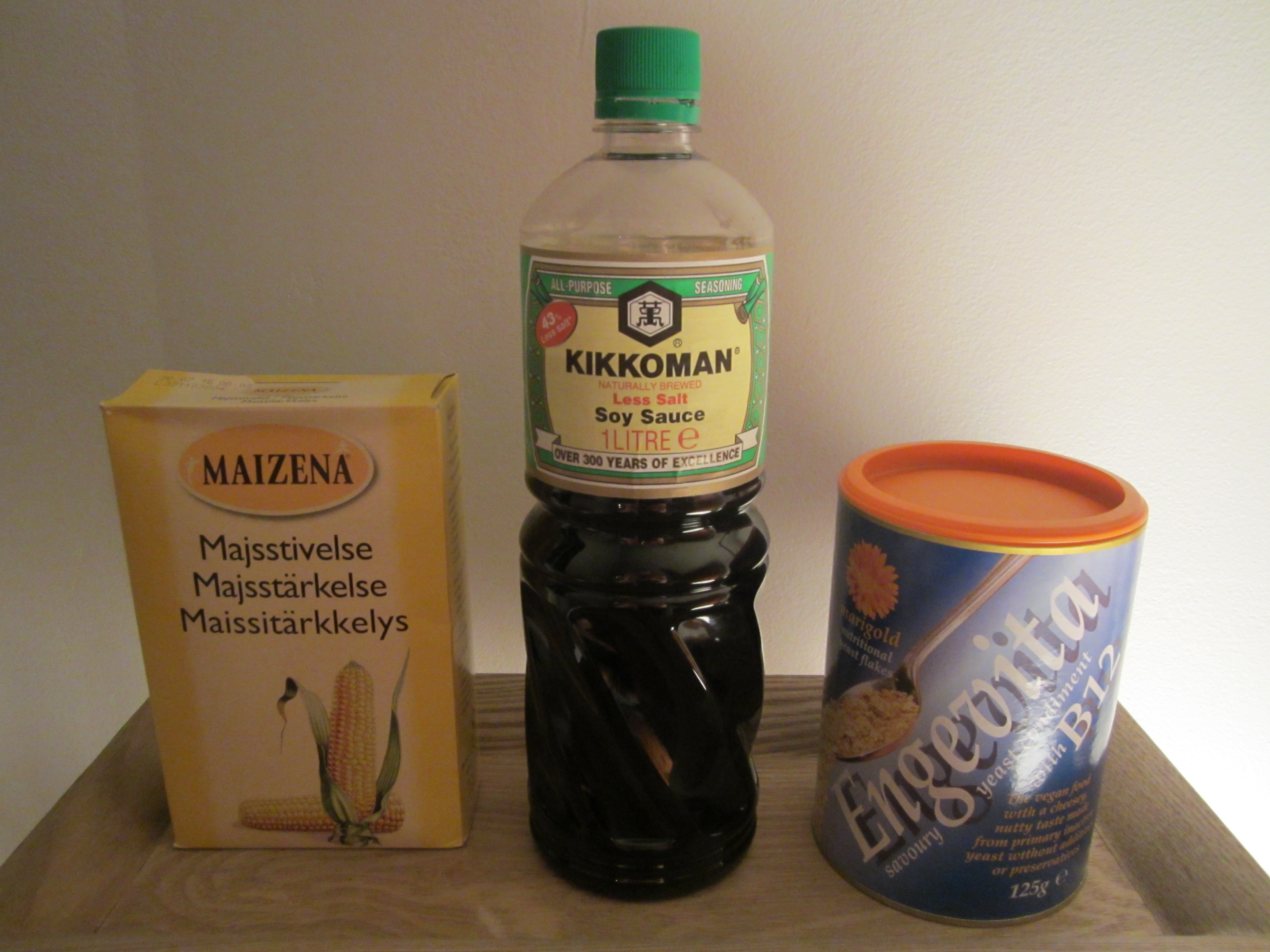 Ha maisstivelse og nutritional yeast i en skål. Hell over soyasaus. Bland godt med en gaffel. Dette skal bli en tykk paste.