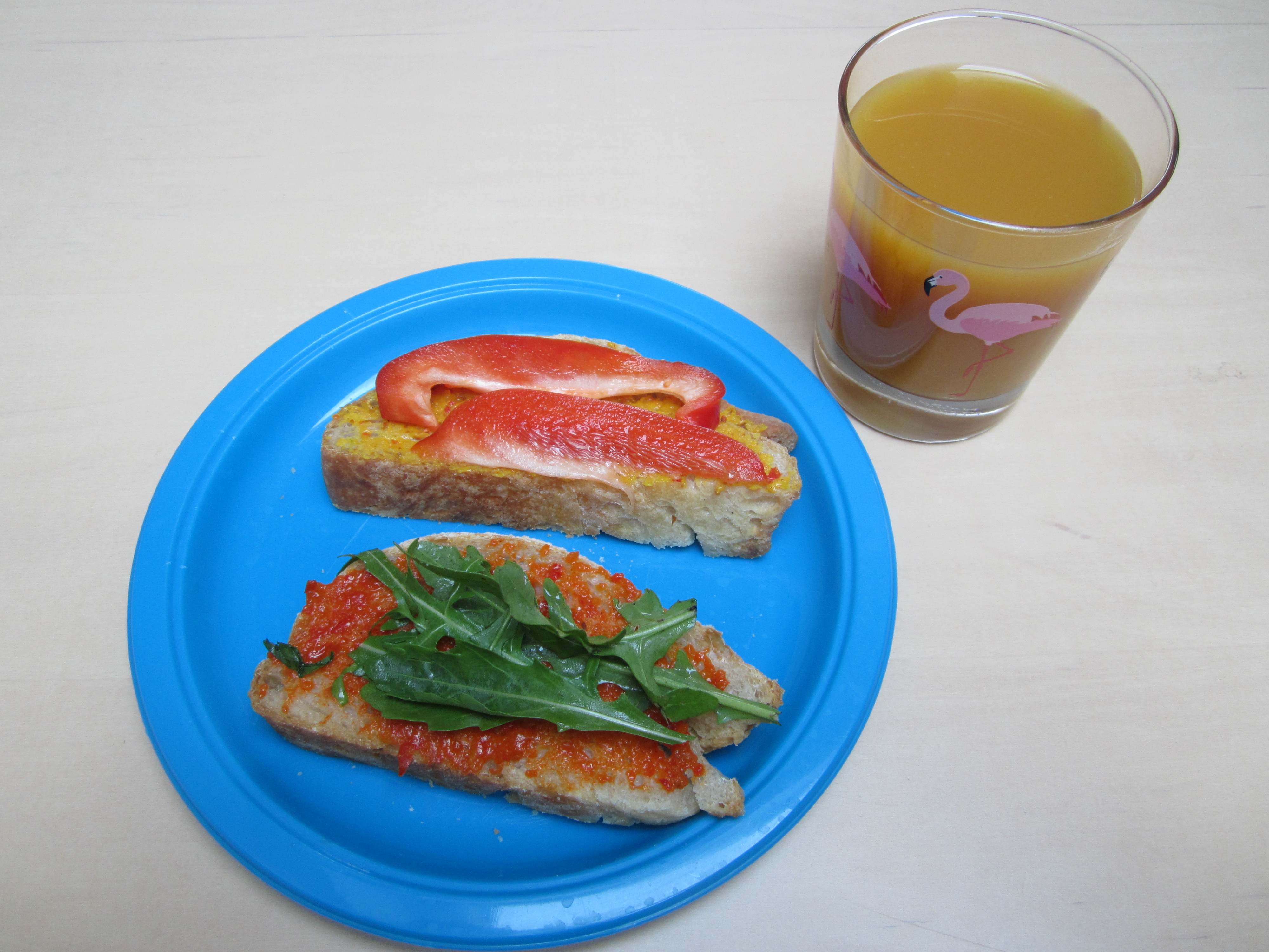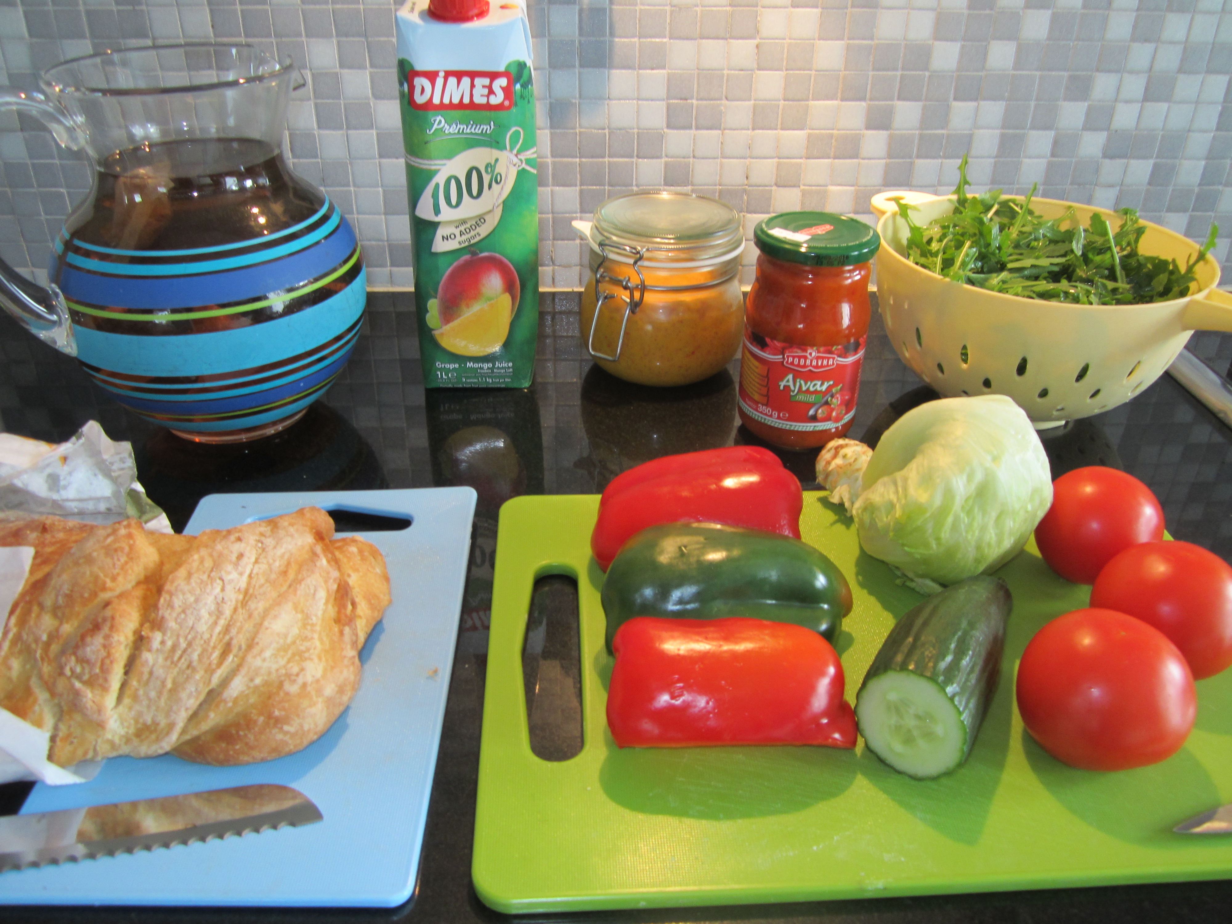 Hjemmelaget iste, mango- og druejuice, bajan pepper sauce, ajvar, ruccola, diverse grønnsaker og ferskt brød fra grønnsaksbutikken på hjørnet.