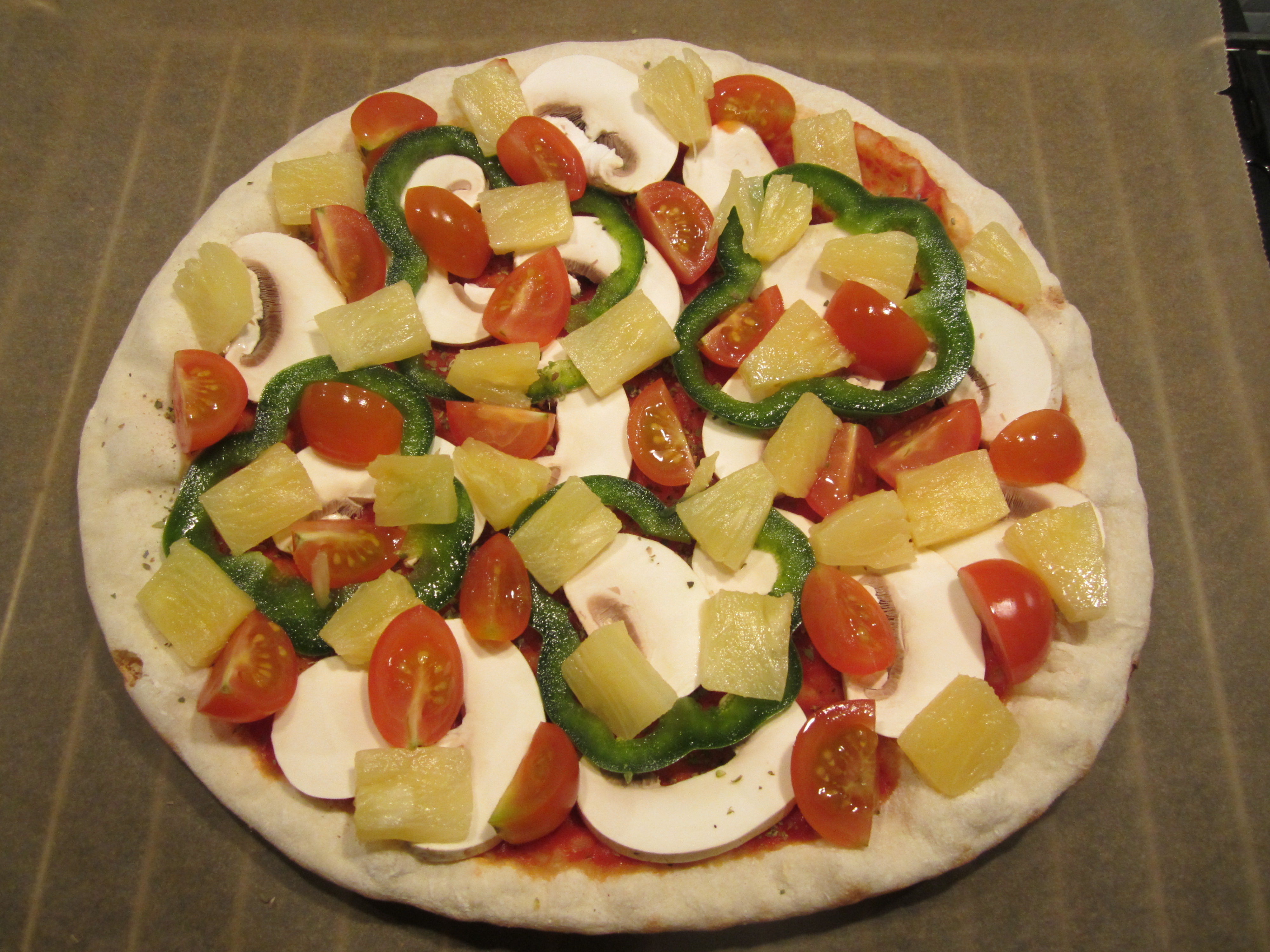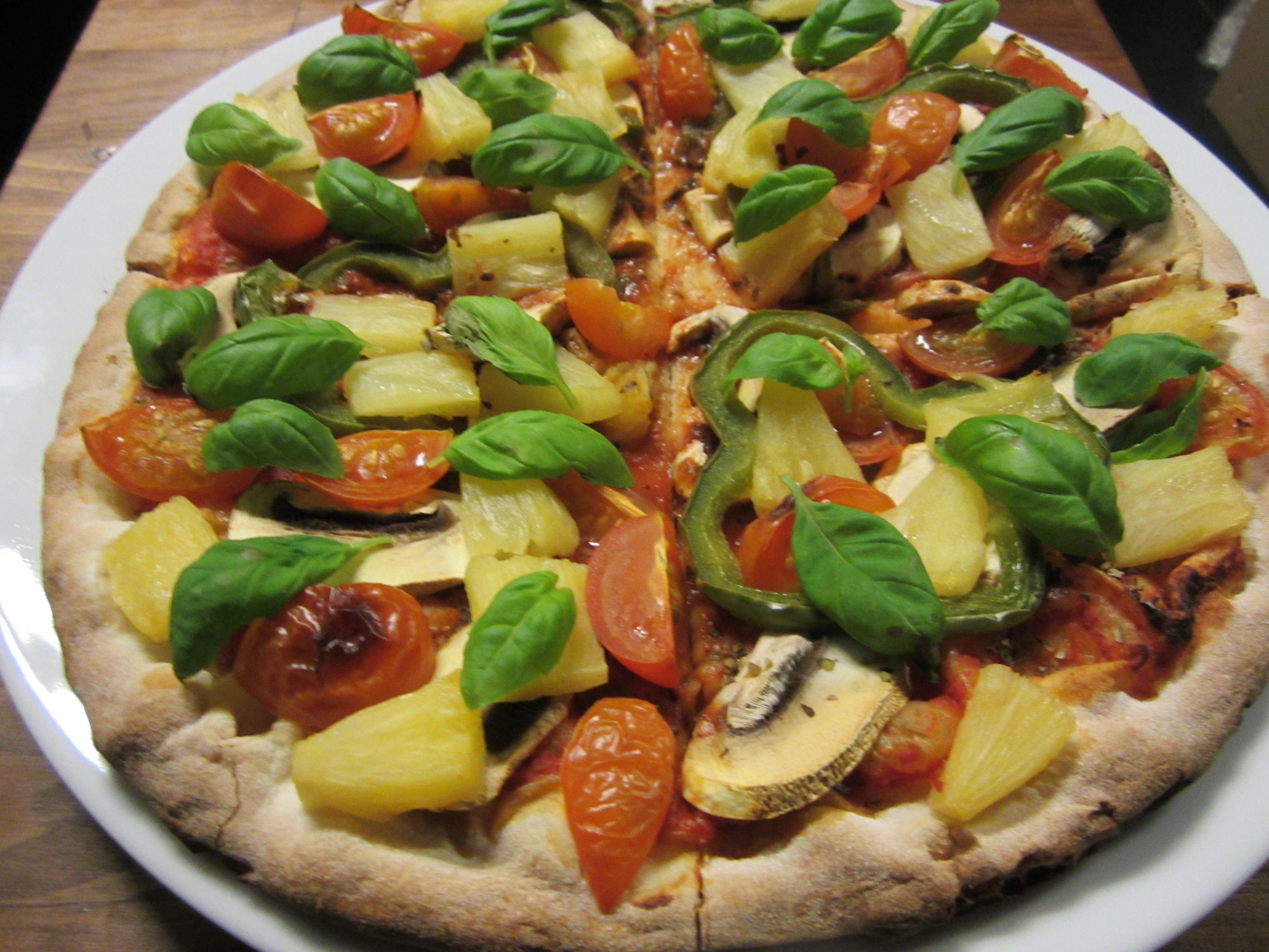 Her illustert med en pizzakrydder-miks, grønn paprika, sjampinjong, cherrytomat og ananas. Og så litt frisk basilikum på toppen etter at den er tatt ut av ovnen.