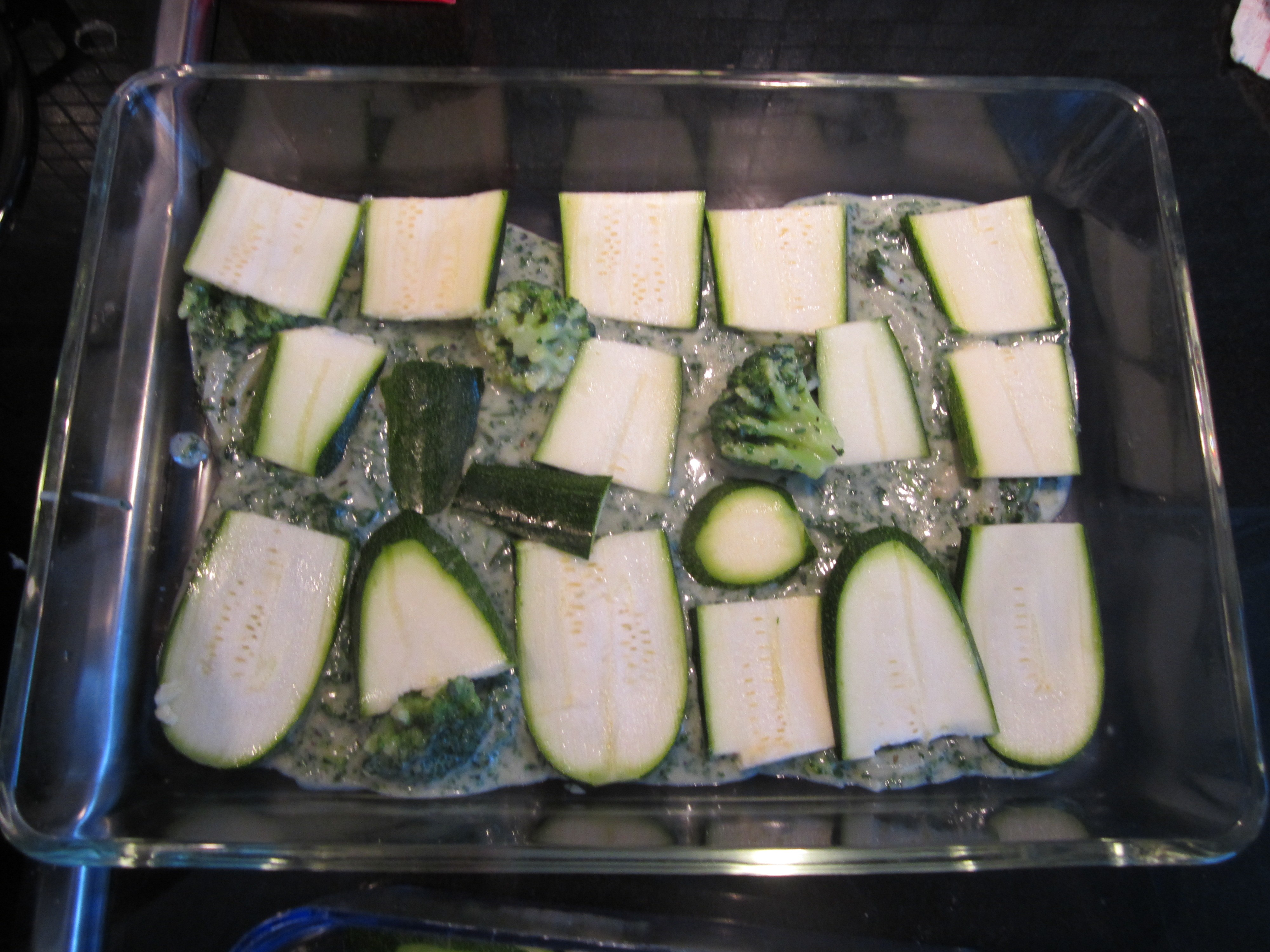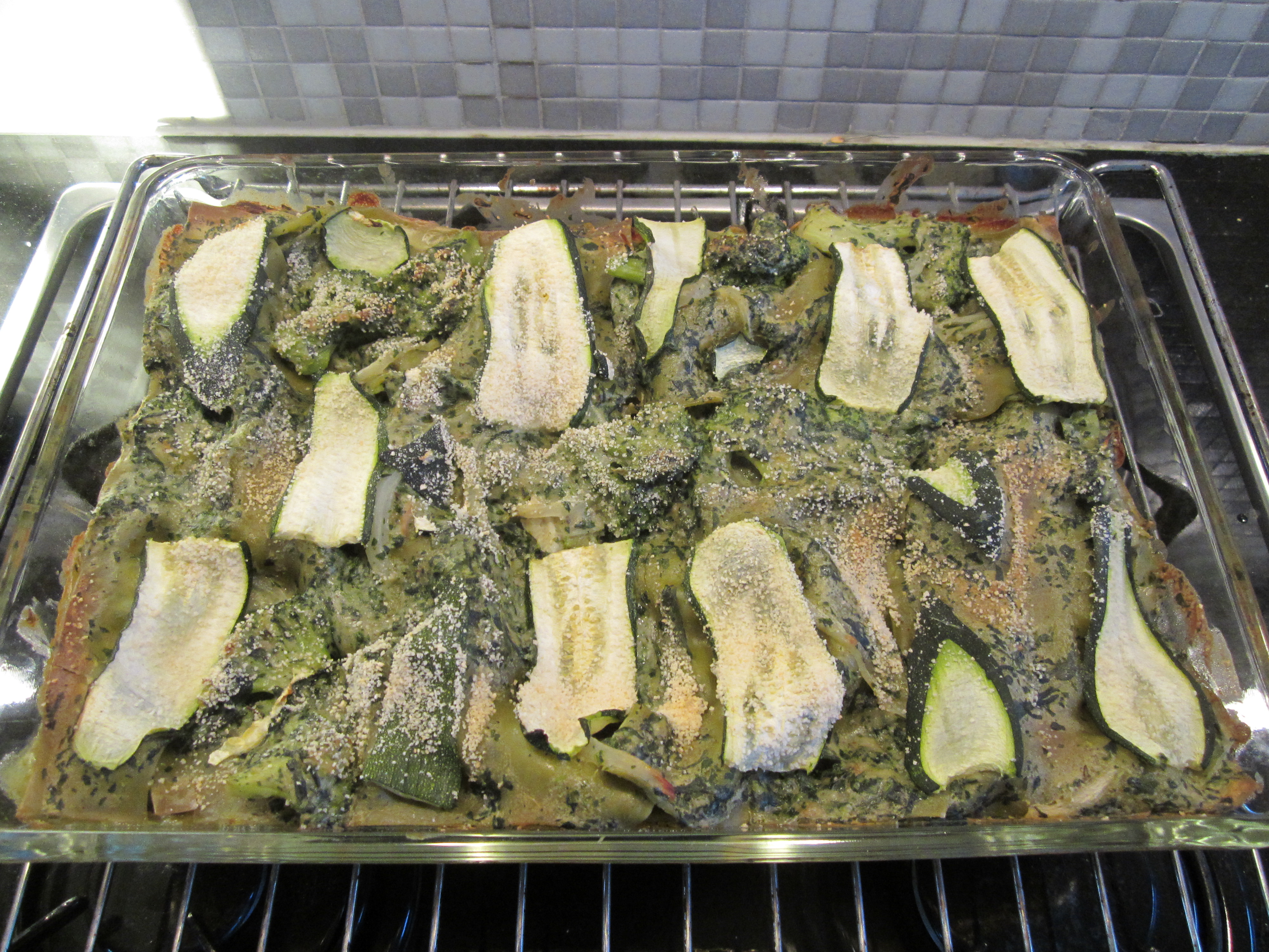 Legg saus, lasagneplater og skivet squash lagvis i en stor form. Jeg strødde noen spiseskjeer med griljermel på toppen.