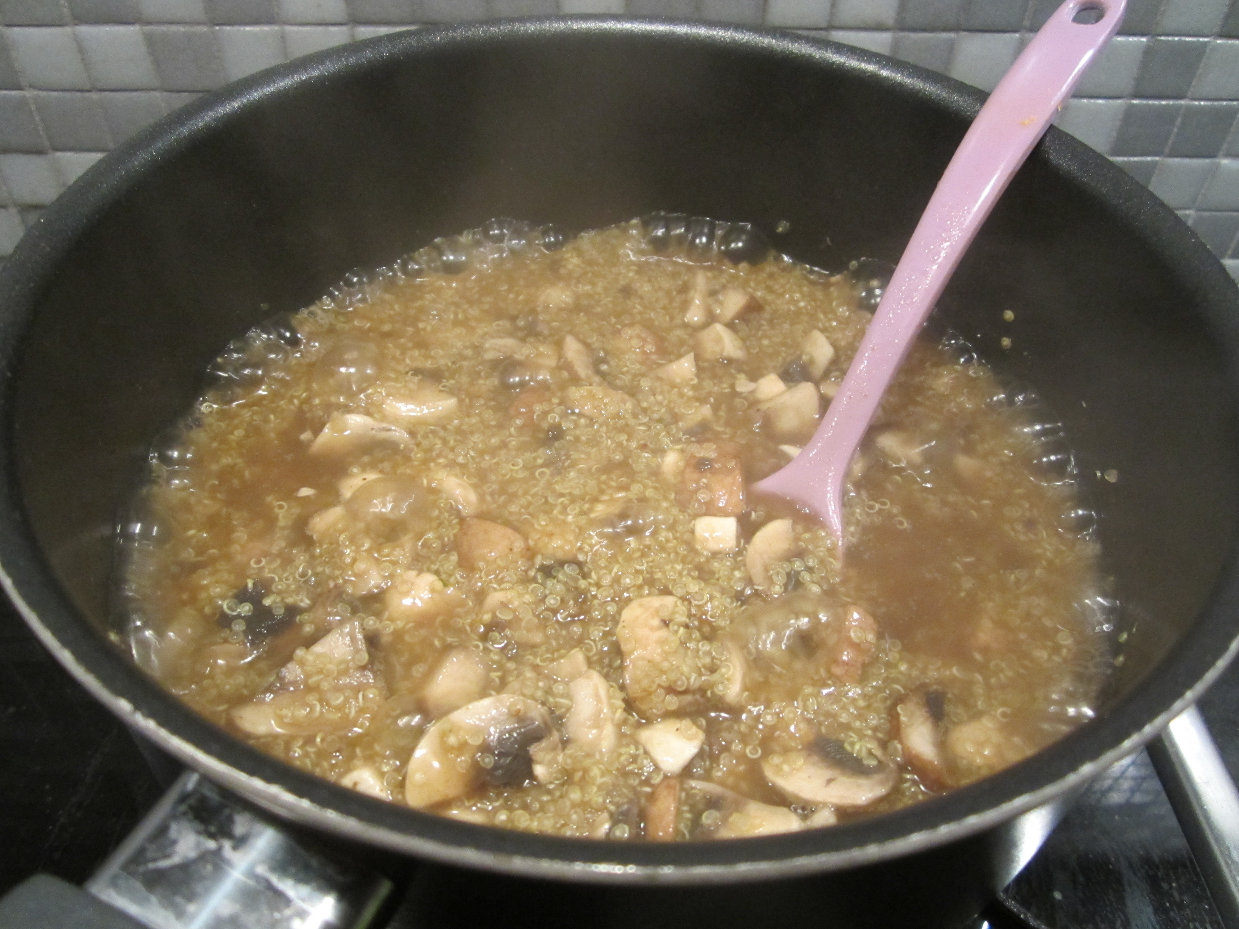 Bland ut buljong og krydder i en halvliter vann. Kok opp. Skyll quinoaen godt og ha oppi gryten. La det småputre på komfyren i 15-20 minutter under lokk. Når det er 5 minutter eller så igjen av koketiden, tilsett soppen og la blandingen koke ut til vannet er absorbert.