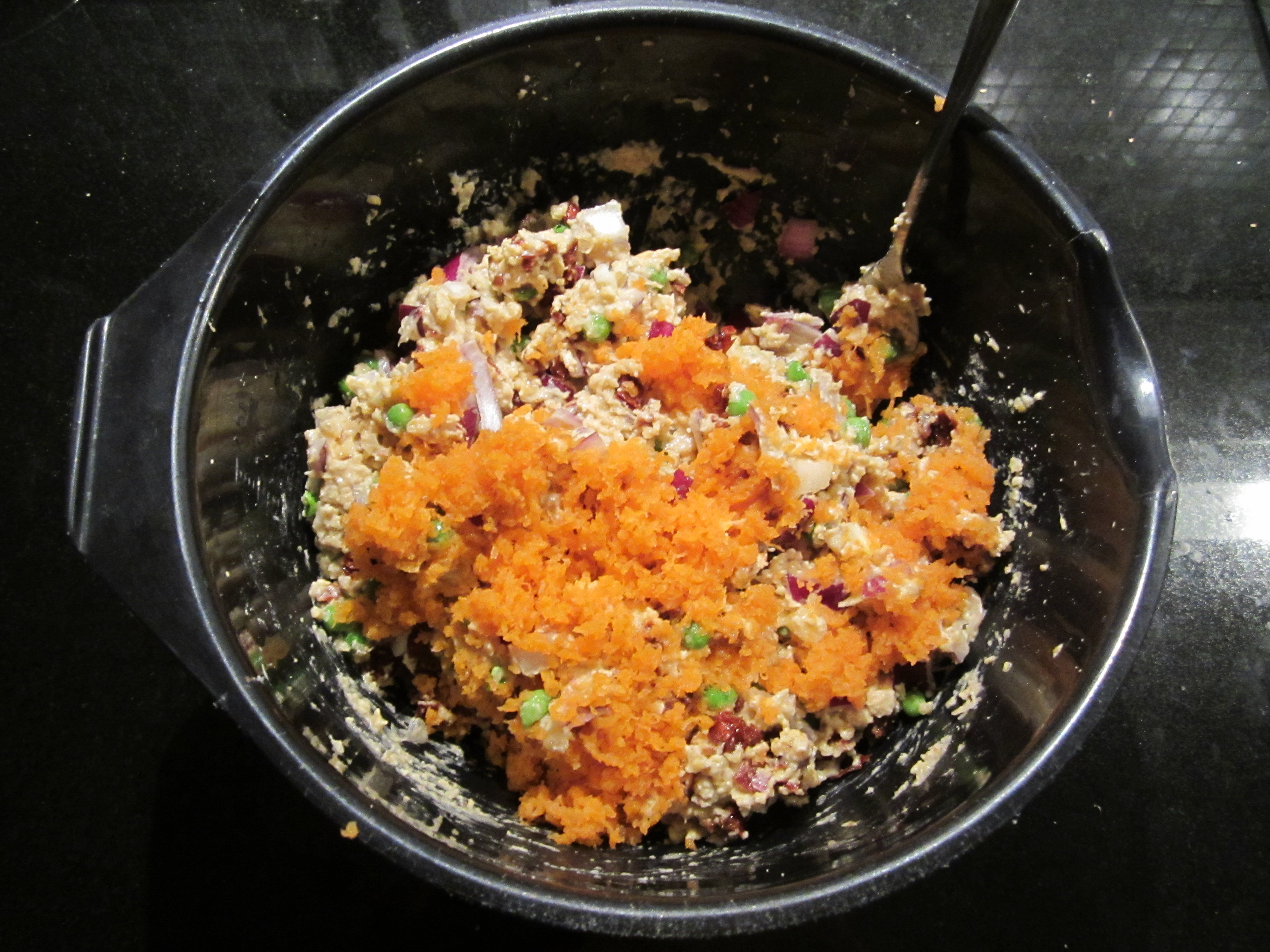 Start med å ha kikerter, havregryn i en bolle med 2 dl vann. Mos med stavmikser til det nesten er en helt jevn masse. Ha så oppi erter, soltørket tomat, løk og gulrot.