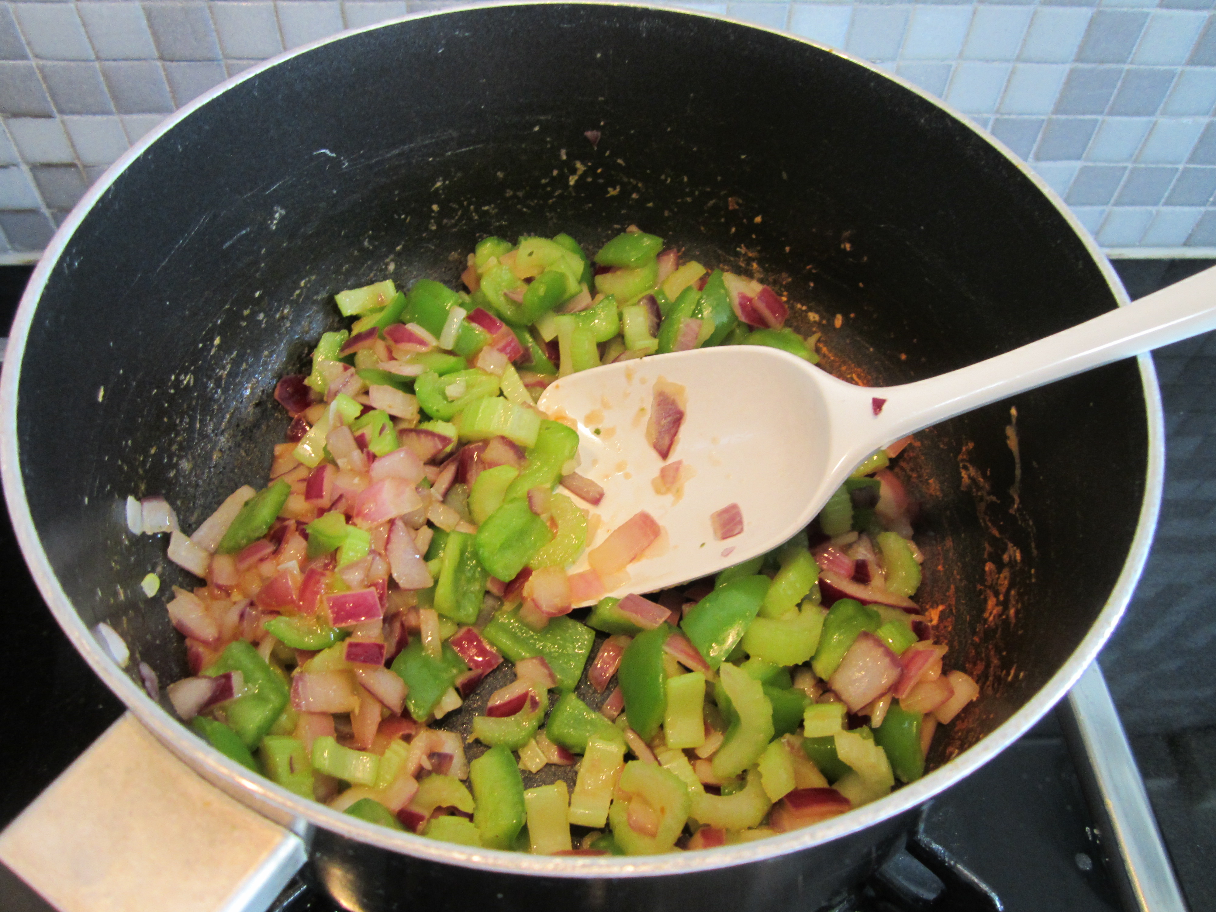 Kok opp 1/2 dl vann og bland ut buljongpulver og revet hvitløk. Kutt paprika og løk i fine biter, og sellerien i tynne skiver. Ha i gryten og la det koke noen minutter under omrøring, til vannet er mer eller mindre absorbert.
