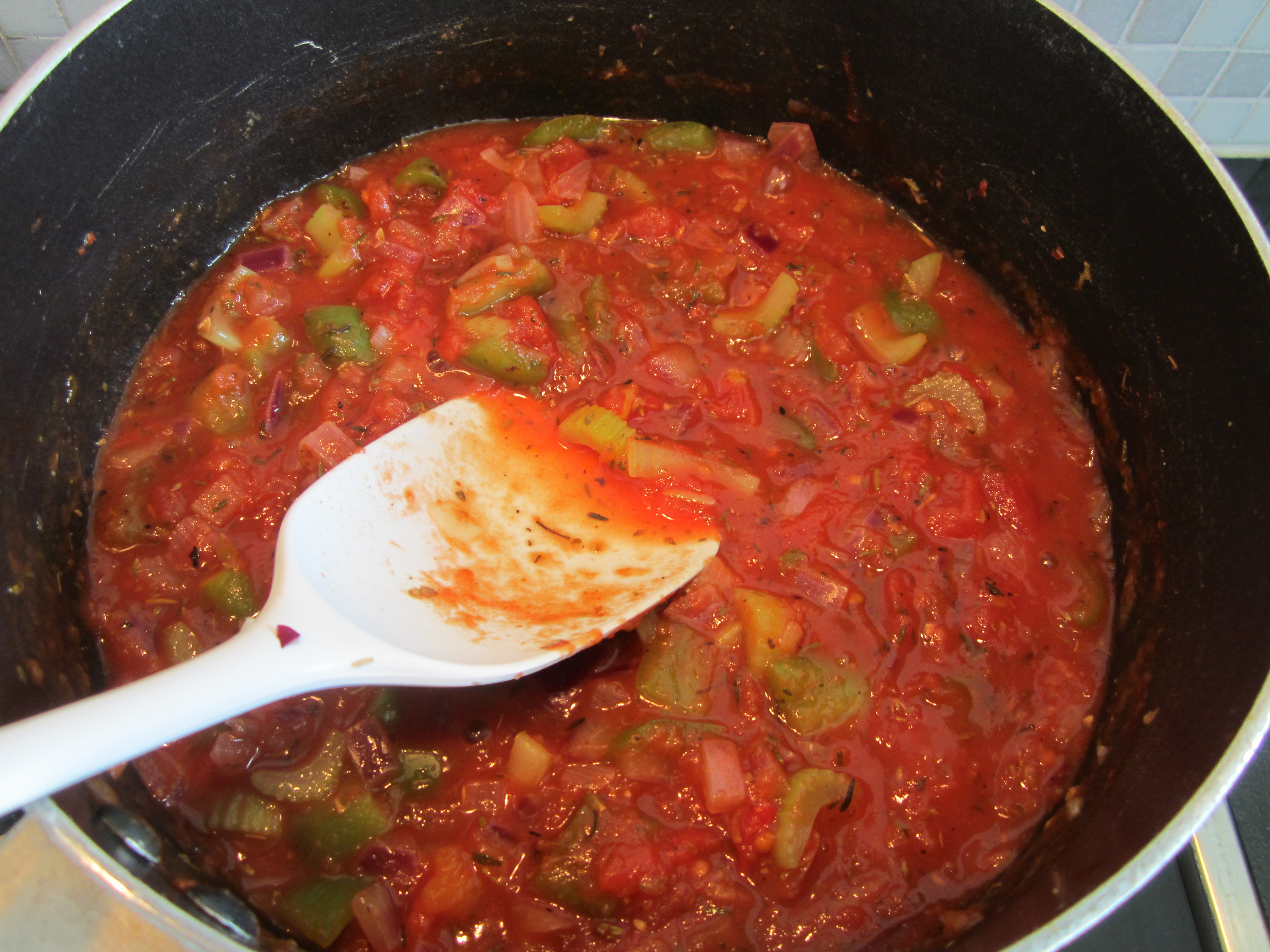 Ha hakket tomat, en desiliter vann samt krydderne i gryten. Kok opp og la det småputre i en 20 minutters tid over middels varme. Rør om av og til.