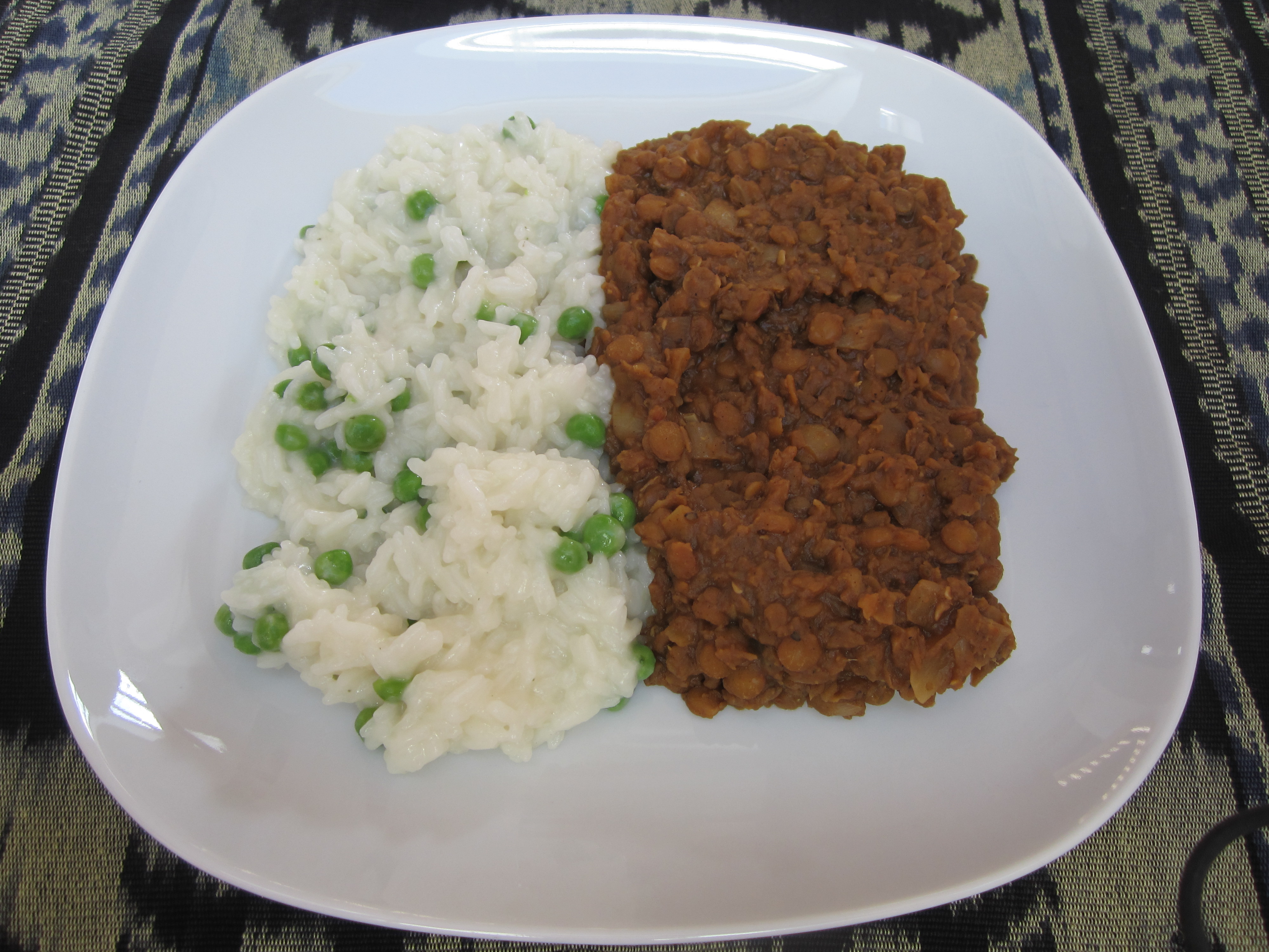 Lag i mens risen. Bland ut 2 ts buljongpulver og hvitløk med en boks kokosmelk og 4 dl vann. Ha i risen og la det koke ca 20 minutter, eller til risen er ferdig. Cirka halvveis tilsatte jeg ertene, som jeg hadde tint på forhånd.