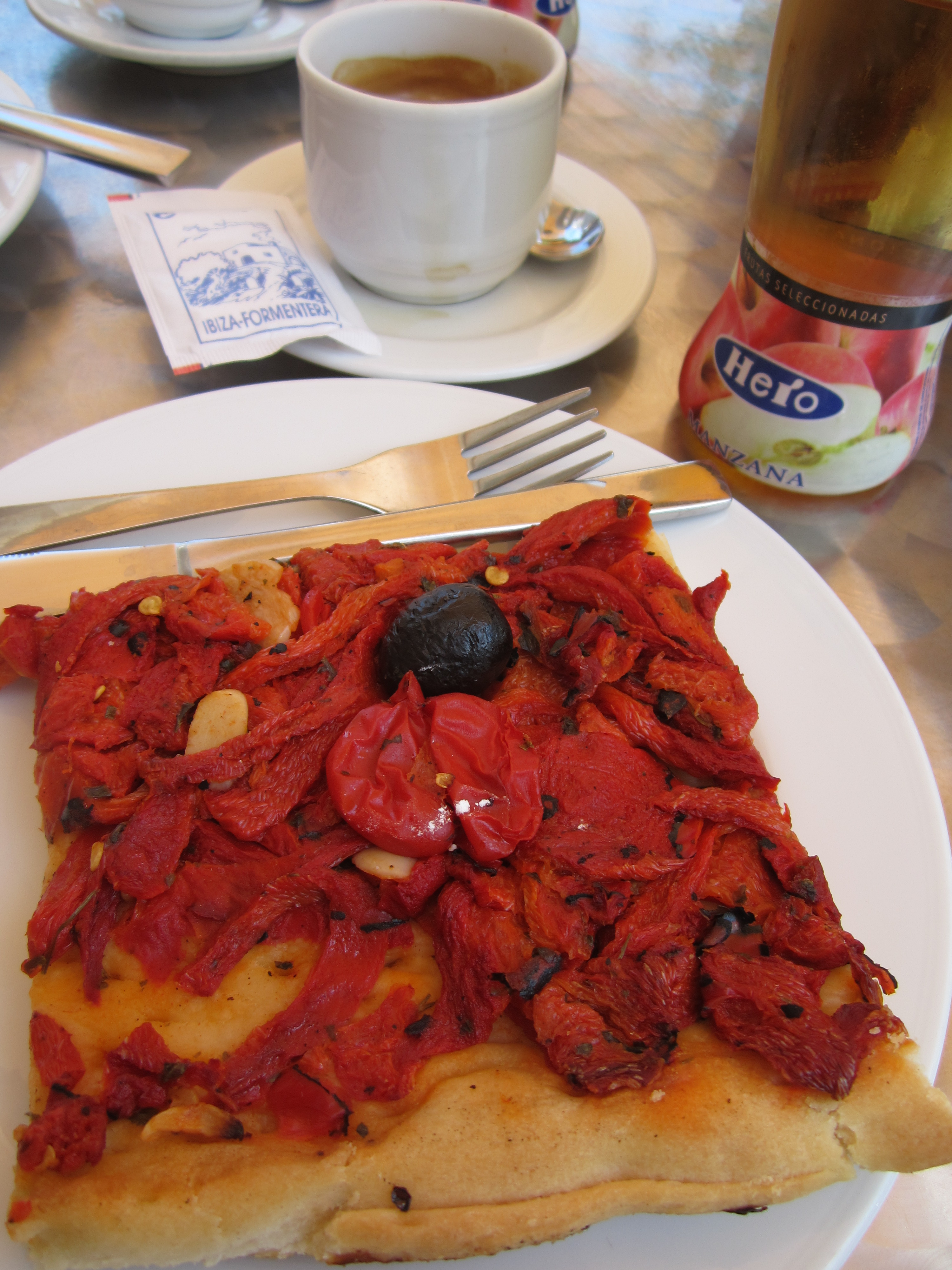 I Ibiza by var jeg på bakeri og spiste trozo coca pimiento, altså et stykke av en slags paprikapizza. Spansk pizza er fullstendig vegan, ingen ost der. Forskjellen fra vanlig pizza er at selve bunnen er mer luftig og brødaktig enn tradisjonell bunn.