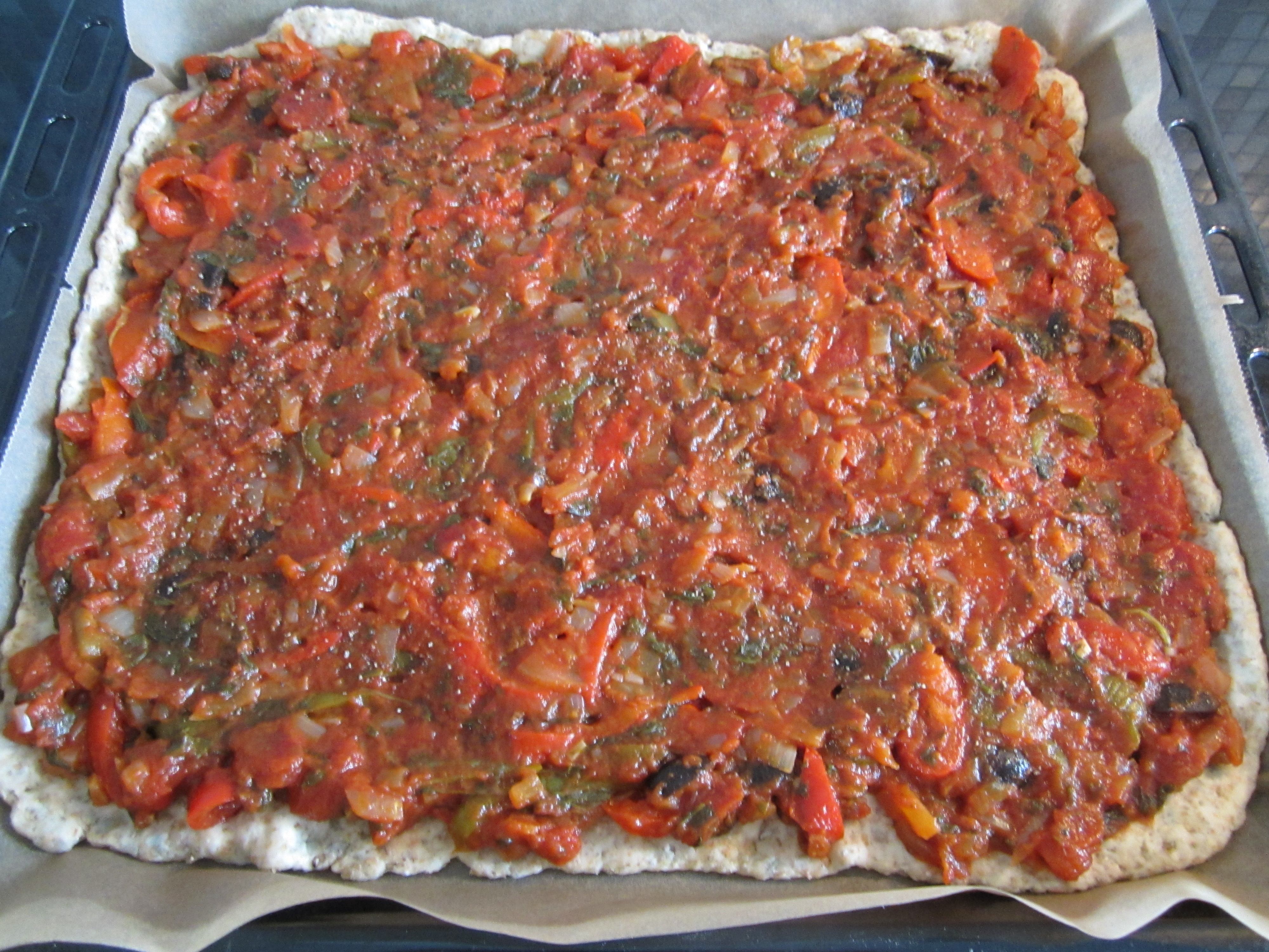 For å gjenskape smaksopplevelsen her hjemme har jeg tatt utgangspunkt i en oppskrift fra Den store vegetariske kokeboken, utgitt i 1999. Boken har stått i bokhyllen i alle mine hjem over en årrekke og er blitt mye brukt gjennom tidene. Den originale oppskriften baserer seg på bokstomat rett på pizzaen, noe jeg frykter kan bli litt soggy. Jeg ville også ha massevis av god paprika på, så jeg laget en egen versjon av sausen som jeg lot putre på komfyren lenge, for å redusere den skikkelig.