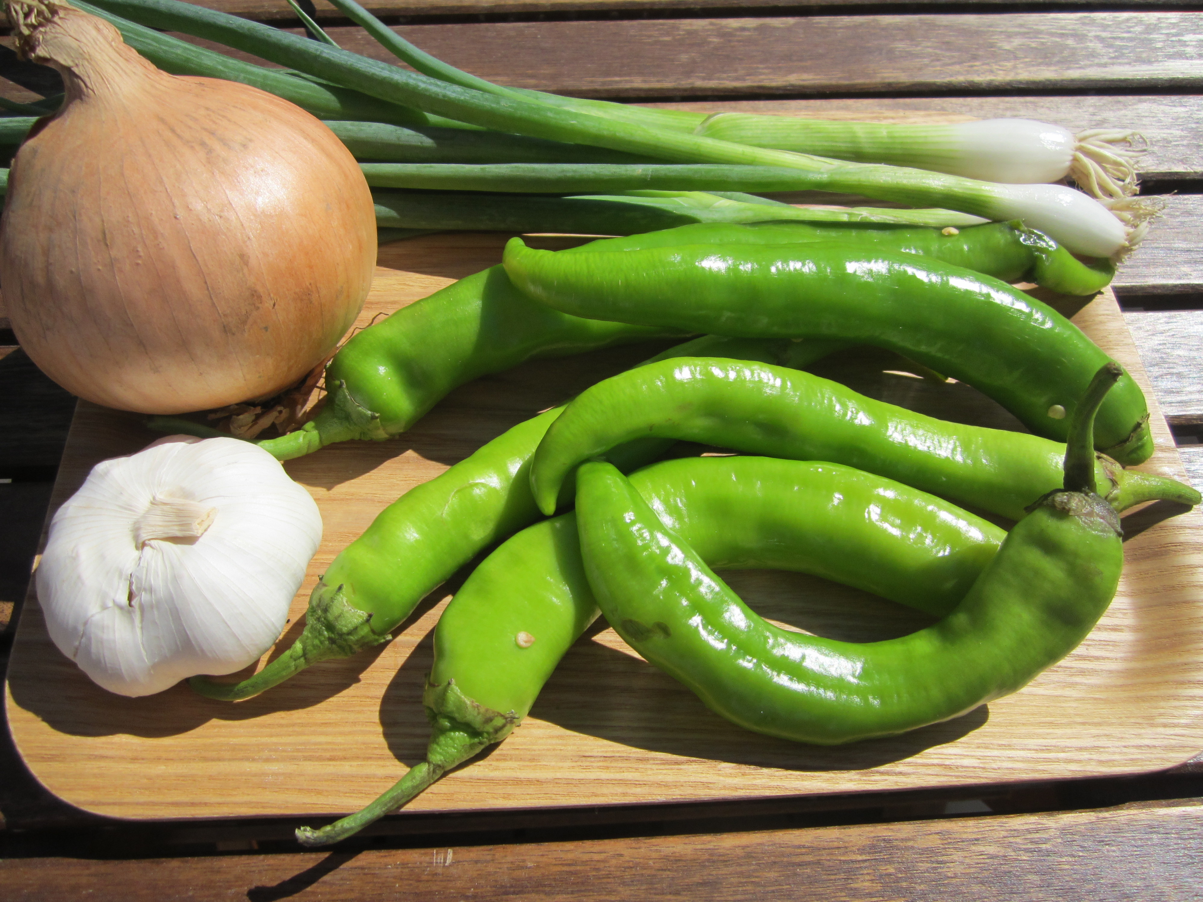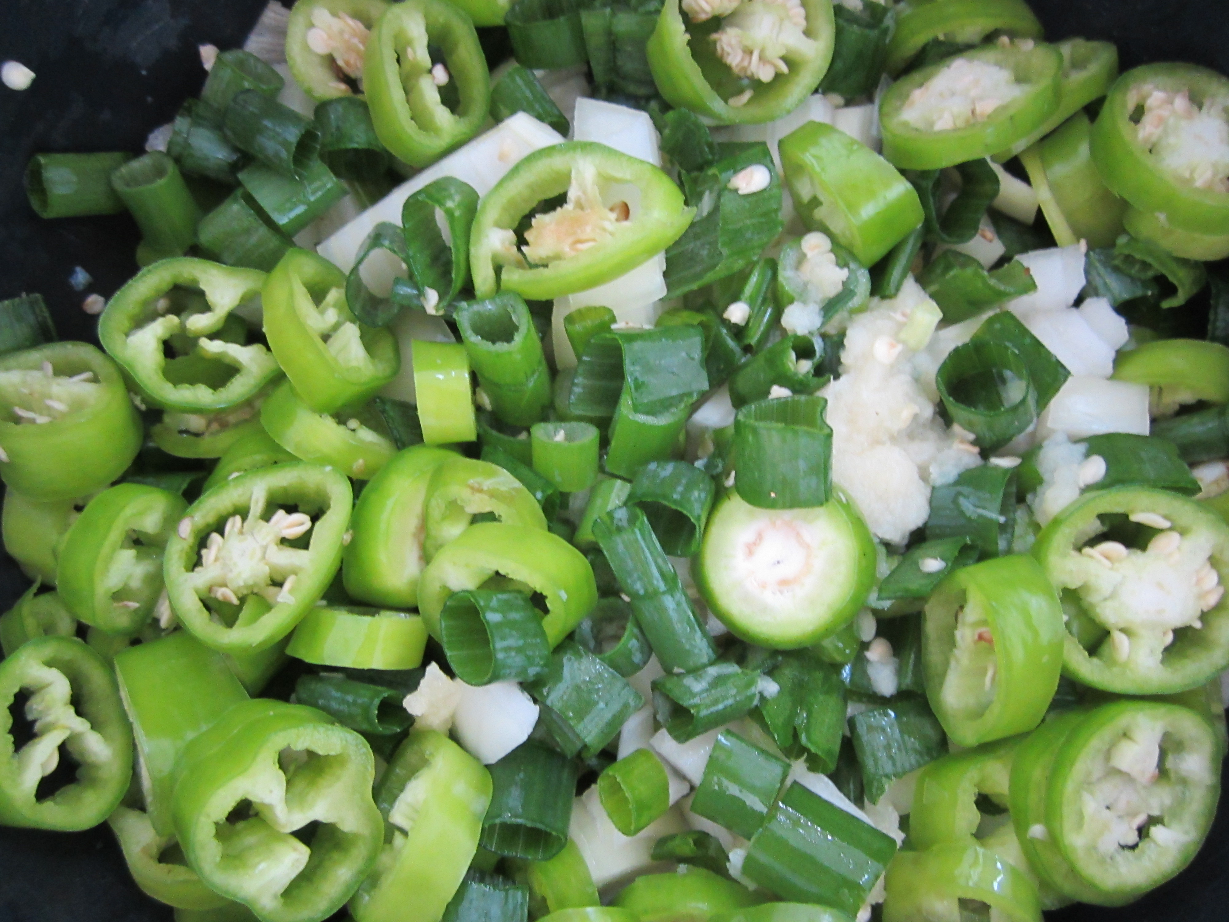 Grovhakk chiliene, løk og hvitløk. Jeg skar vårløken i skiver, med litt av det grønne.