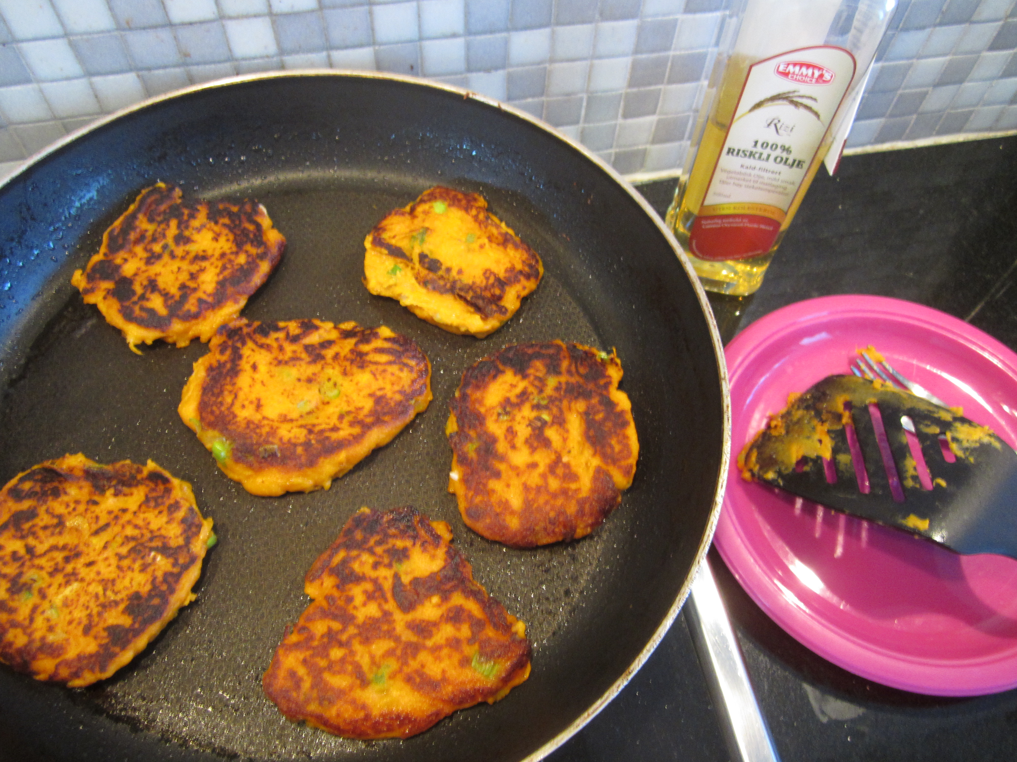 Første oppskrift ut er søtpotetkaker, modifisert etter en oppskrift fra en populær cafe i