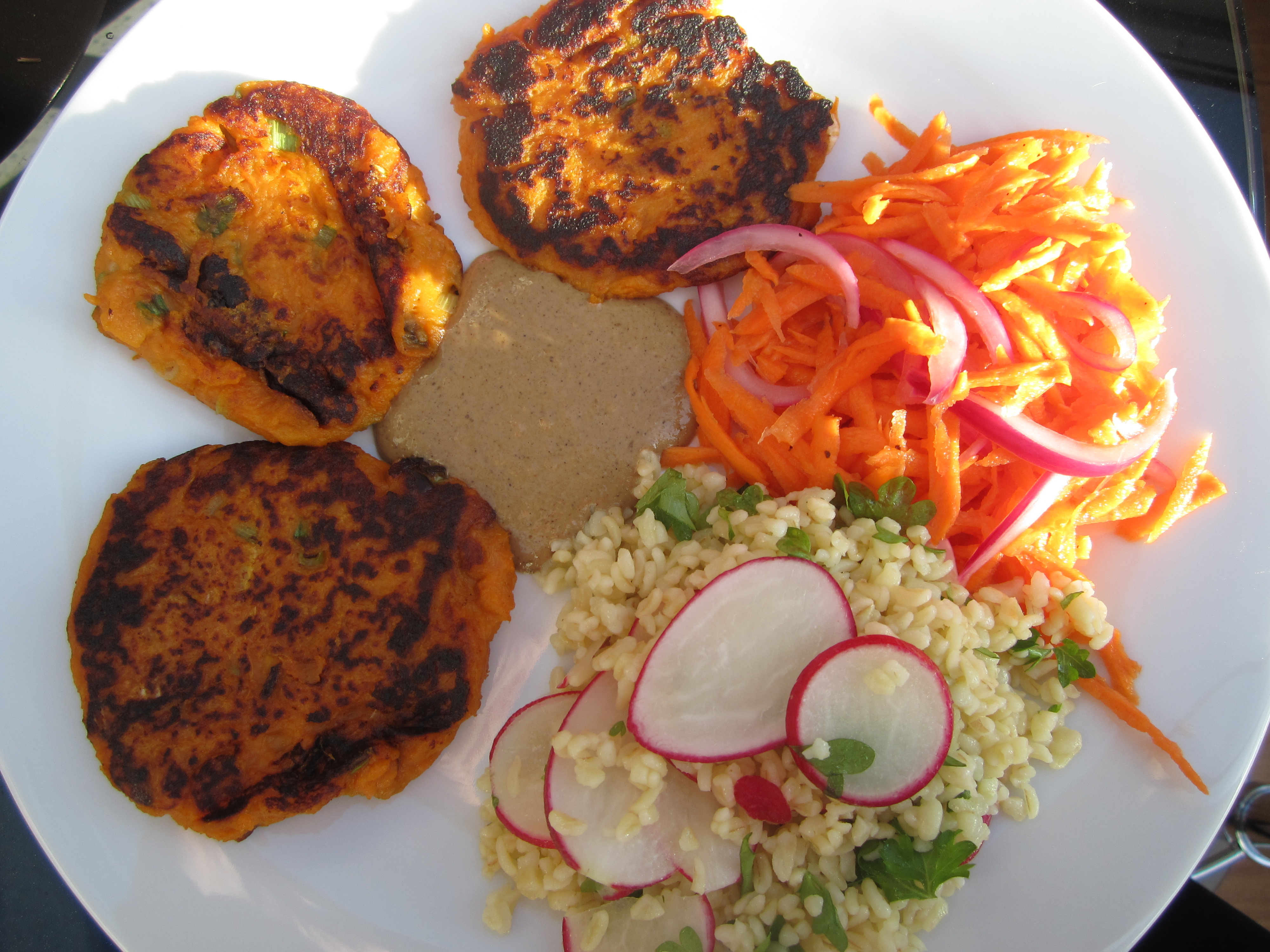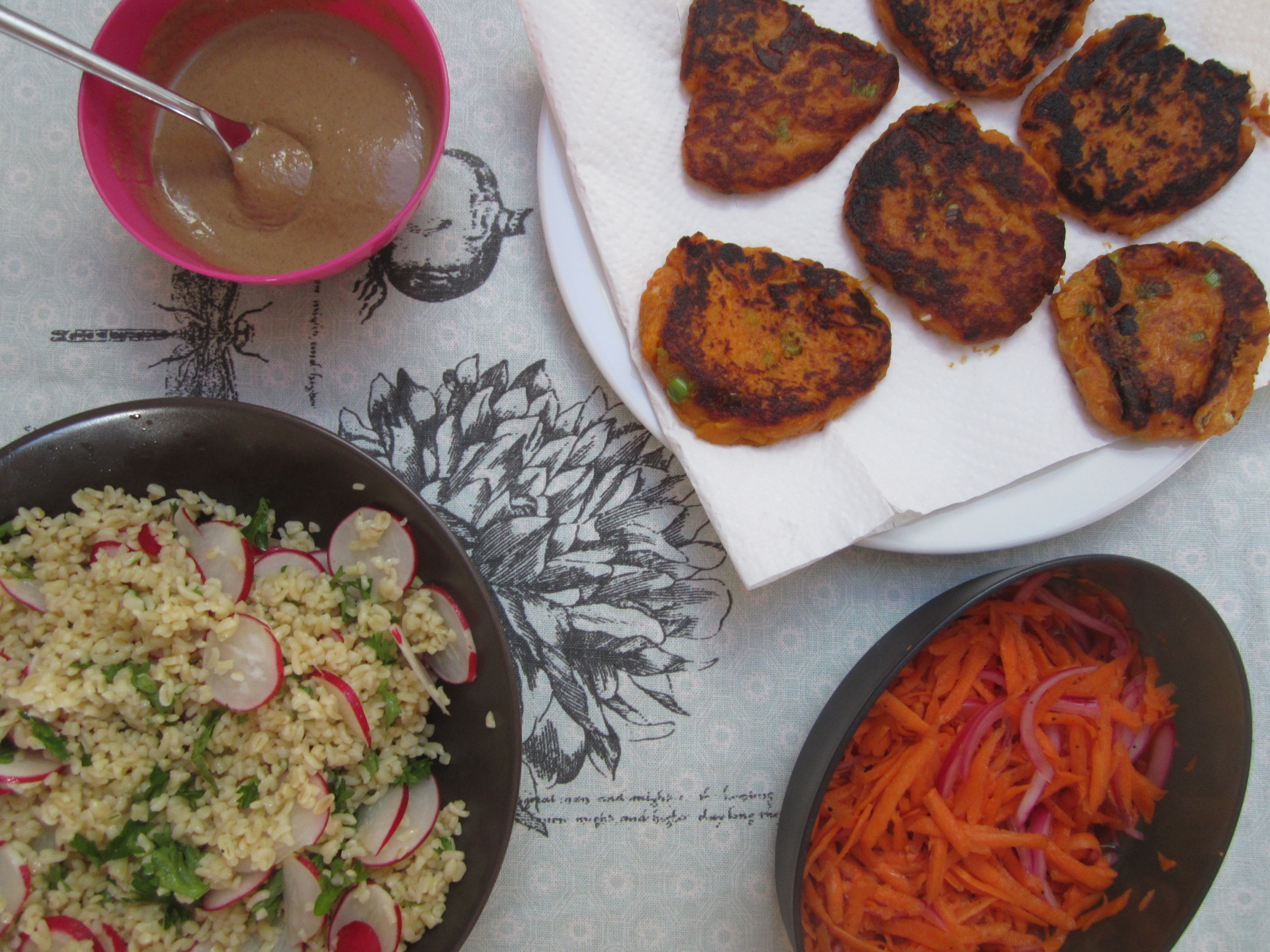 Jeg serverte kakene med en tabbouleh, råkost og en enkel dressing.