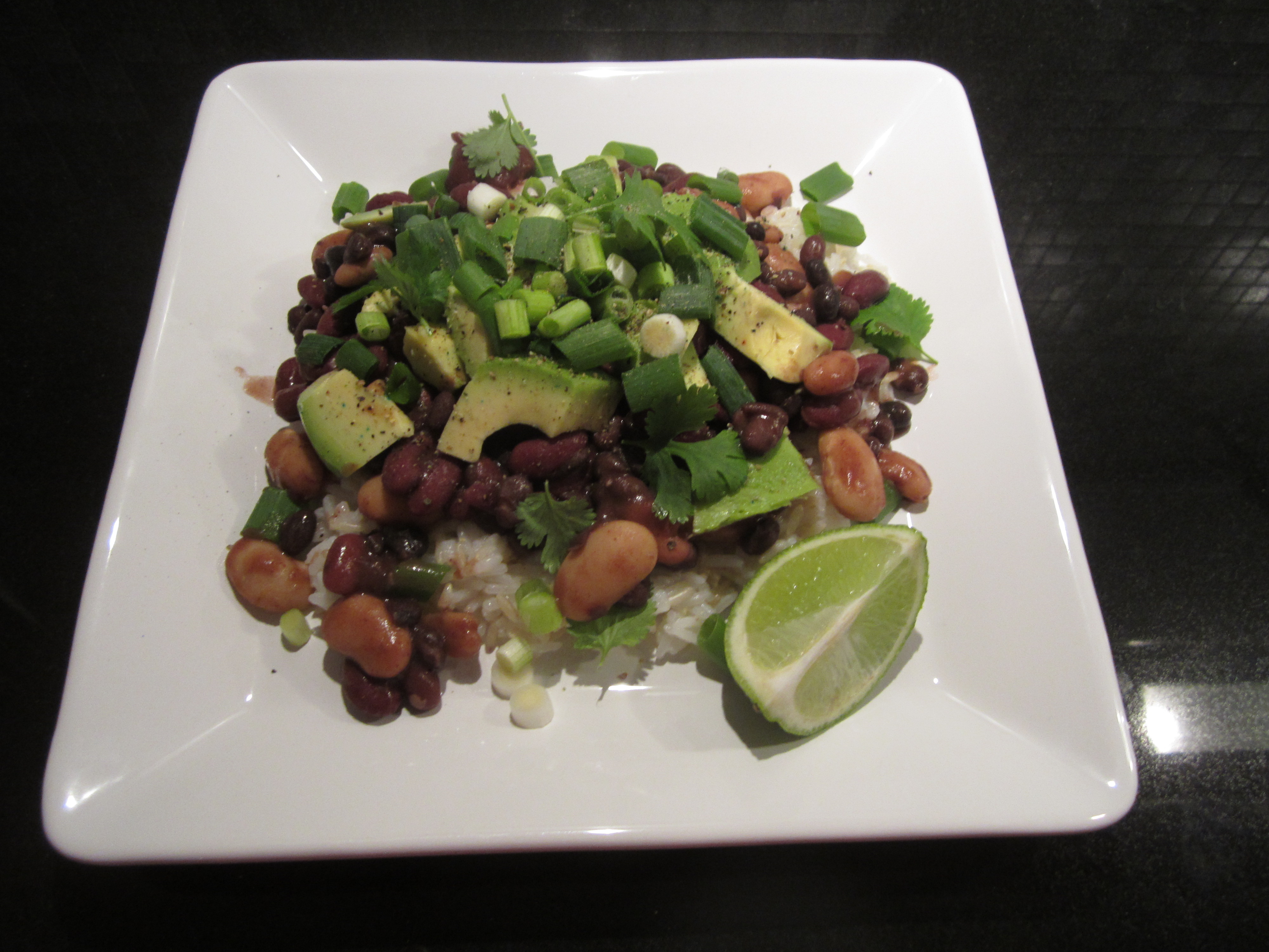 Dander ris og bønner på tallerken og topp med store biter avokado og hakket vårløk, samt koriander, lime og litt nykvernet pepper. Jeg pleier sjelden selv å følge oppskrifter til punkt og prikke, og det er bare å variere retten etter eget ønske, men jeg anbefaler på det sterkeste å bruke koriander og lime i denne retten! De er essensielle for smaken og jeg tror retten kan bli litt kjedelig uten.