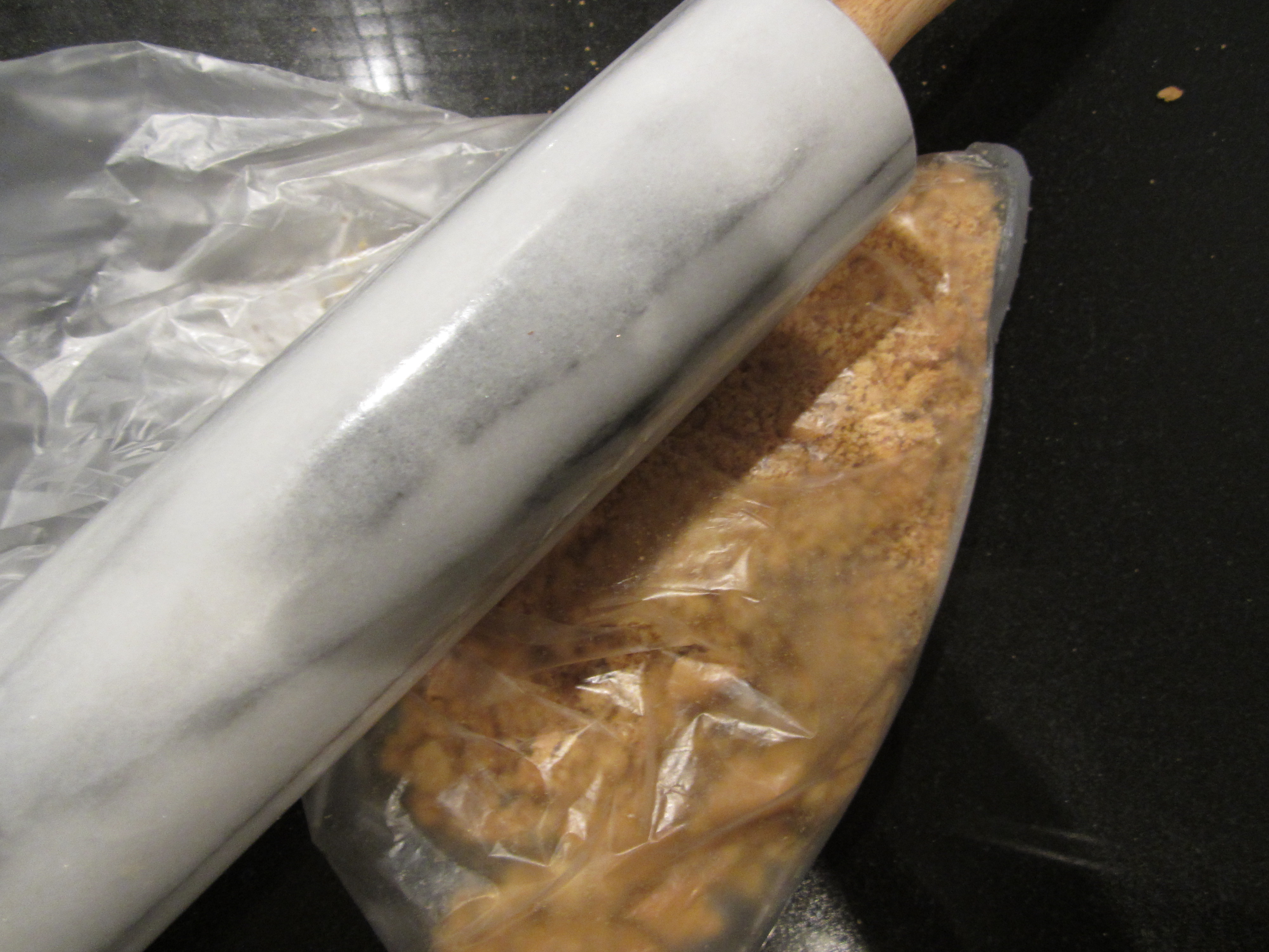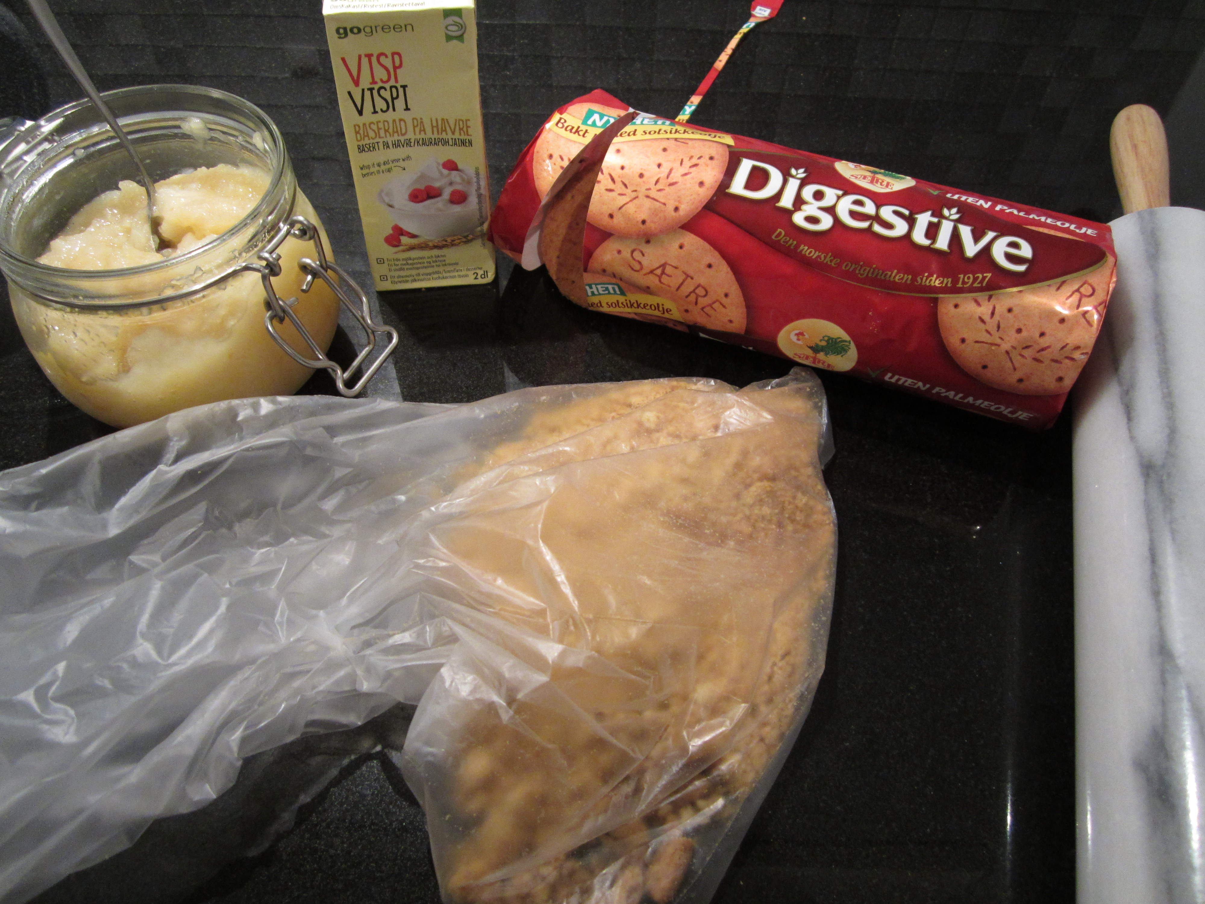Bruk 6-8 digestive. For å knuse de lettvint uten å spre for mye smuler legger jeg disse i en pose, og bruker deretter en kjevle til å knuse kjeksene. Ikke gjør de helt pulverisert, litt større biter er ok.
