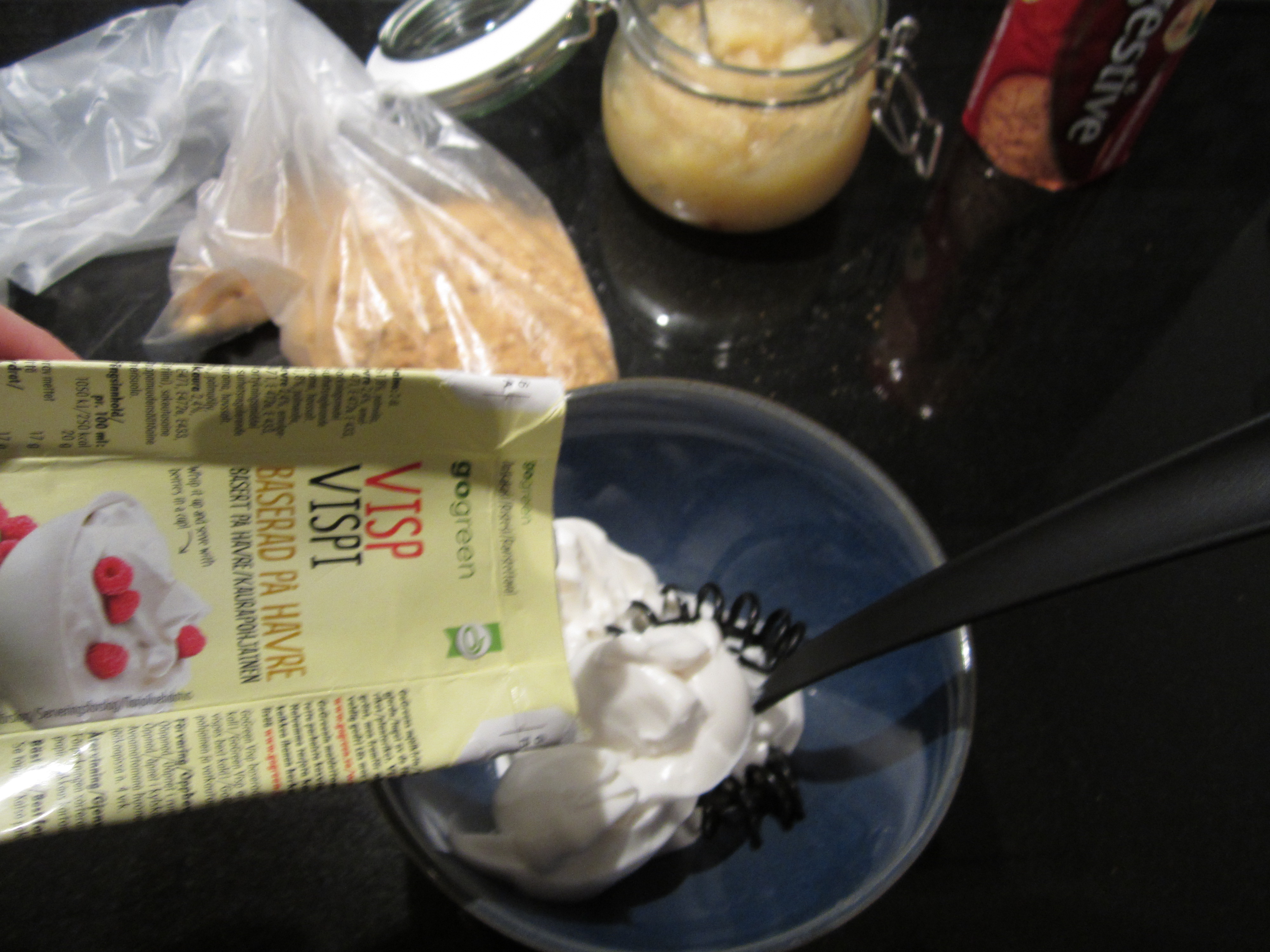 Dette er min lettvinte variant av tilslørte bondepiker i vegan versjon. Tilslørte bondepiker er tradisjonell norsk dessert laget av eplemos, pisket kremfløte og brunede brødsmuler eller knust kavring. Min vri inneholder eplemos, pisket havrefløte og knust digestive.