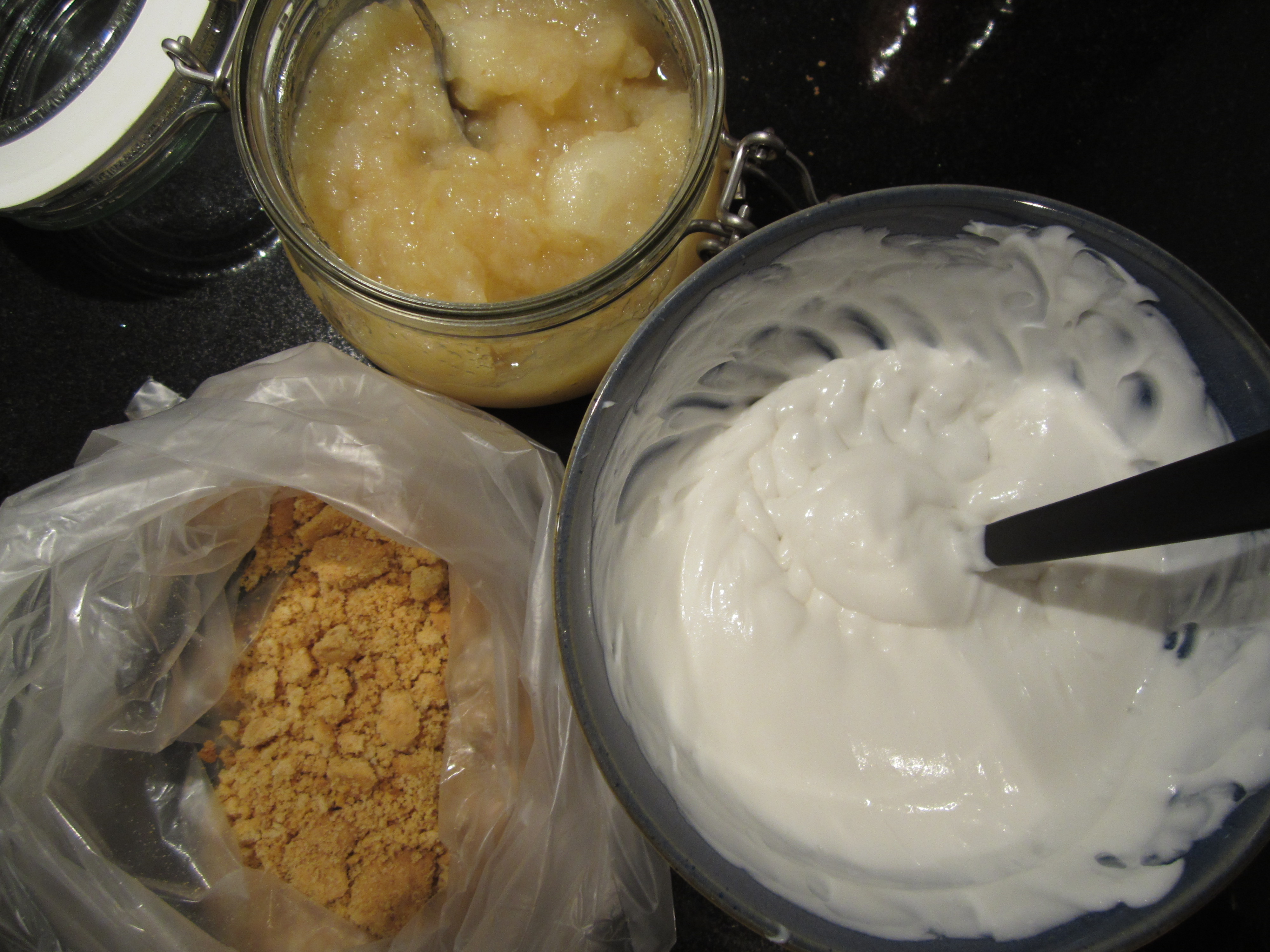 Fordel så eplemos, krem og knuste kjeks litt etter litt, eller lagvis.
