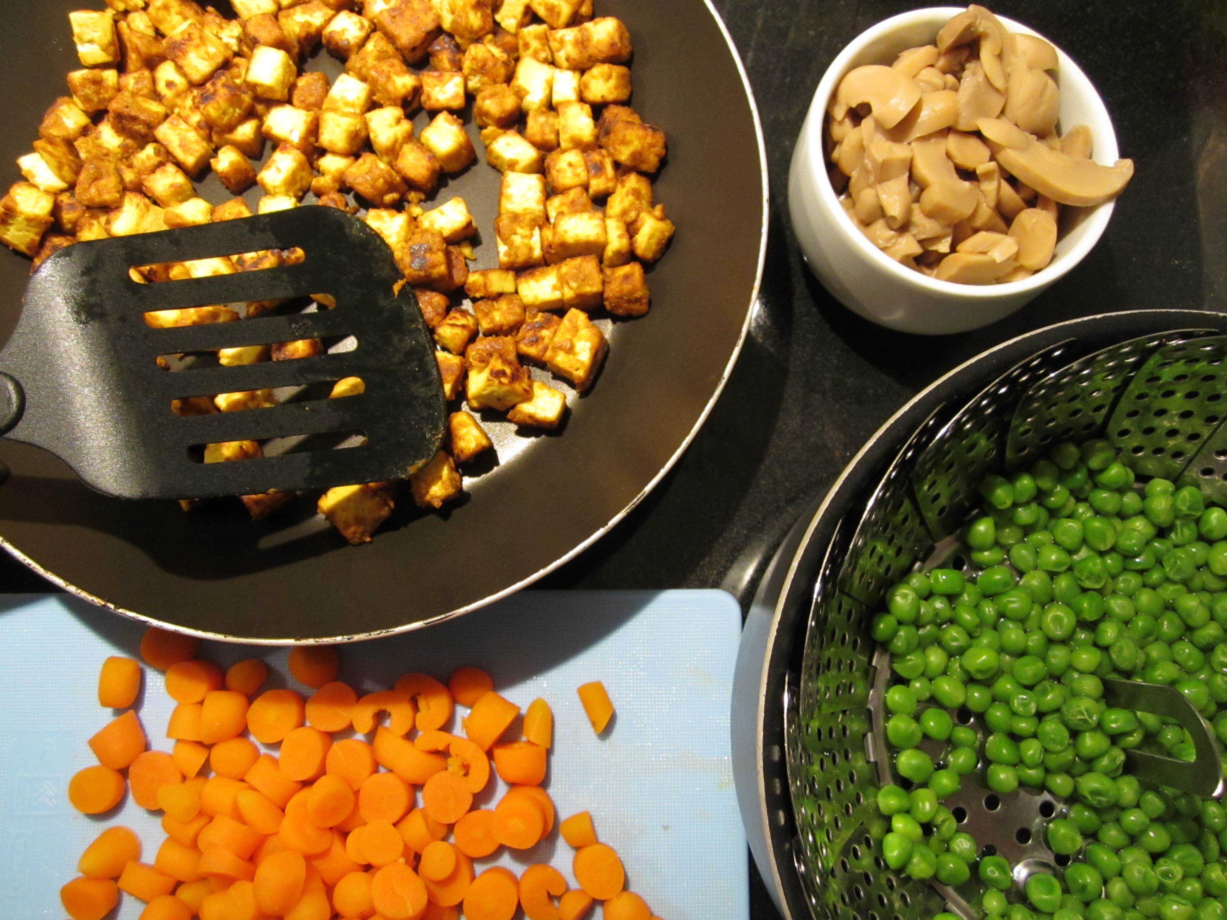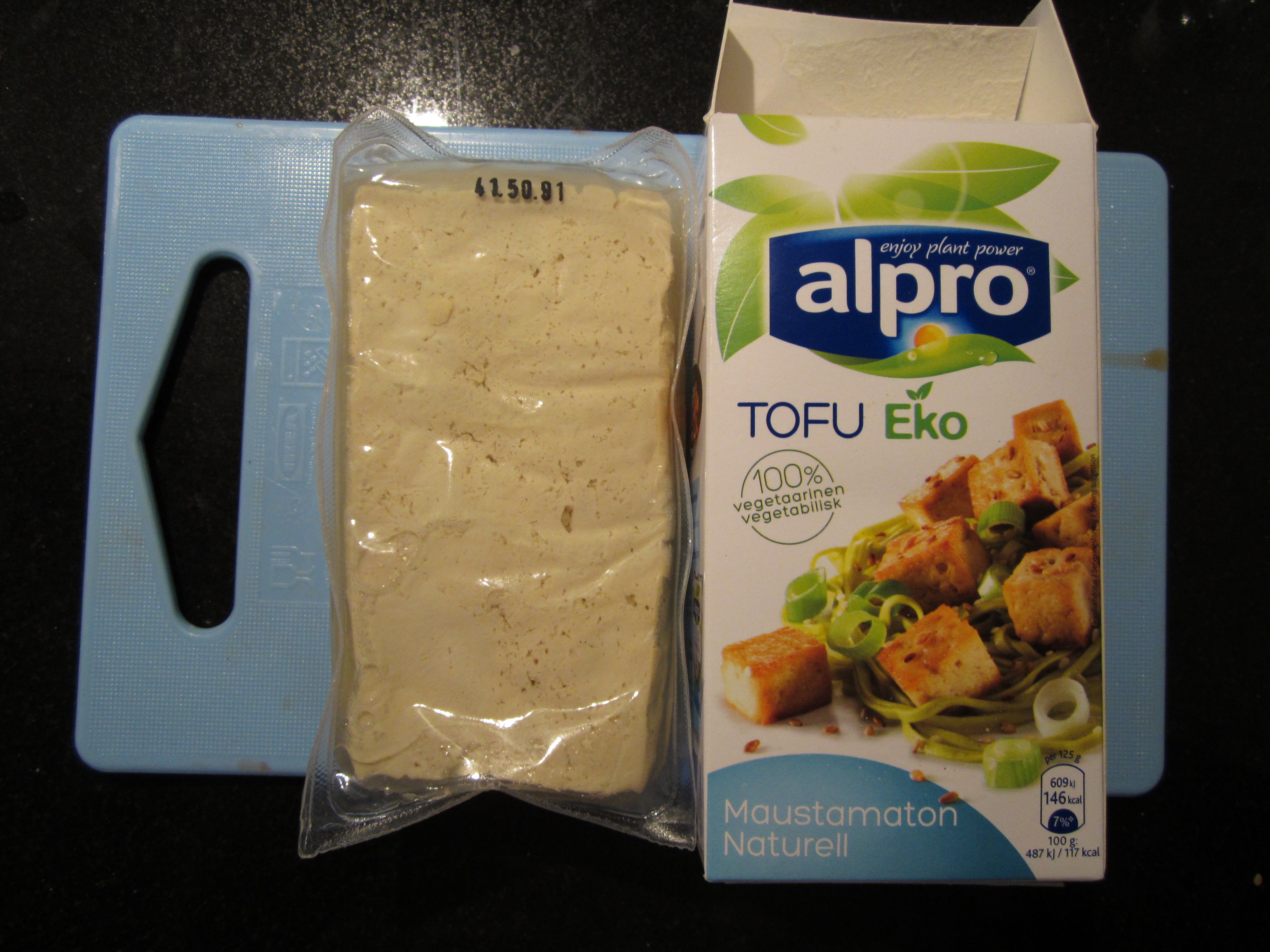 Jeg brukte tofu jeg hadde i fryseren og lot denne tine på kjøkkenbenken før tilberedning. Tofuen blir enda fastere etter å ha vært frossen og egner seg derfor godt når det er en fordel at tofuen beholder formen.