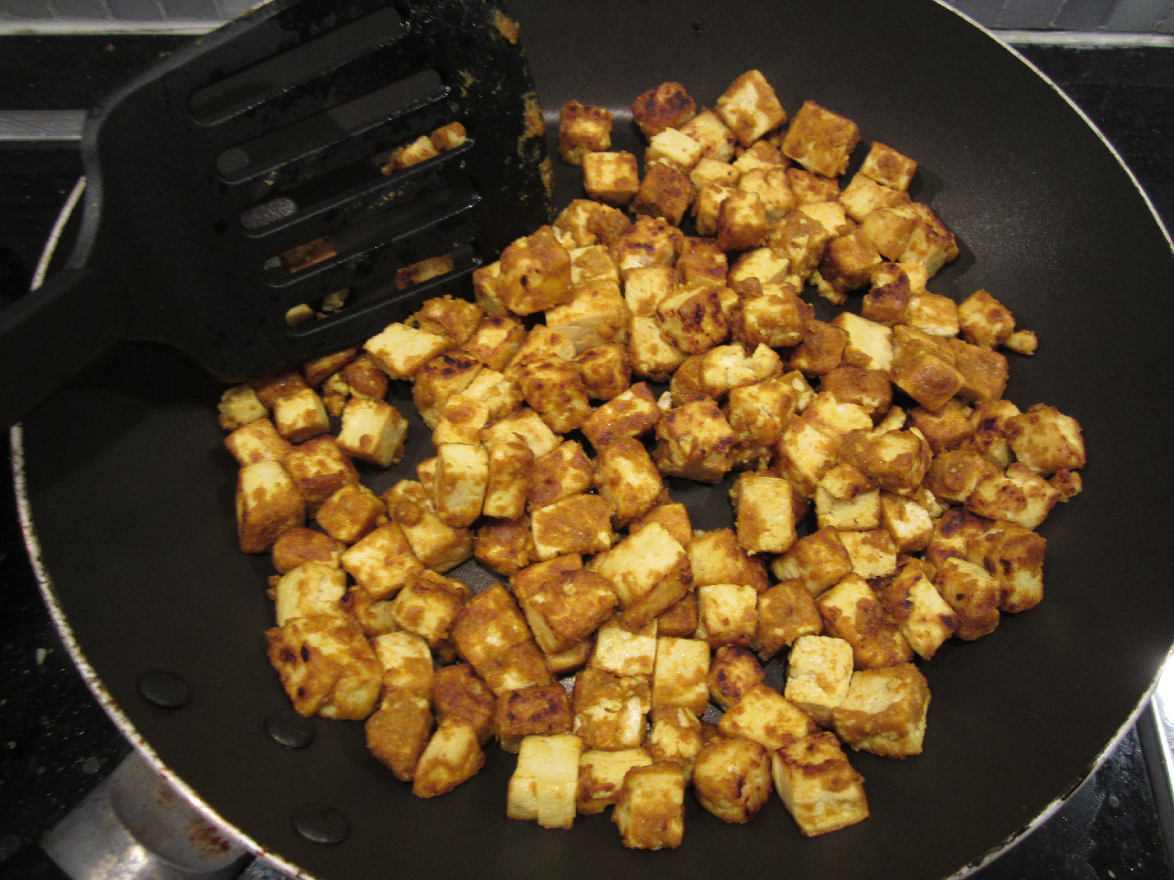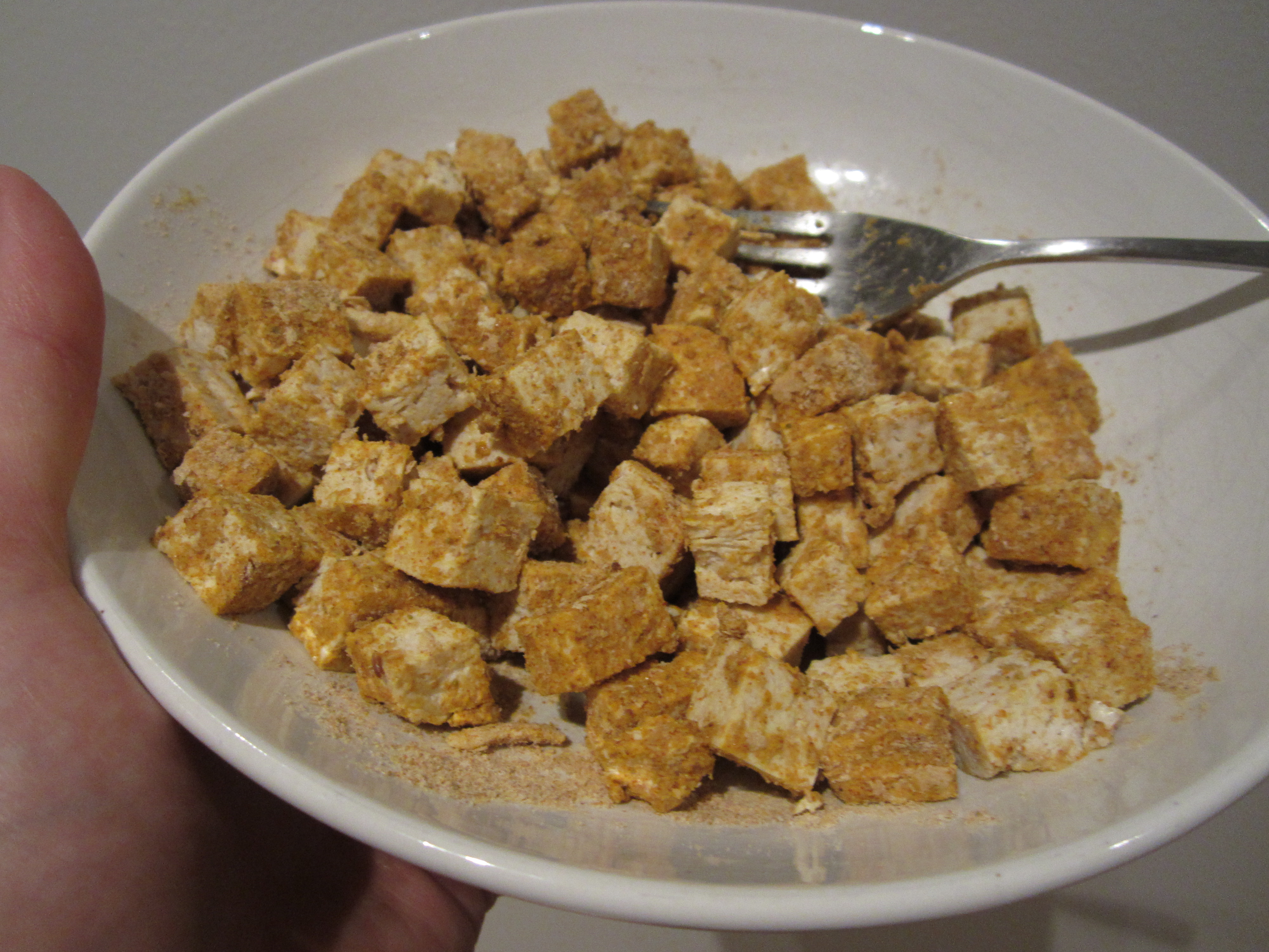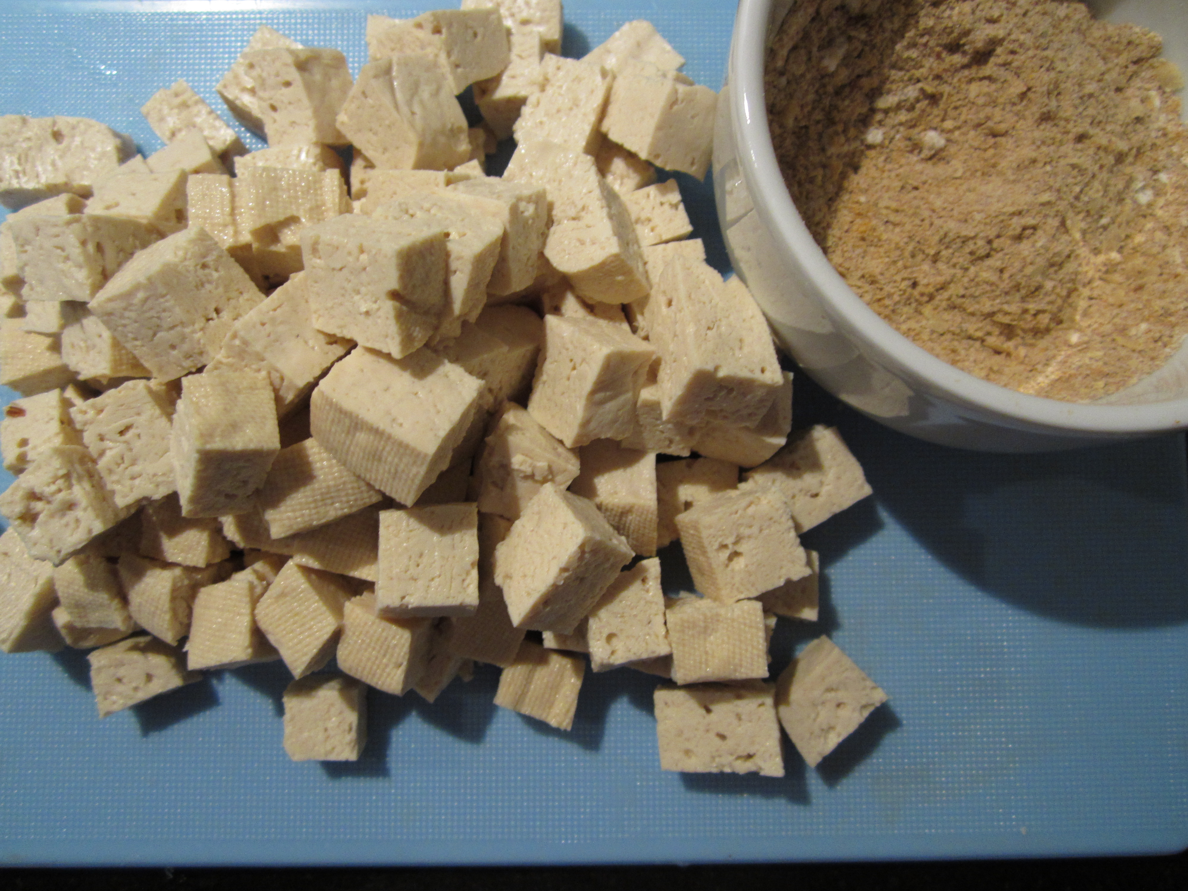 Bruk en fast type tofu. Klem ut vannet av tofuen så godt det lar seg gjøre. Del den så i små terninger. Bland mel, engevita og krydder i en liten skål, og bland godt inn i tofuterningene. Tofuen stekes så i noen minutter til den begynner å bli litt brun i kantene.