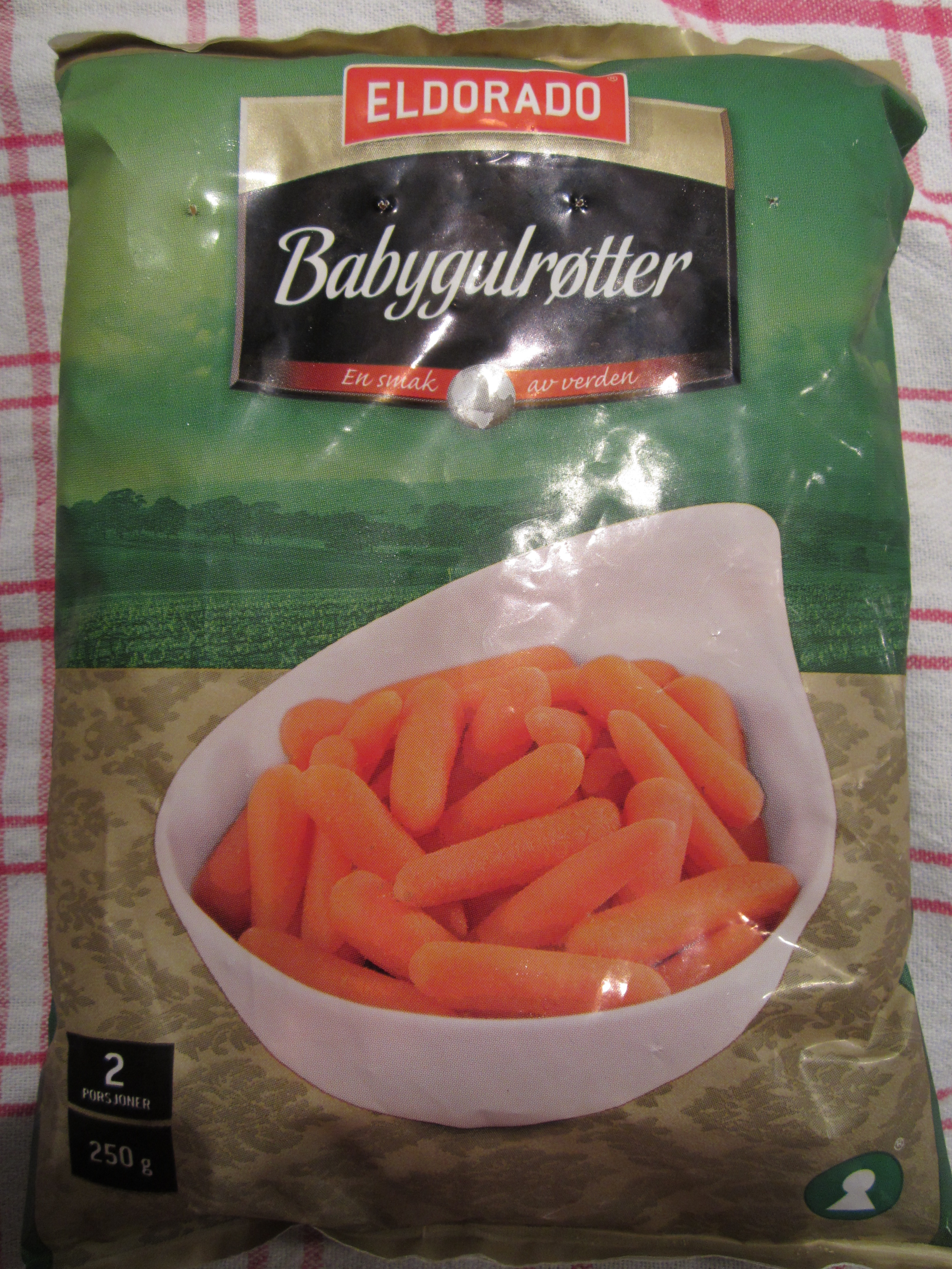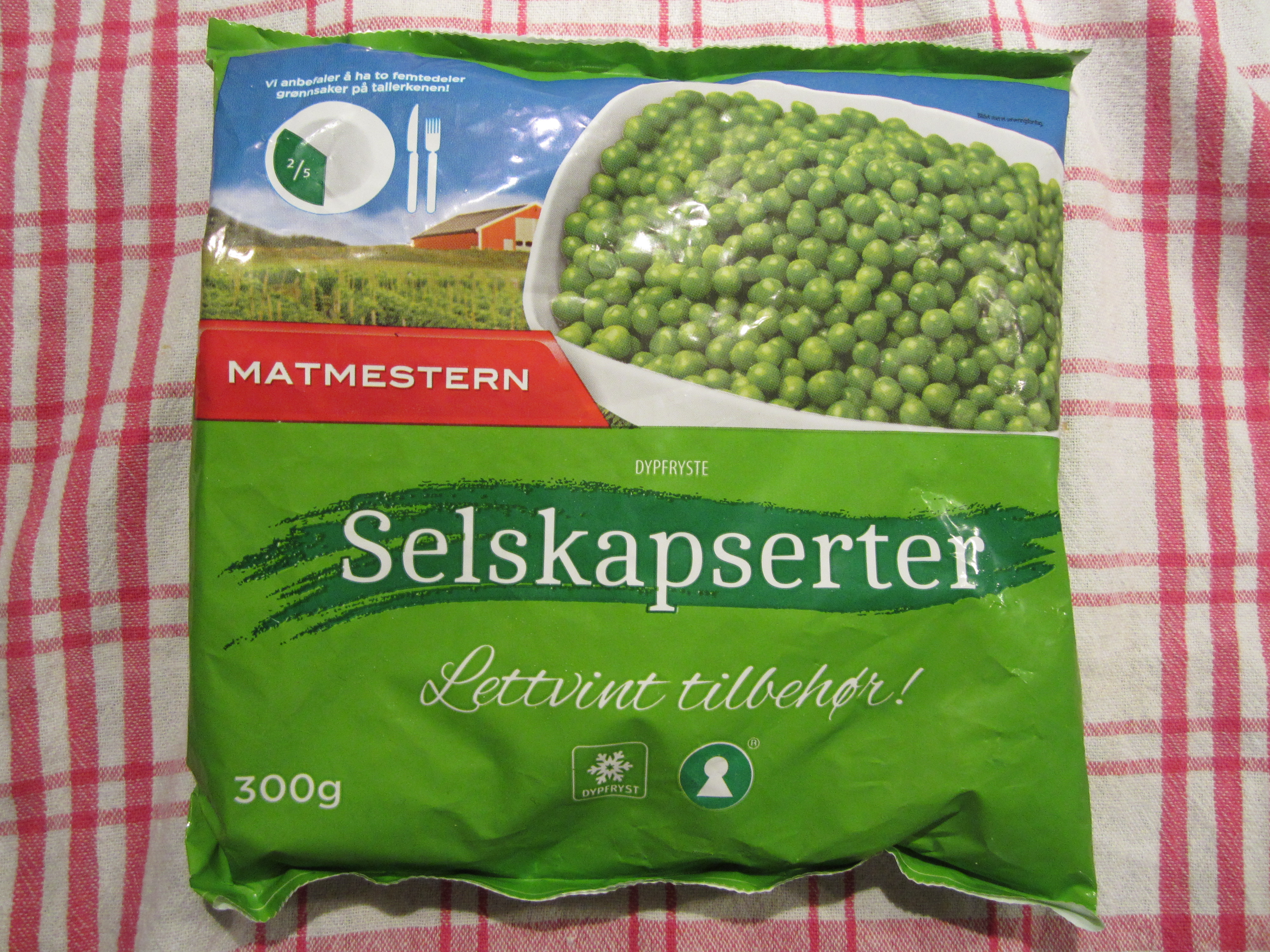 Av grønnsaker brukte jeg frosne erter og babygulrøtter, og en boks hermetisk sjampinjong. Sjampinjong på boks har en helt annen konsistens enn vanlig sopp, men jeg syns det gjør seg i denne oppskriften. Det minner litt om sjømat som blåskjell eller reker ved at det er litt svampete, i mangel av bedre ord.