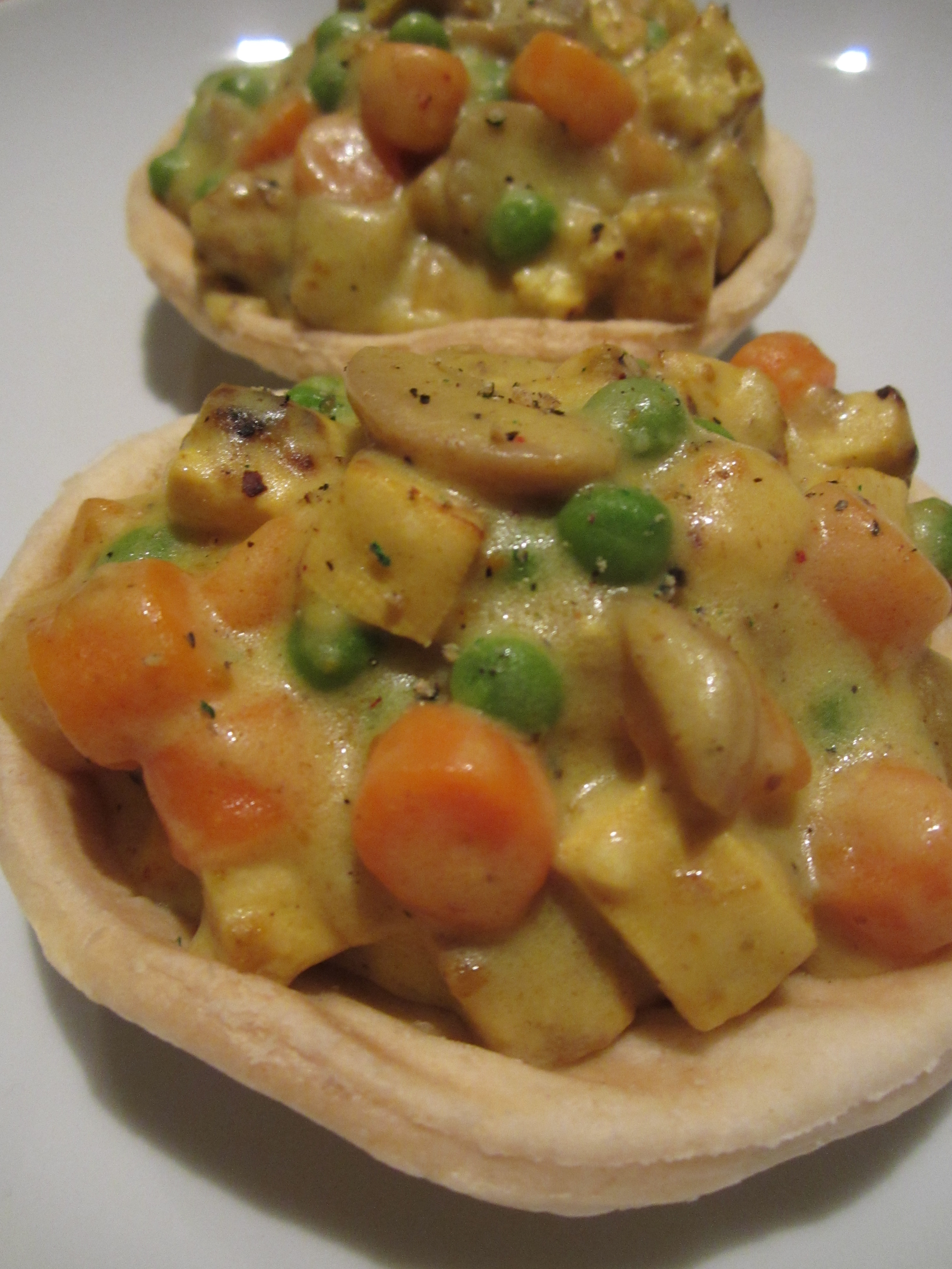 Bland så inn krydret tofu og grønnsaker i sausen. Fordel deretter fyllet i terteskjell.