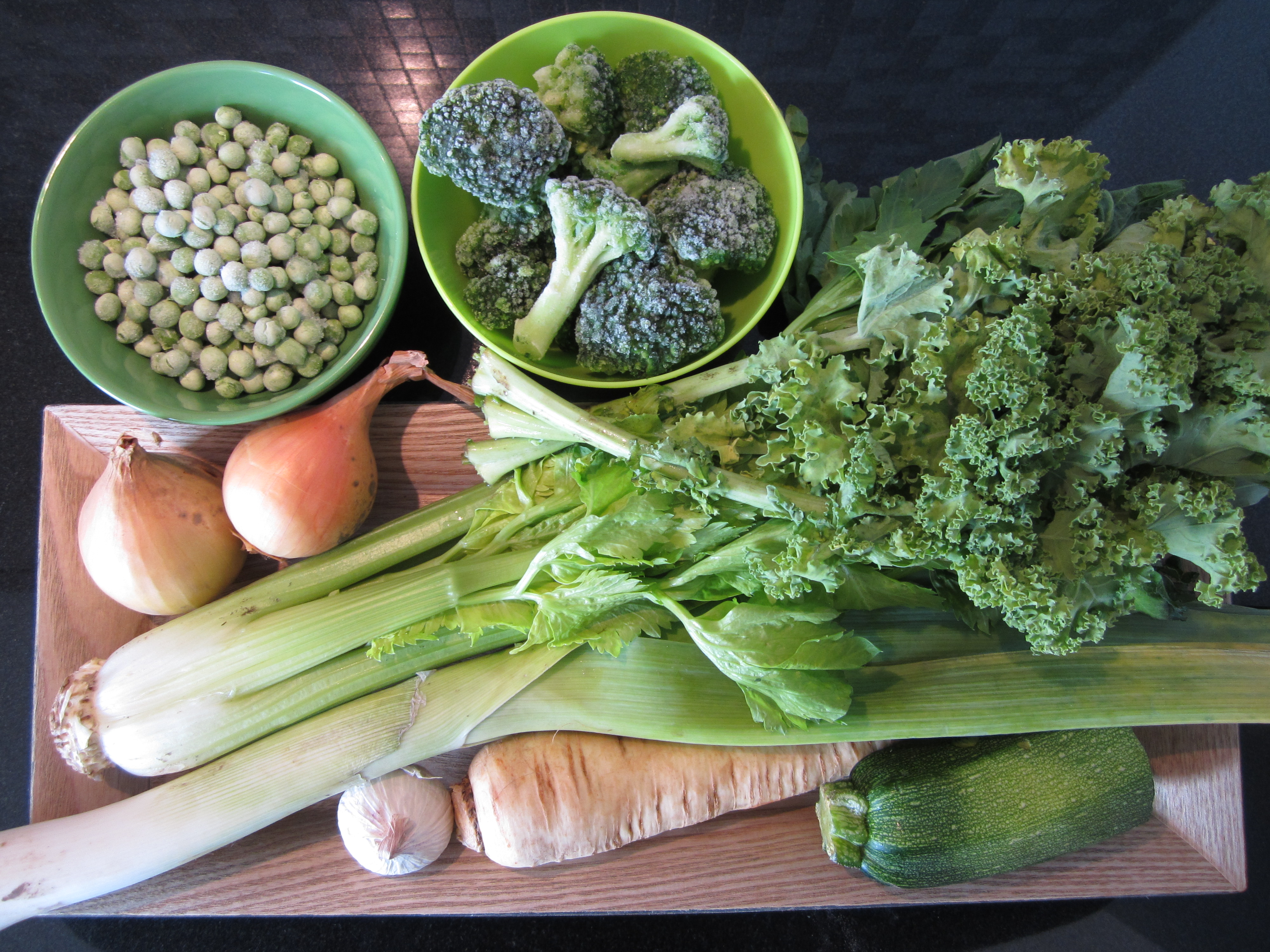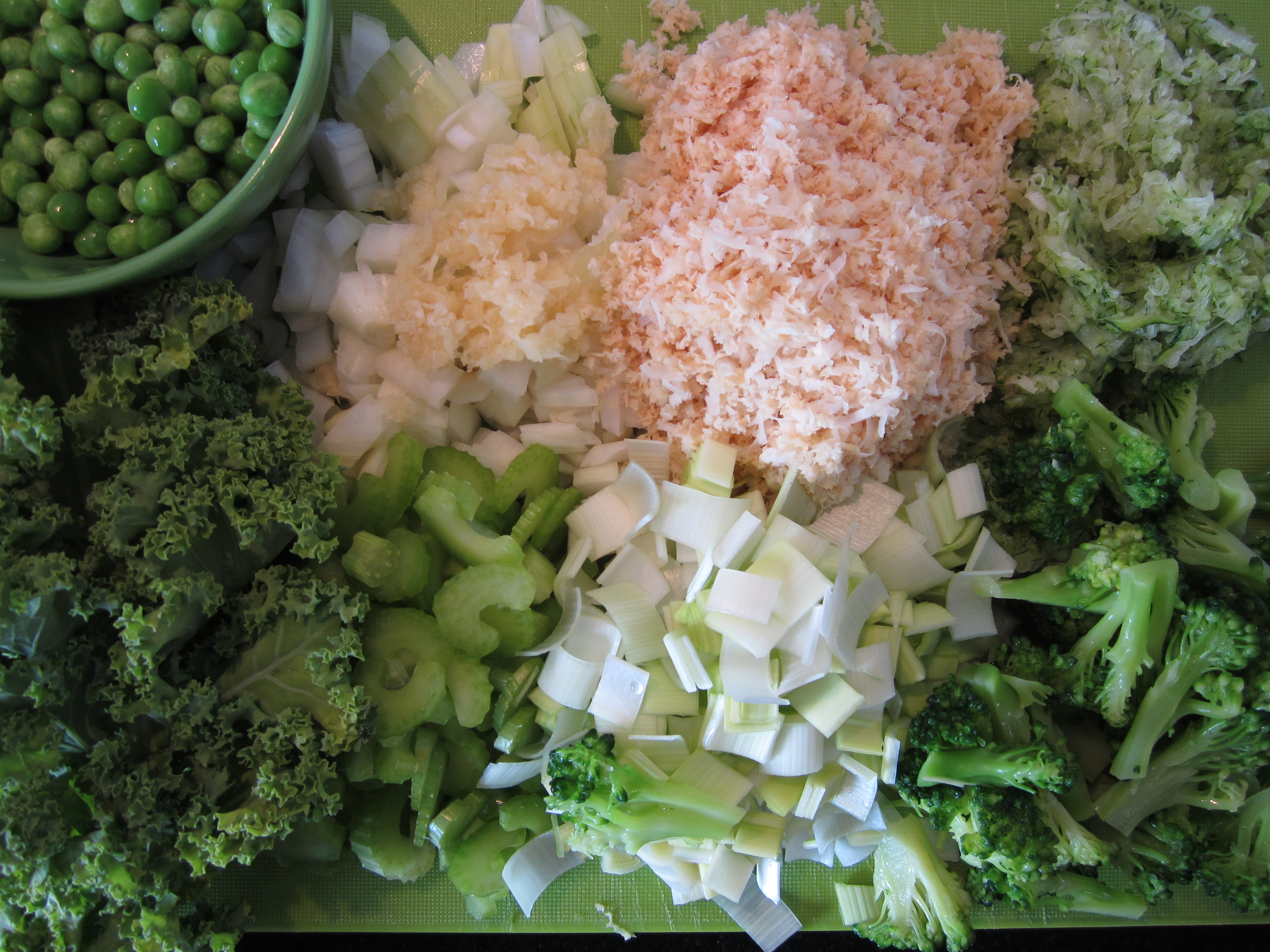 Jeg rev squash, hvitløk og pastinakk. Purre og løk kuttes i små biter. Skjær sellerien i tynne skiver og del brokkolien i små buketter. Jeg brukte brokkoli fra fryseren, men det går lett å dele den med en god kniv etter noen minutter på kjøkkenbenken. Grønnkålen river jeg av stilken og har i grove biter.