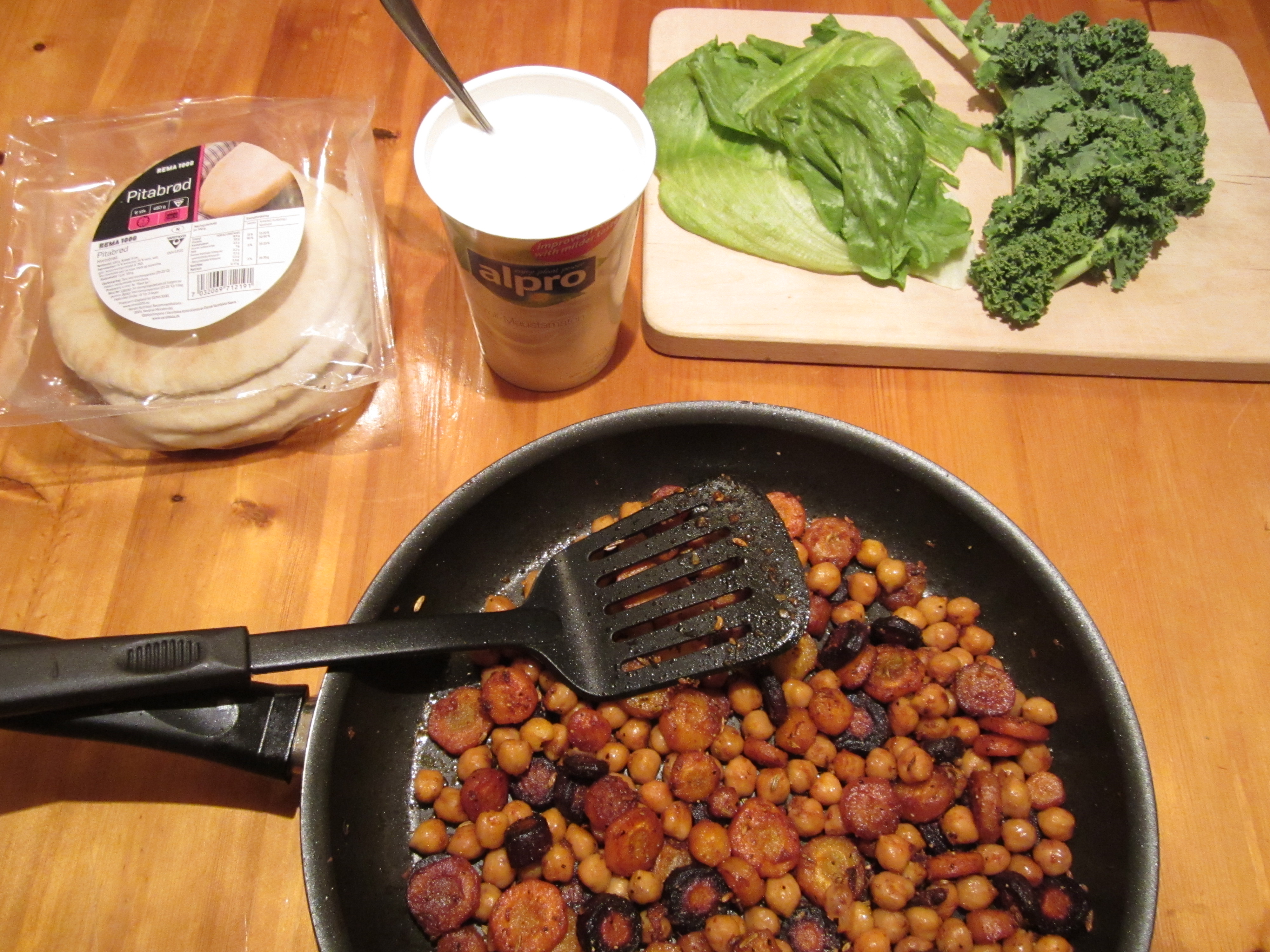 Server i pitabrød. Bruk gjerne en skje yoghurt i hvert brød. Jeg liker også å ha noe grønt, i dette tilfellet isbergsalat og grønnkål.