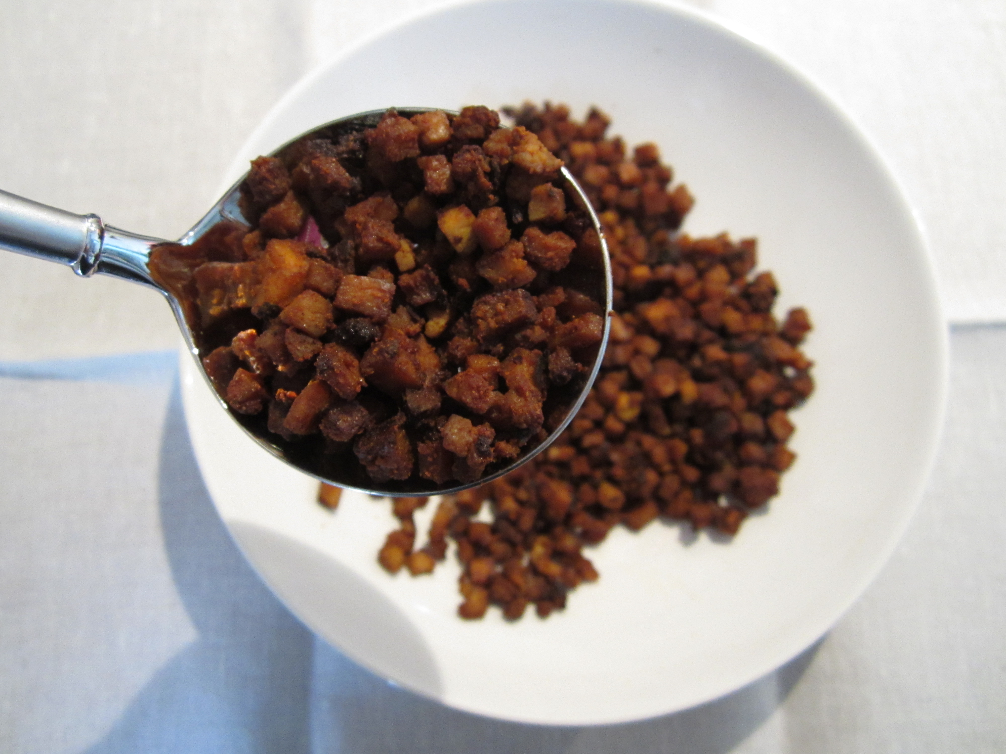 Dette er vel tilnærmet det en del veganere omtaler som “facon”, altså fake bacon. Fremgangsmåten er å legge tofuen i en slags marinade for så å steke den. Jeg stekte den i ildfast form i ovn. Det tar lenger tid, men man unngår da den oljen som går med dersom man tilbederer tofuen i stekepanne.