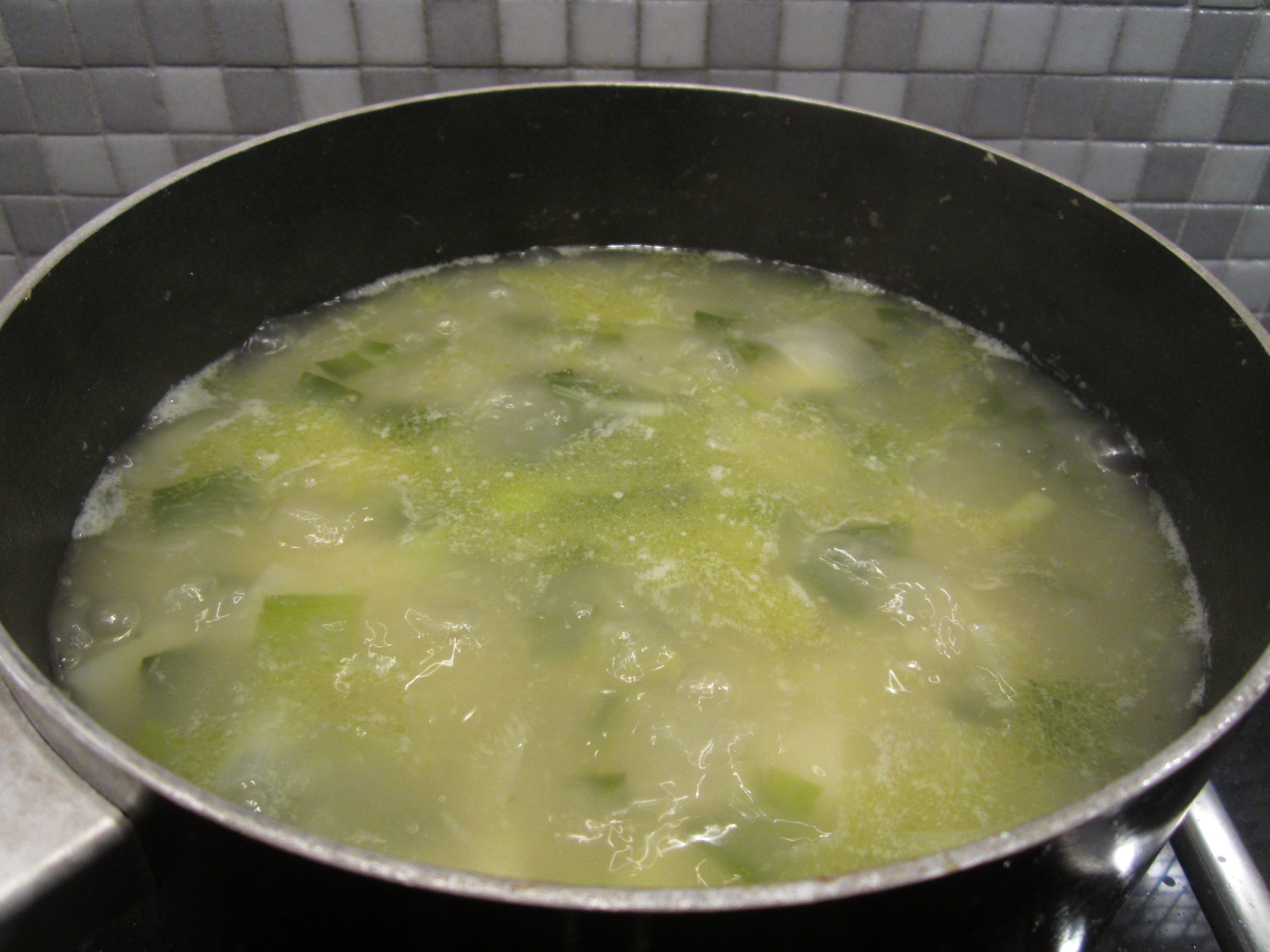 Hell så over buljong og gi et oppkok. La så suppen koke 20-25 minutter. Dersom man ønsker en fullstendig fettfri versjon kan man fint hoppe over steg en, og ha grønnsakene direkte i gryten med buljong.