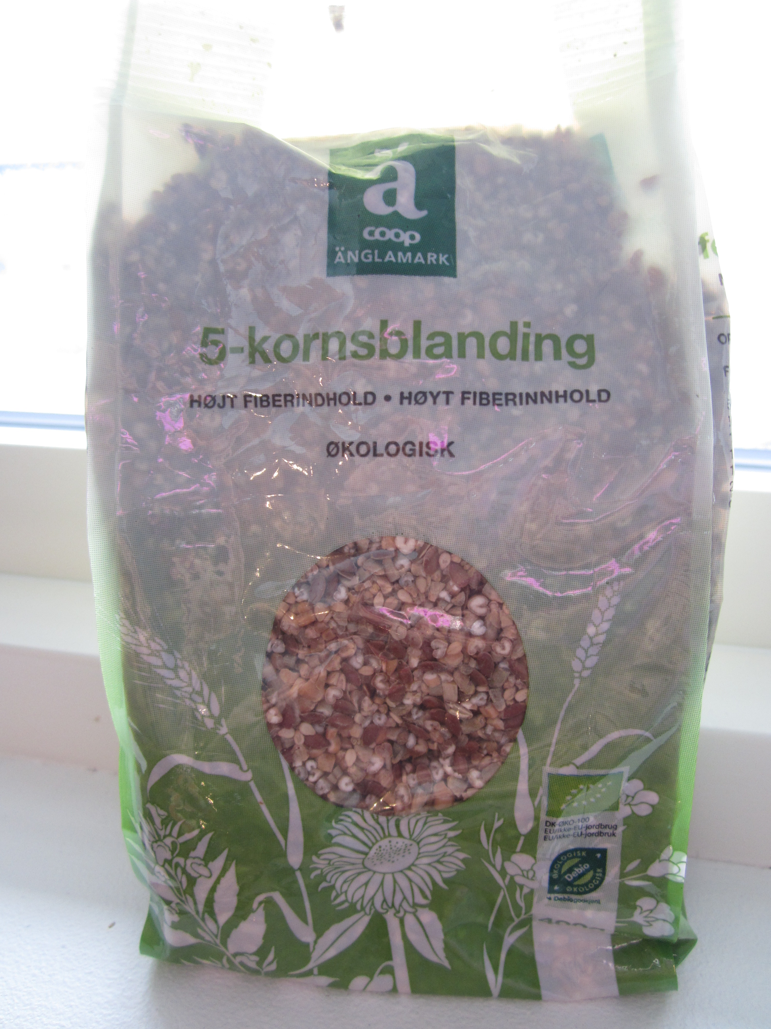 Ha melet i en bolle sammen med økologisk 5-kornsblanding og salt. Kornblandingen har jeg kjøpt på Coop og består av knuste hvete- og rugkjerner, sesamfrø, solsikkekjerner og linfrø.