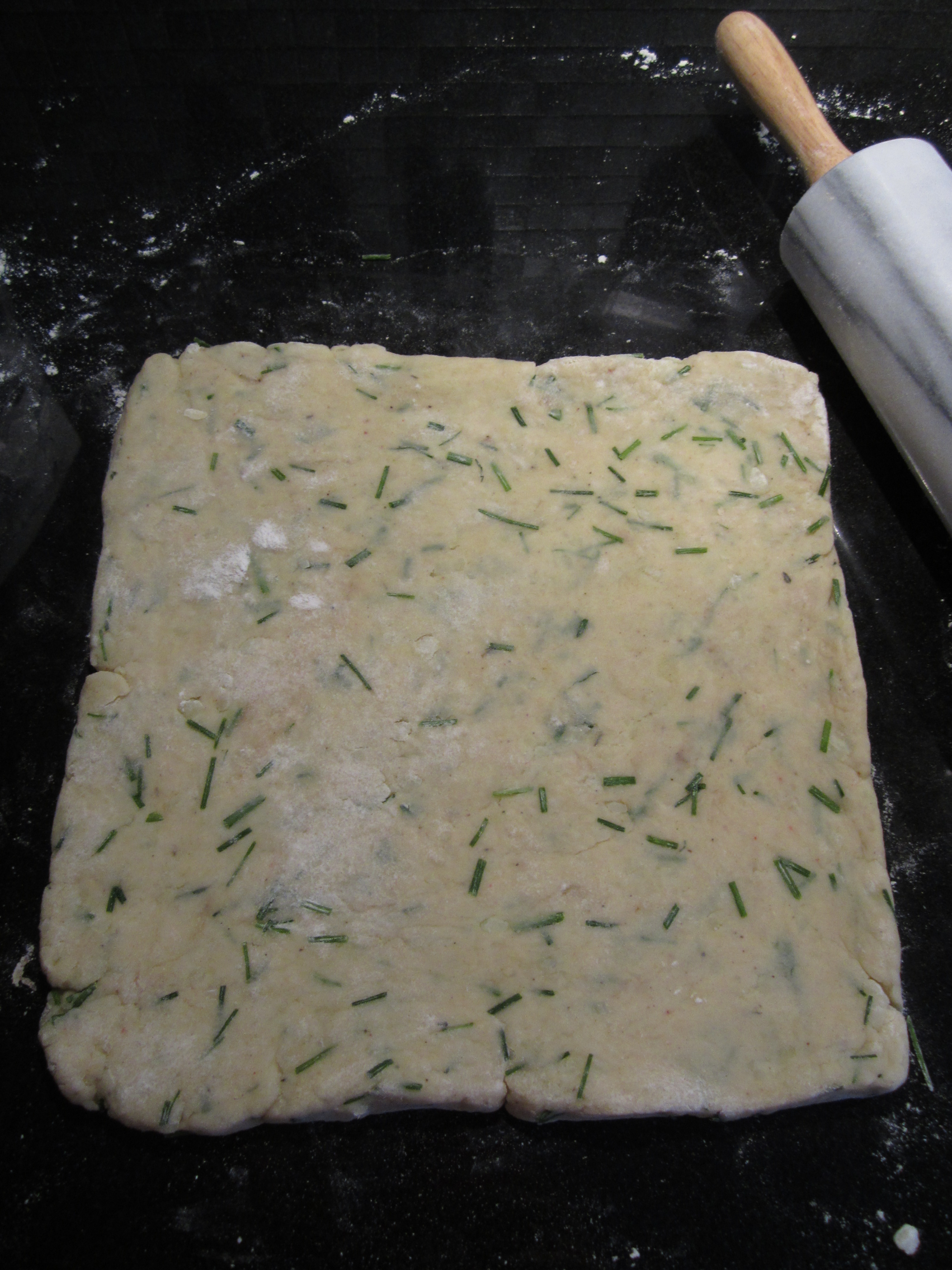 Kjevle så ut deigen på en lett melet kjøkkenbenk. Opprinnelig er det vanlig å stikke ut små runde scones, men jeg syns det var enklere å kjevle ut en storfirkant og dele den opp i små rektangler. Deigen var utrolig lett å arbeide med, så dette gikk som en lek.