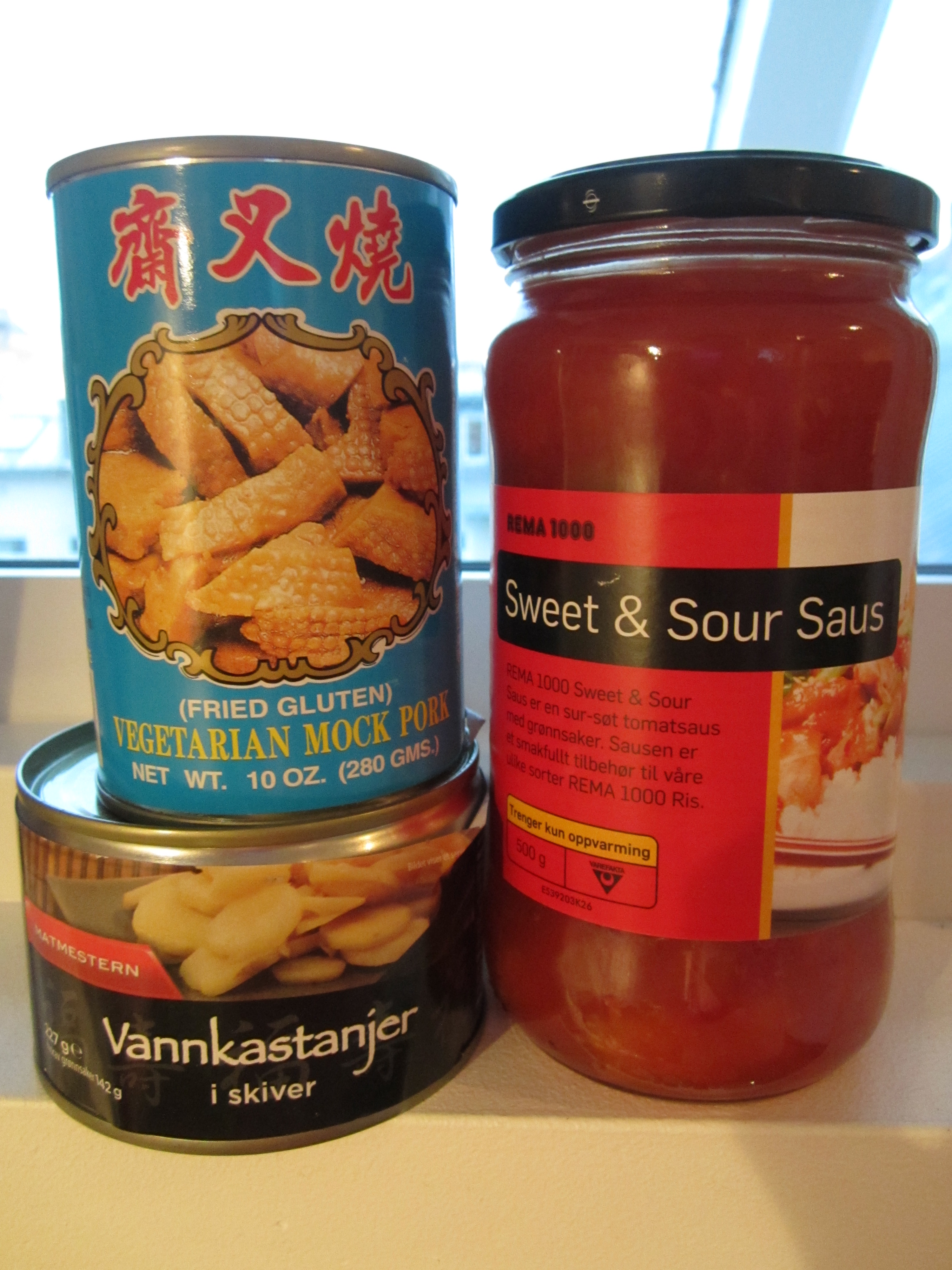 Skyll seitanen raskt under rennende vann. Riv eller skjær i noe mindre biter. Ha i en kjele med et glass ferdig sweet & sour saus. Jeg liker også å bruke en liten boks vannkastanjer. Det knaser ganske godt, også styrker det grønnsaksalibiet i retten. Gi et kjapt oppkok.