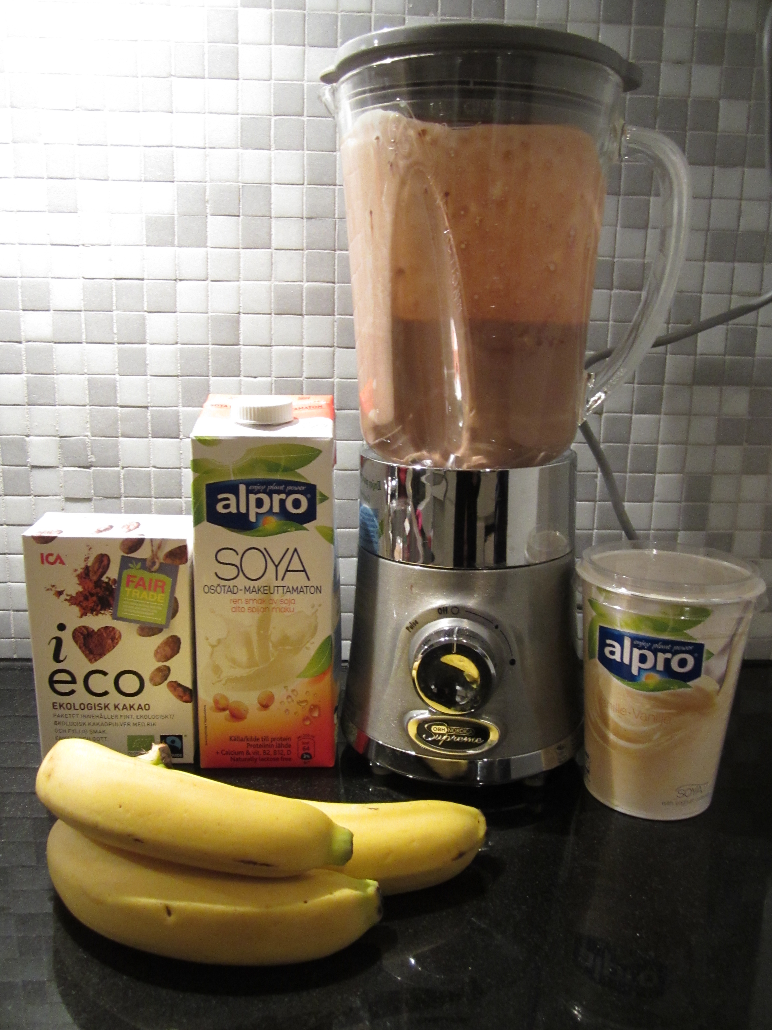 Kjør alle ingredienser sammen i en blender. Nøyaktige mål er ikke nødvendig, jeg tilbereder litt på slump. Ca 2-3 desiliter soyayoghurt med vaniljesmak og et par desiliter soyamelk. Noen spiseskjeer kakao. Juster etter hvor sterk sjokoladesmak du vil ha, jeg liker masse. I tillegg bruker jeg et par bananer for fyldighet og sødme.