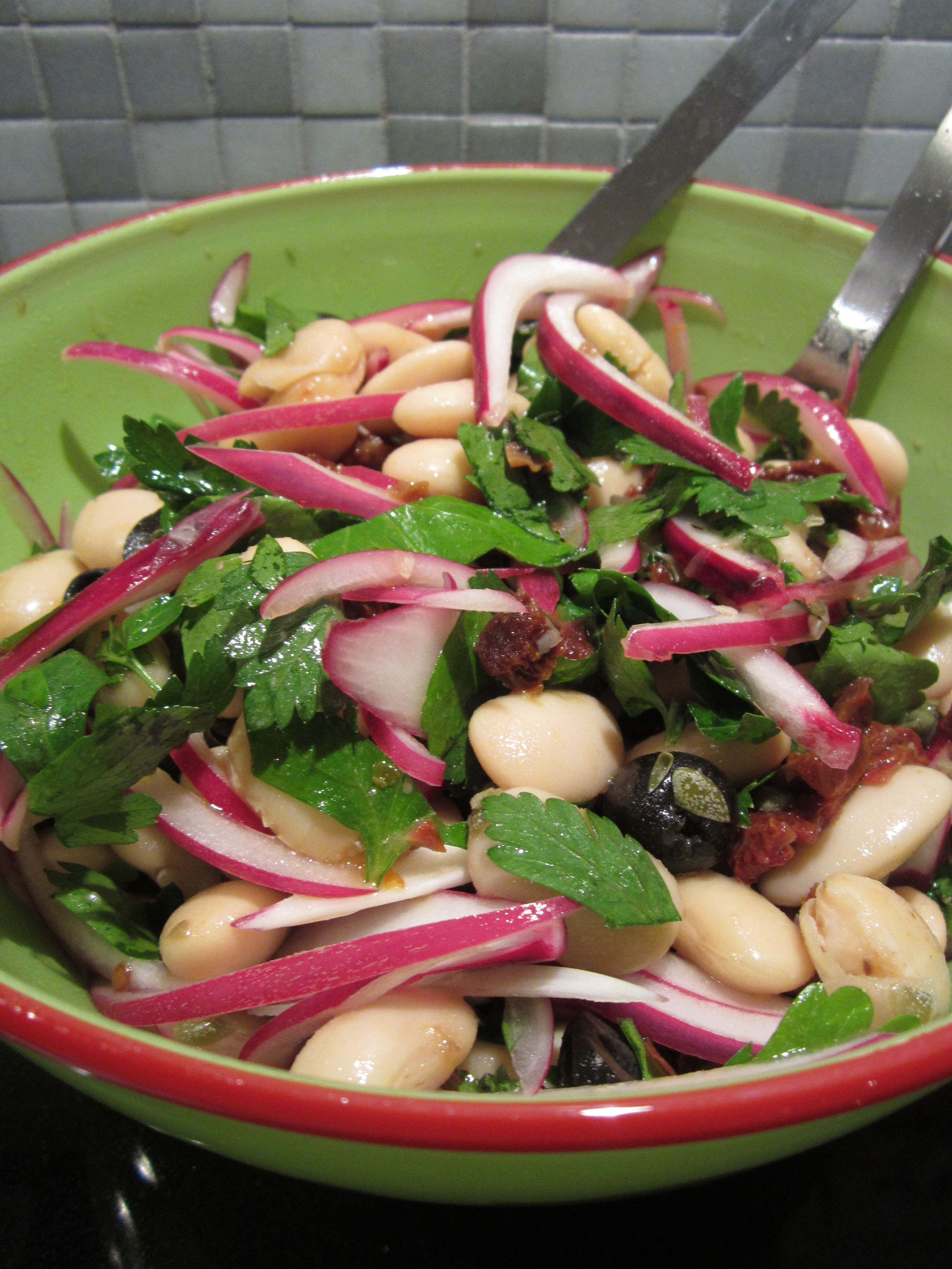 Salaten er snarlaget, det eneste som må forberedes noe i forveien er rødløk som skal ligge i eddiklake en liten stund. Jeg brukte bønner direkte fra boks, men det er selvsagt mulig å koke opp tørre bønner dersom man planlegger litt.