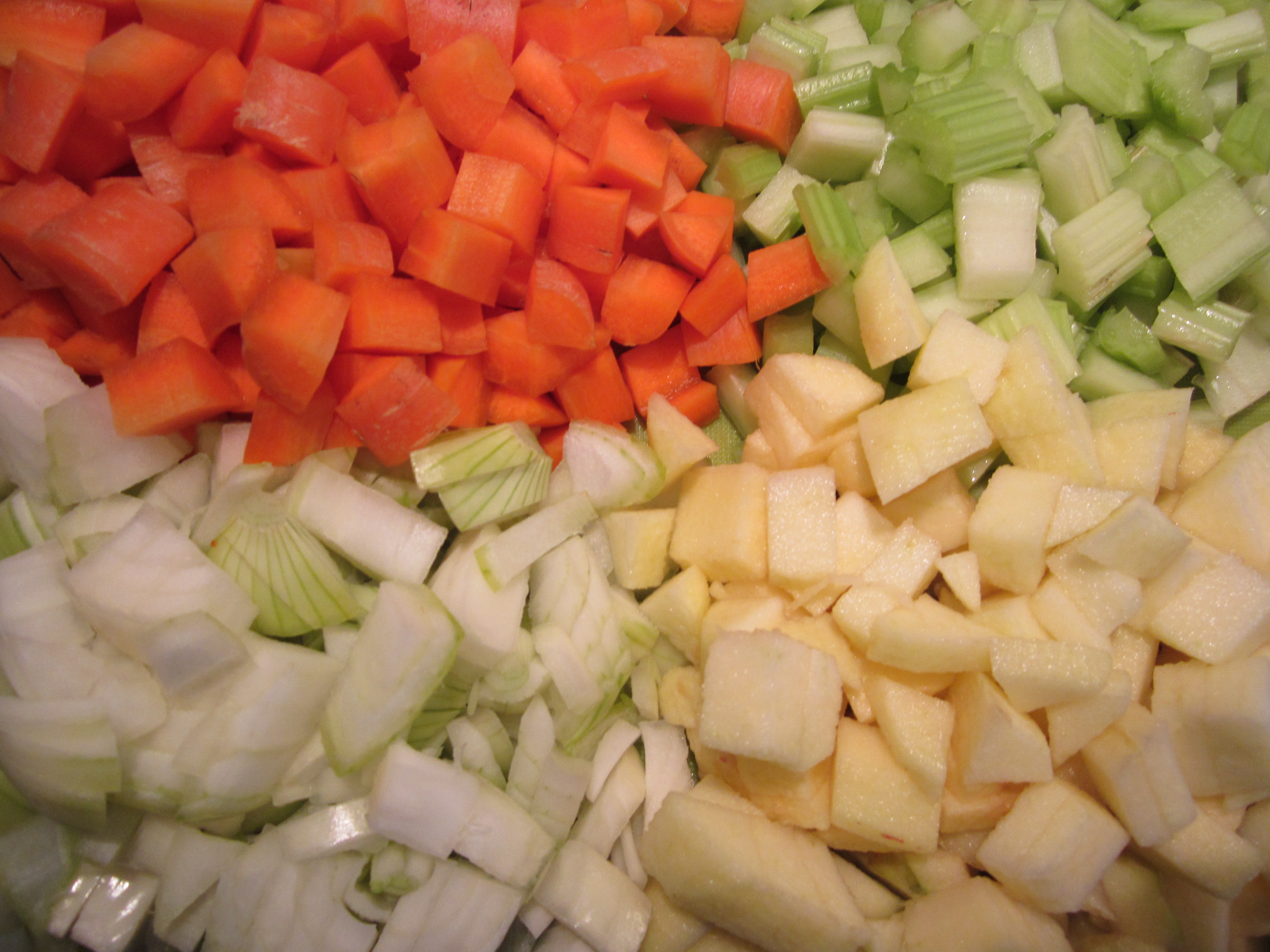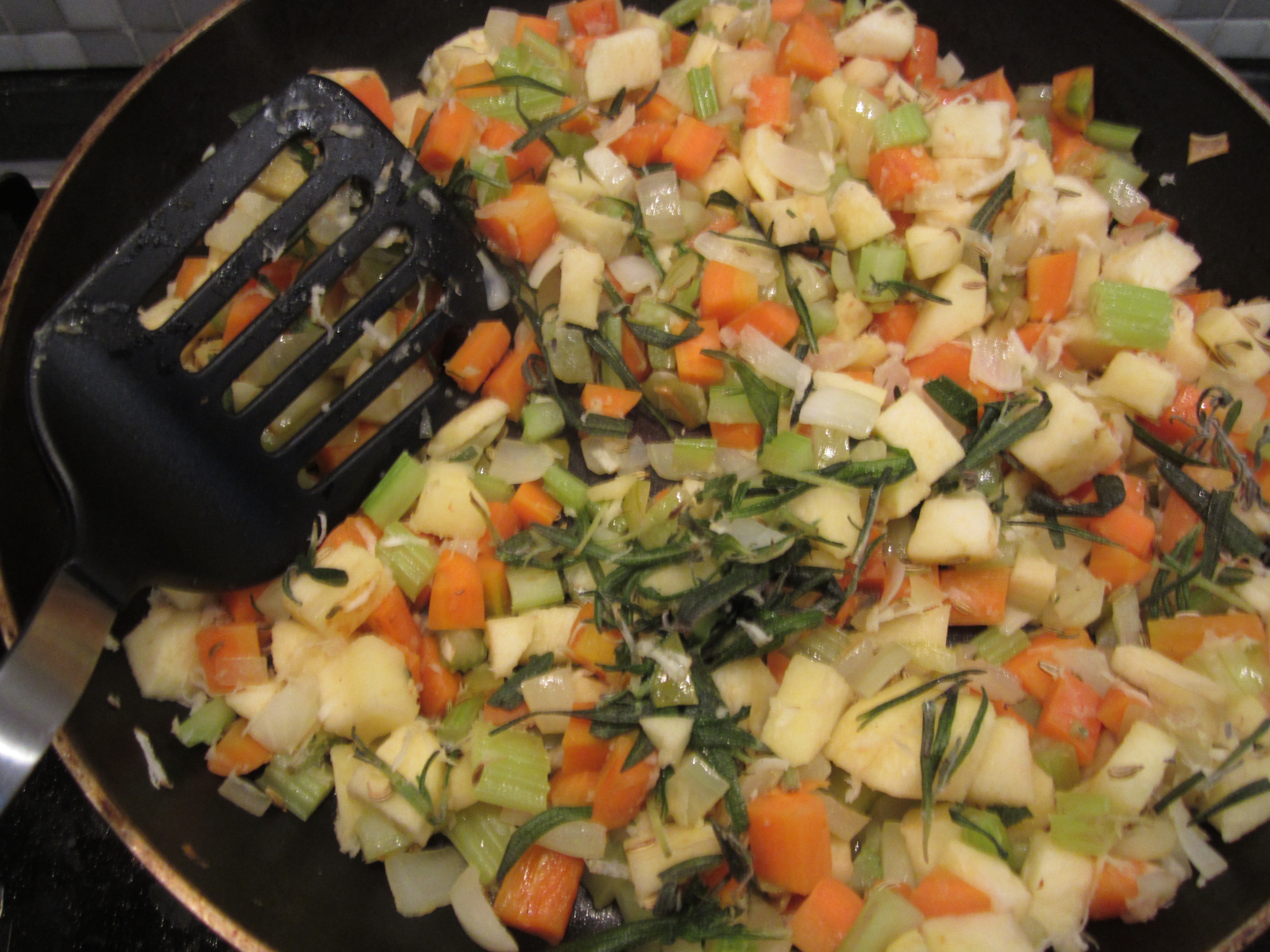 Skyll og rens linsene godt. Kok opp med buljong og hvitløkspulver utblandet i en liter vann. Hakk i mellomtiden grønnsakene og epler i små terninger. Surr i en panne med litt olje i ti minutters tid. Tilsett krydderne og la det surre ytterligere fem minutter. Terningene skal blir nokså myke.