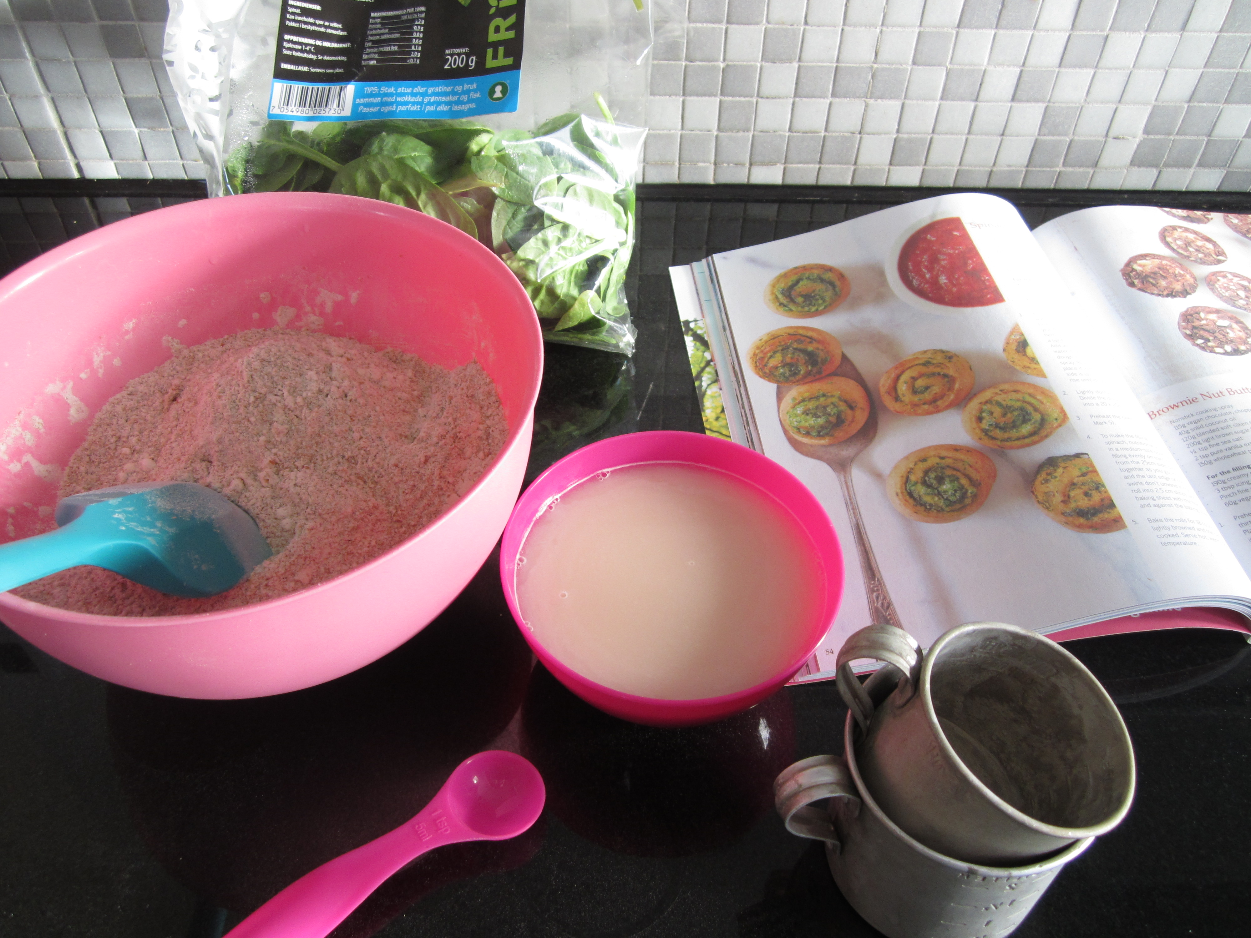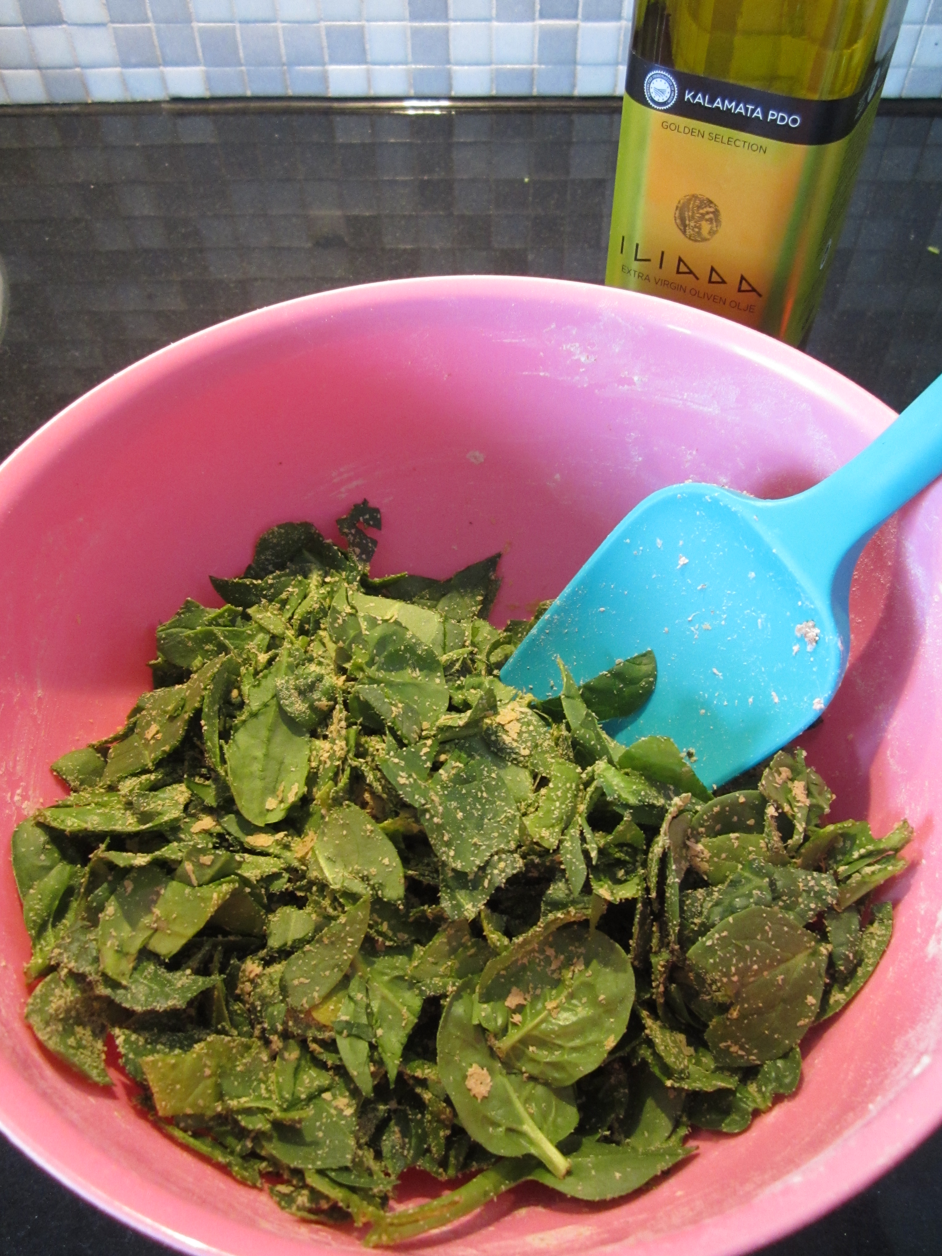 Lag i mens fyllet. Spinaten skal hakkes grovt. Rør så inn næringsgjær og pepper slik at det fordeler seg. Tilsett deretter god olivenolje slik at spinaten faller litt sammen.