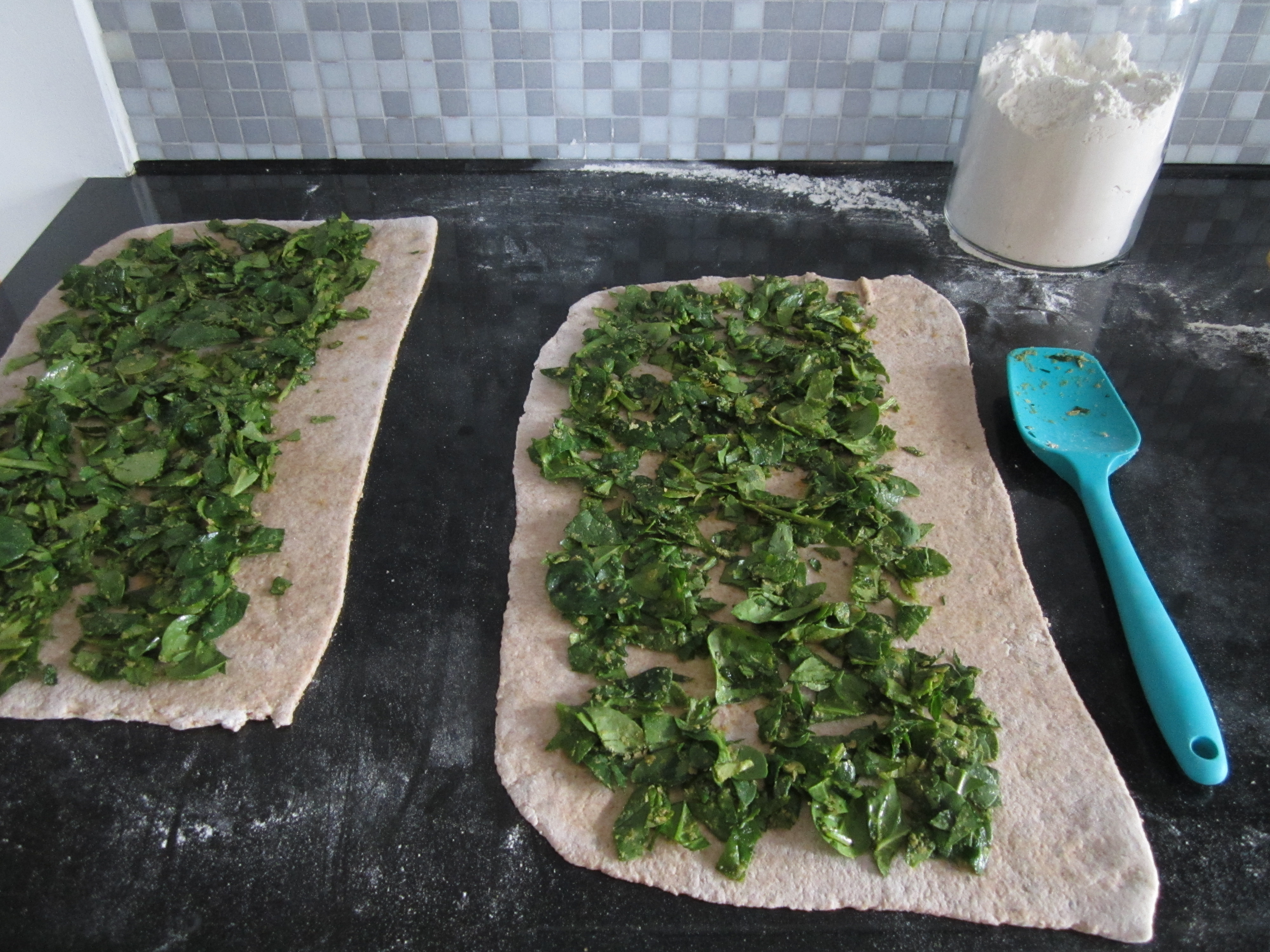 Rull ut deigen på melet kjøkkenbenk. Del den i to og kjevle hver til en rektangel på ca 25×40 cm. Fordel så spinatblandingen jevnt utover. La det være igjen en naken stripe på noen cm på langsiden.
