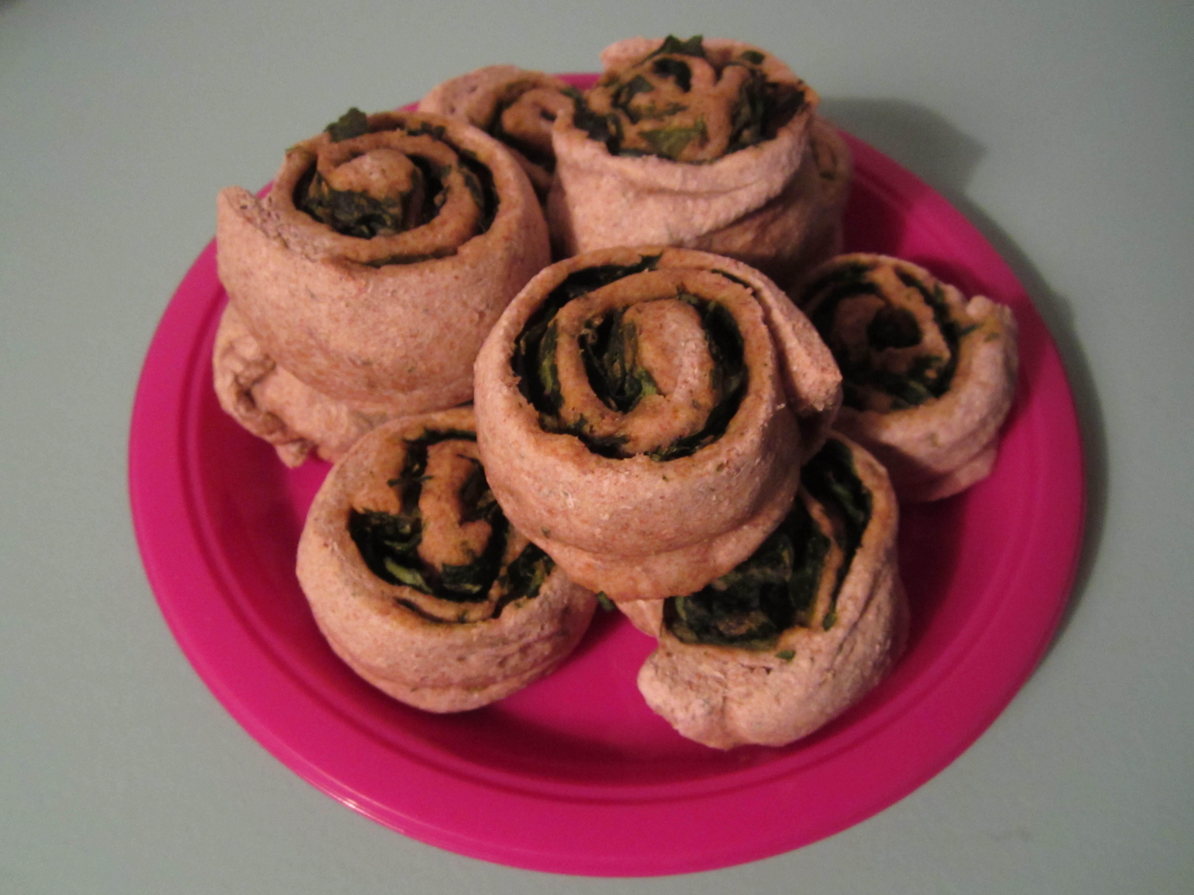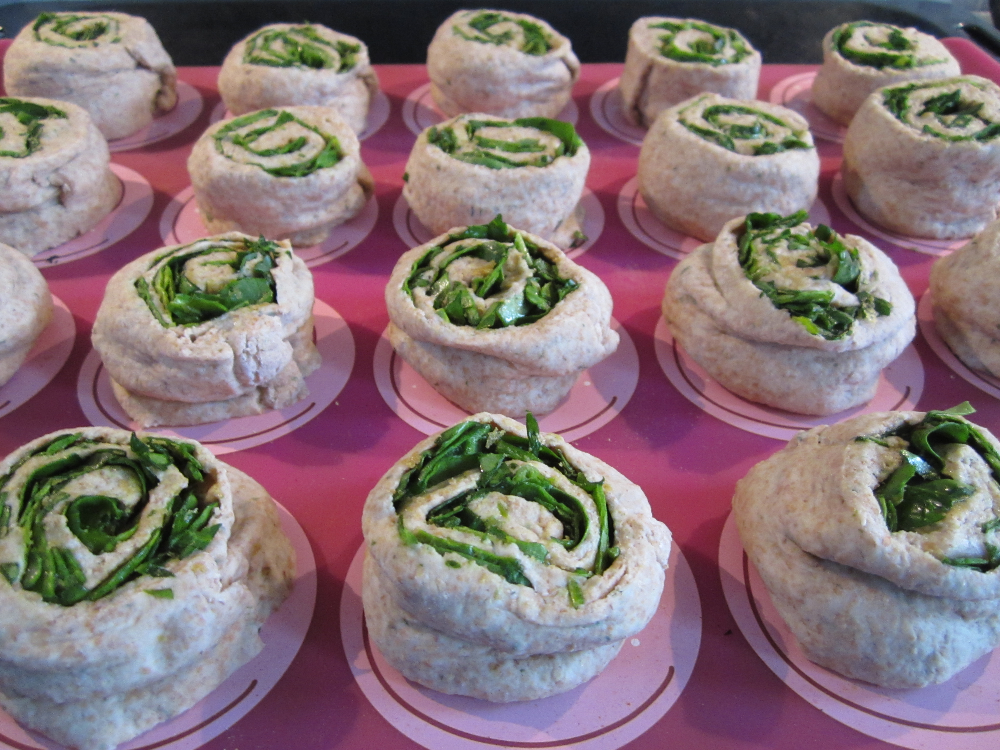 Rull deretter hver av deigene fra langsiden og mot den nakne stripen slik at det blir en lang pølse med spinat i midten. Press den litt sammen underveis og fest enden godt slik at de ikke løser seg opp under steking. Jeg delte hver av pølsene i 10 biter.