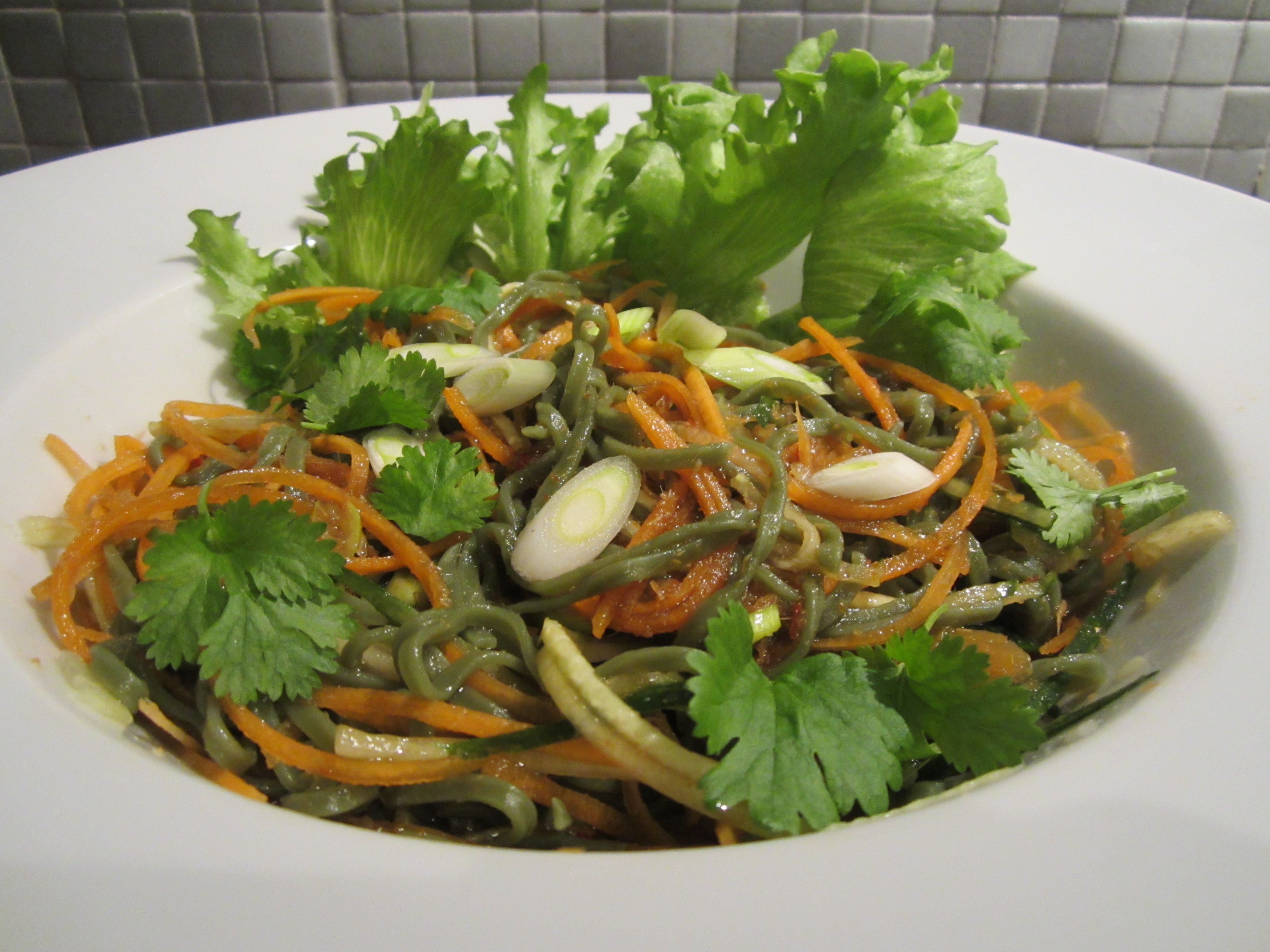 Skjær agurk og gulrot med i tynne strimler med juliennejern. Vårløken skjæres i skrå skiver. Tilbered nudlene etter anvisninger på pakken (vanligvis få minutters koketid), skyll i kaldt vann og rist av vannet. Vask salaten i iskaldt vann og tørk i et kjøkkenhåndkle.