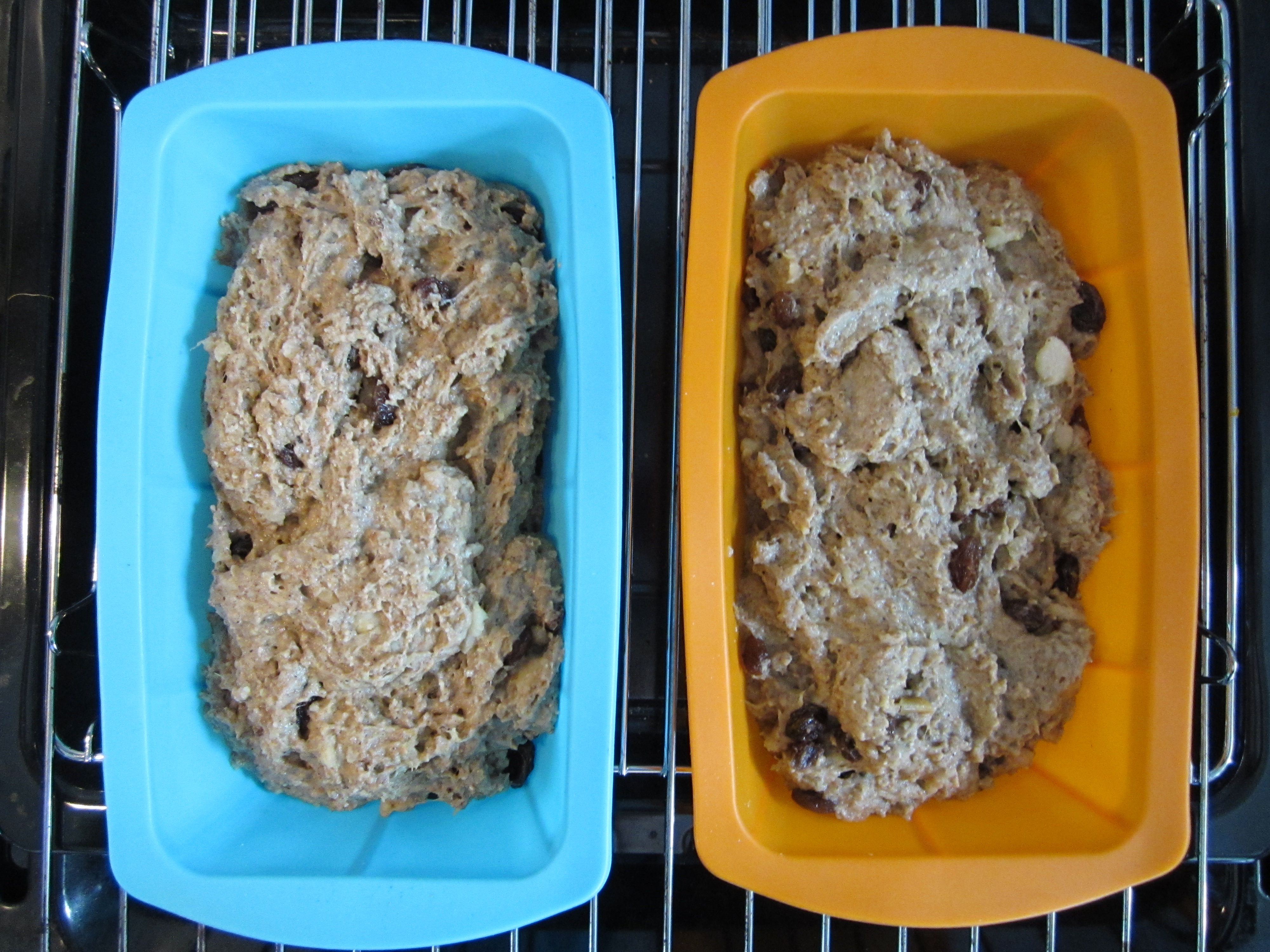 Rør eddiken inn i eplemosen. Bland sammen de tørre ingrediensene. Vend inn i eplemosen med en slikkepott eller lignende. Hell så røren over i former. Jeg brukte to små brødformer i silikon.