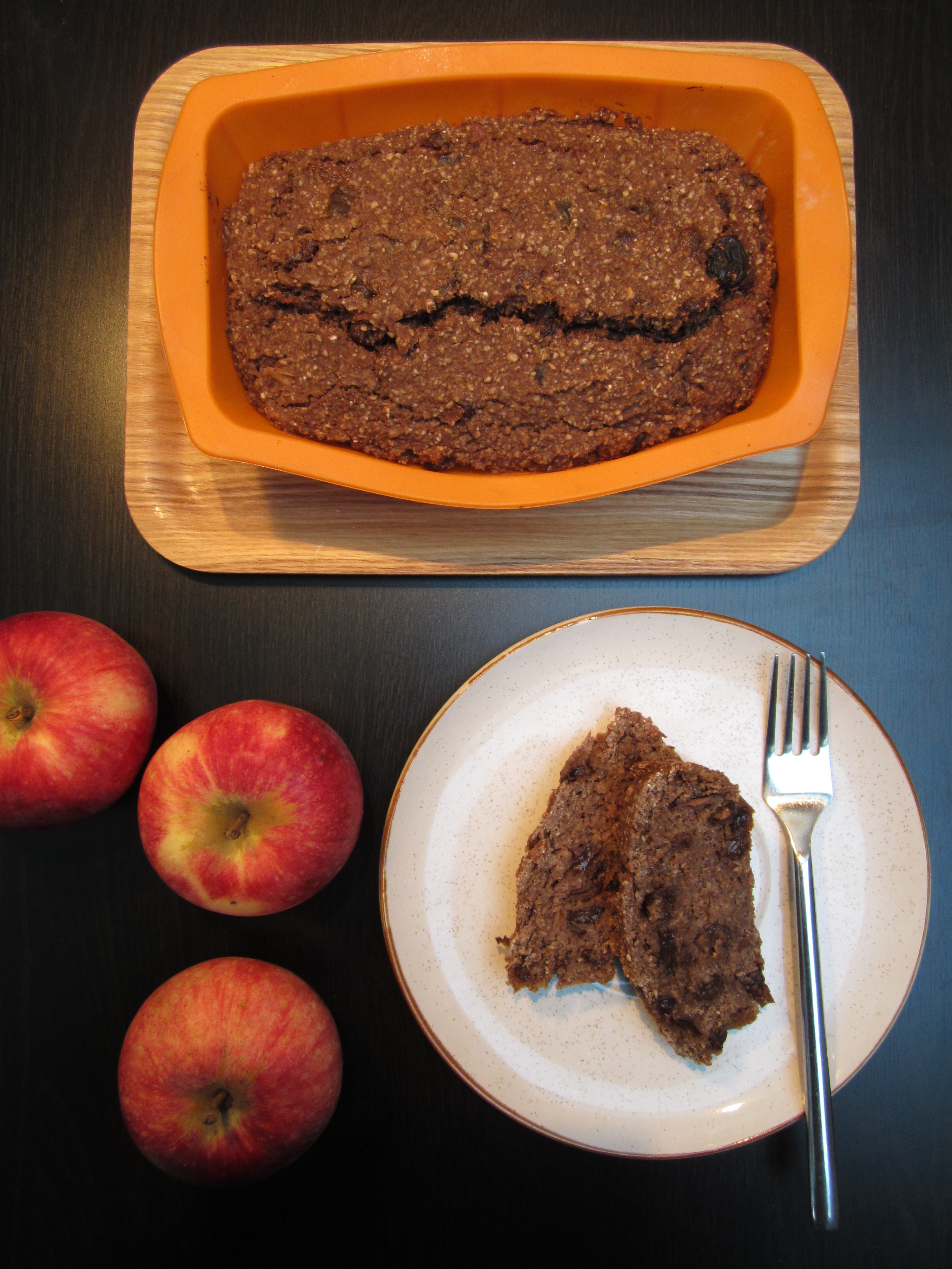 Kaken er fritt laget etter, eller inspirert av en oppskrift av Leah Leneman fra kokeboken 365 plus one Vegan Recipes. Hun bruker verken sukker eller fint mel, men jeg savnet ingen av delene i oppskriften. Eplene er søte og gode nok i seg selv, og i tillegg brukte jeg en del rosiner. Med en dæsj diverse krydder ble kaken helt nydelig.