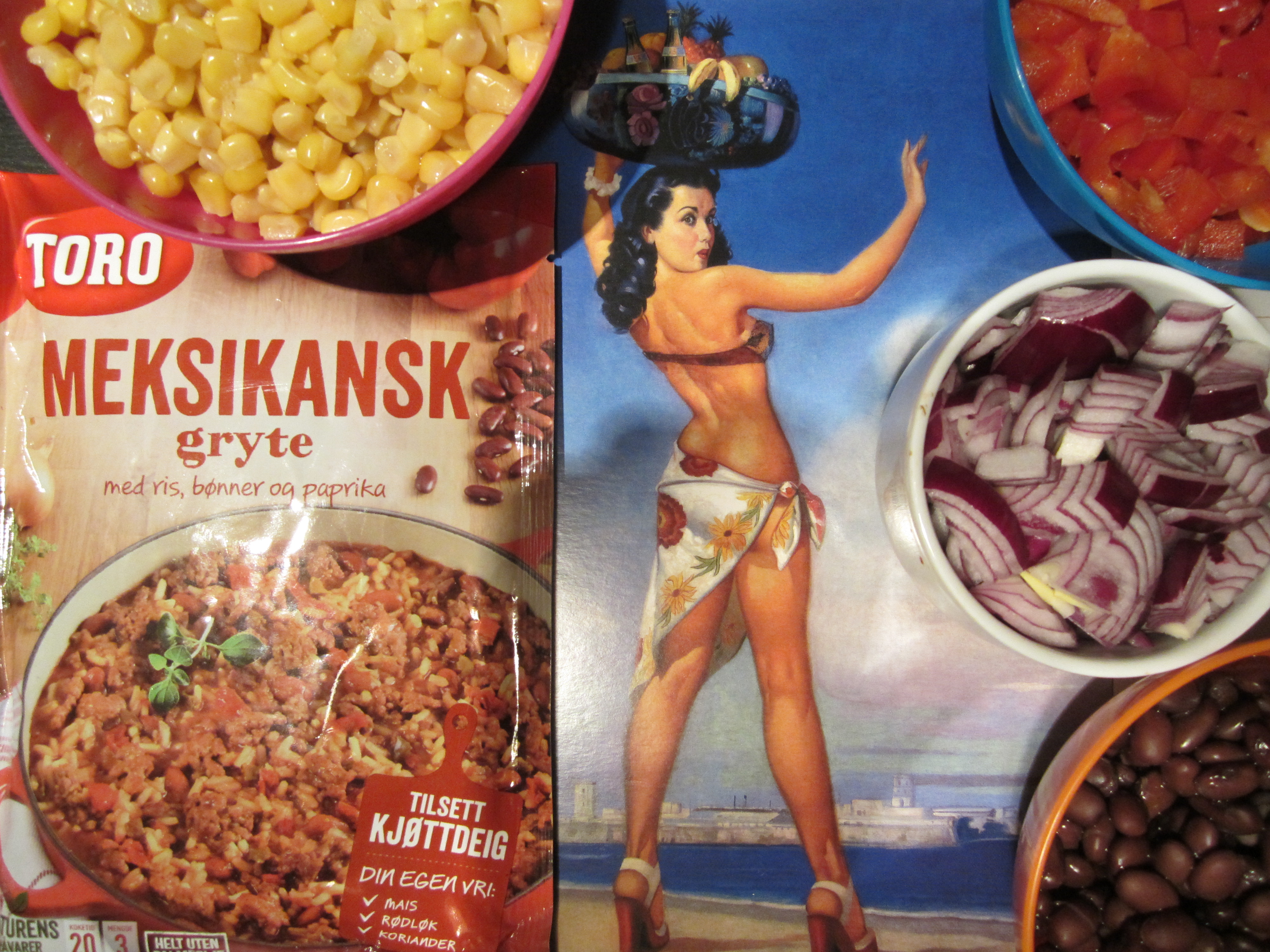 Kok opp 8 dl vann og rør ut pulveret i en stor gryte. La den koke ti minutters tid. Hakk chili, paprika og rødløk og ha i gryten med mais og bønner. Kok ytterligere ti minutter. Det var alt!
