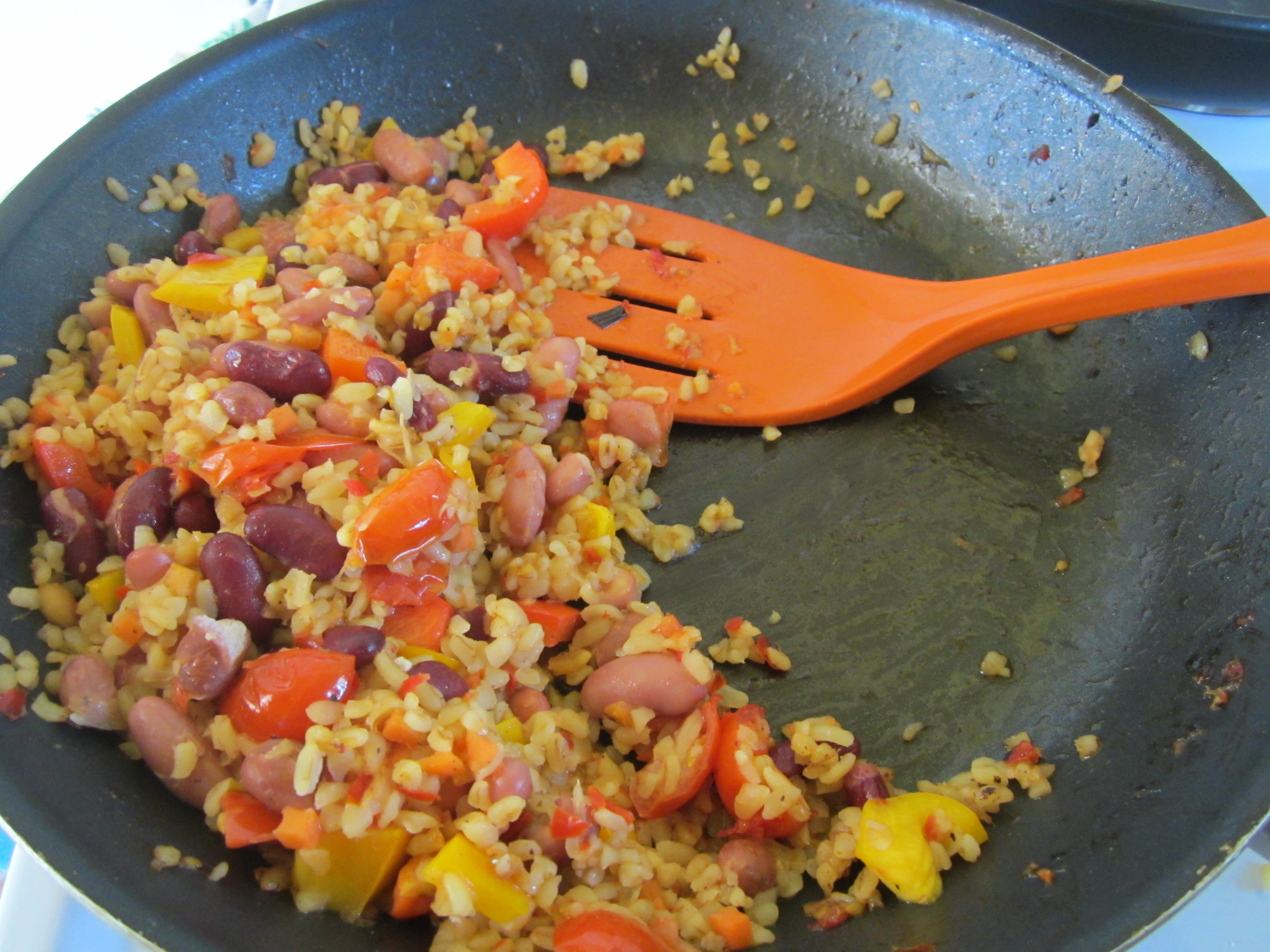 Varm opp bulgursalaten i en stekepanne noen minutter. Skyll bønnene og tilsett sammen med hakket paprika og cherrytomater delt i to. Varm pitabrød i brødrister og ha i fyllet.