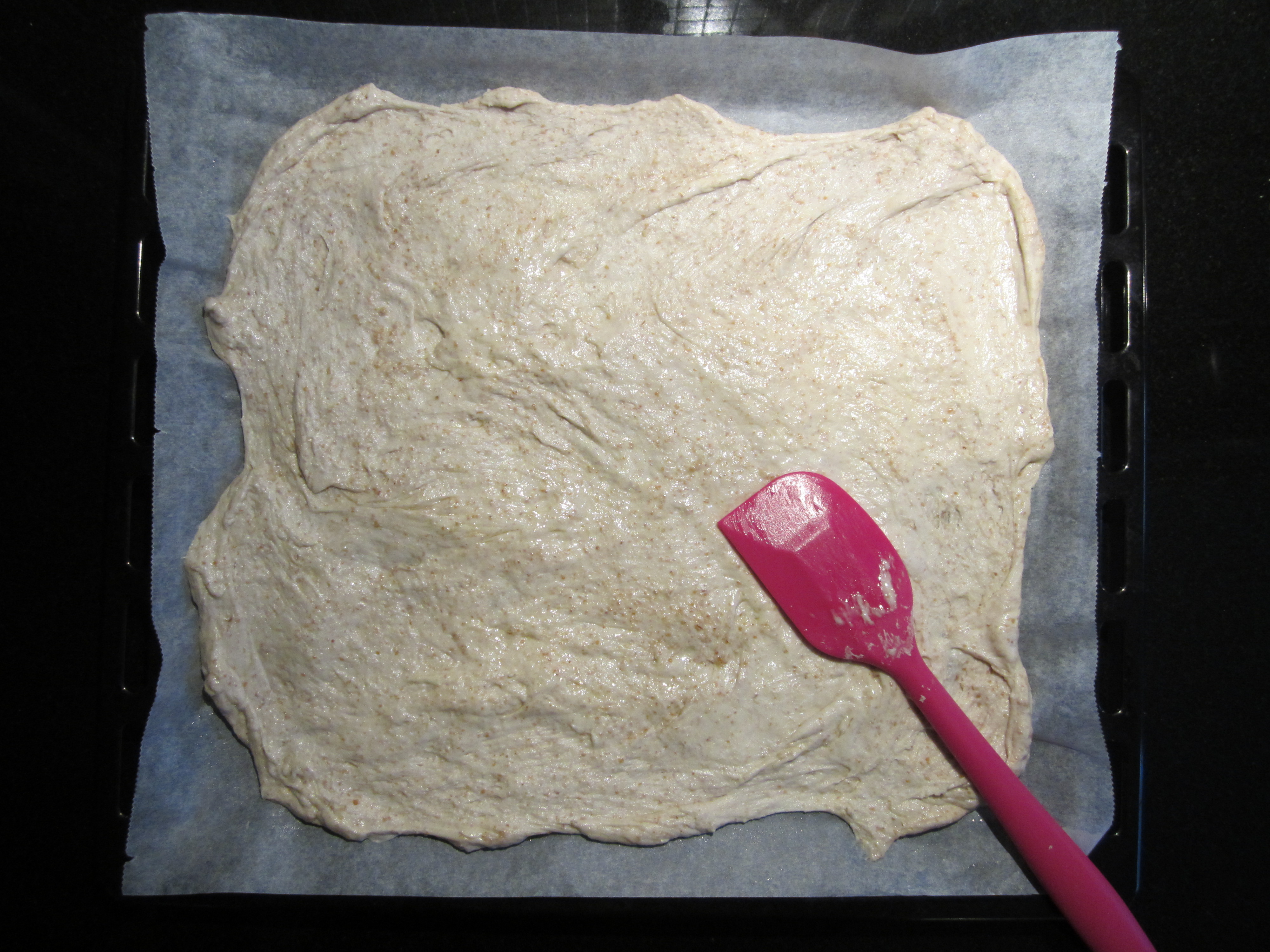 Bland sammen og elt til en smidig deig. Sett til heving en halvtime-time, eller til den har hevet til dobbel størrelse. Fordel deretter deigen utover et stekebrett med en slikkepott, hell på bittelitt olje under prosessen dersom nødvendig.