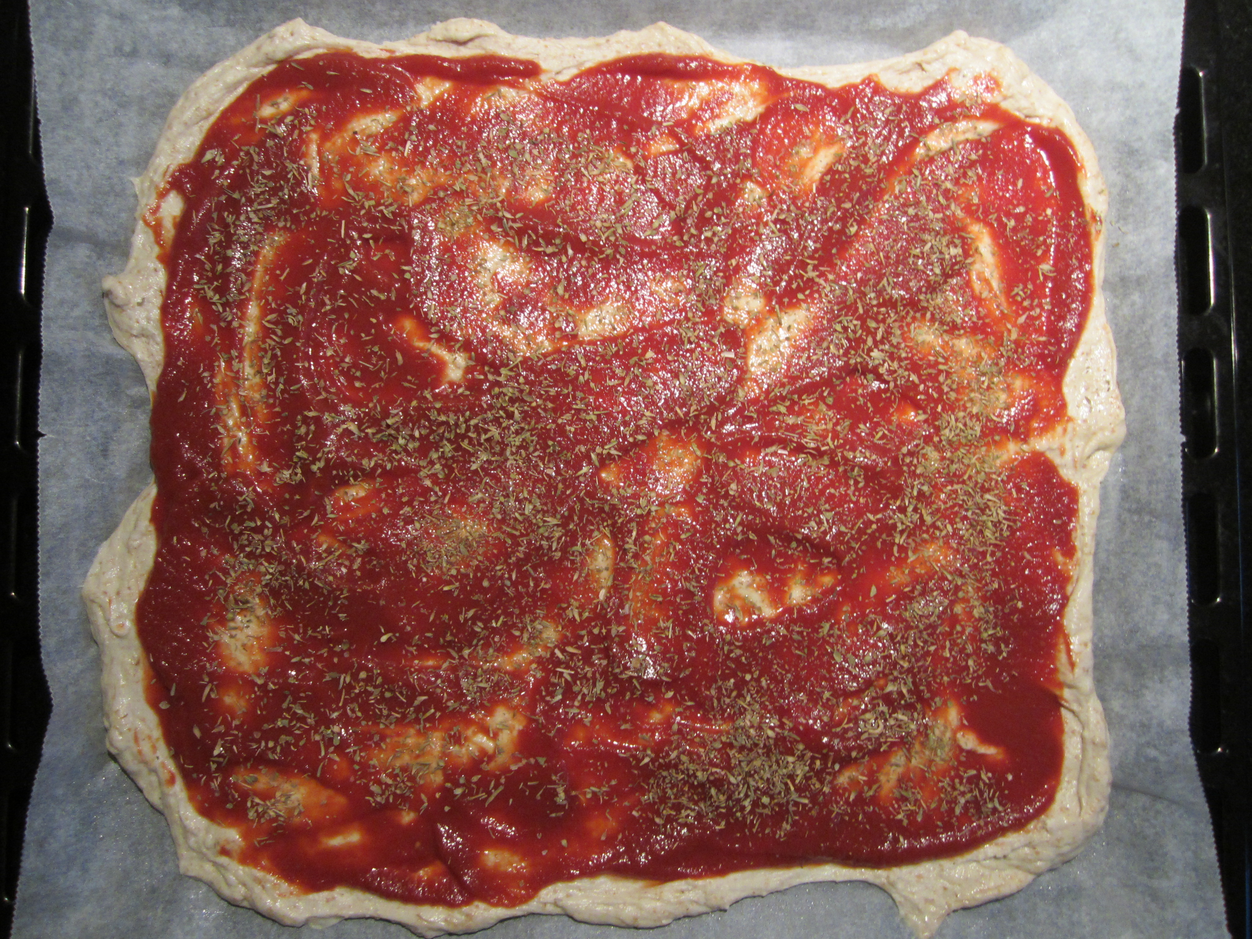 Fordel så tomatsaus jevnt utover pizzadeigen. Jeg laget tomatsaus ved å sile en boks hakket tomat og blande det flytende med noen skjeer tomatpure til den blir passe fast. Strø så over oregano eller annet ønskelig krydder. Sett til etterheving mens resten toppingen tilberedes.
