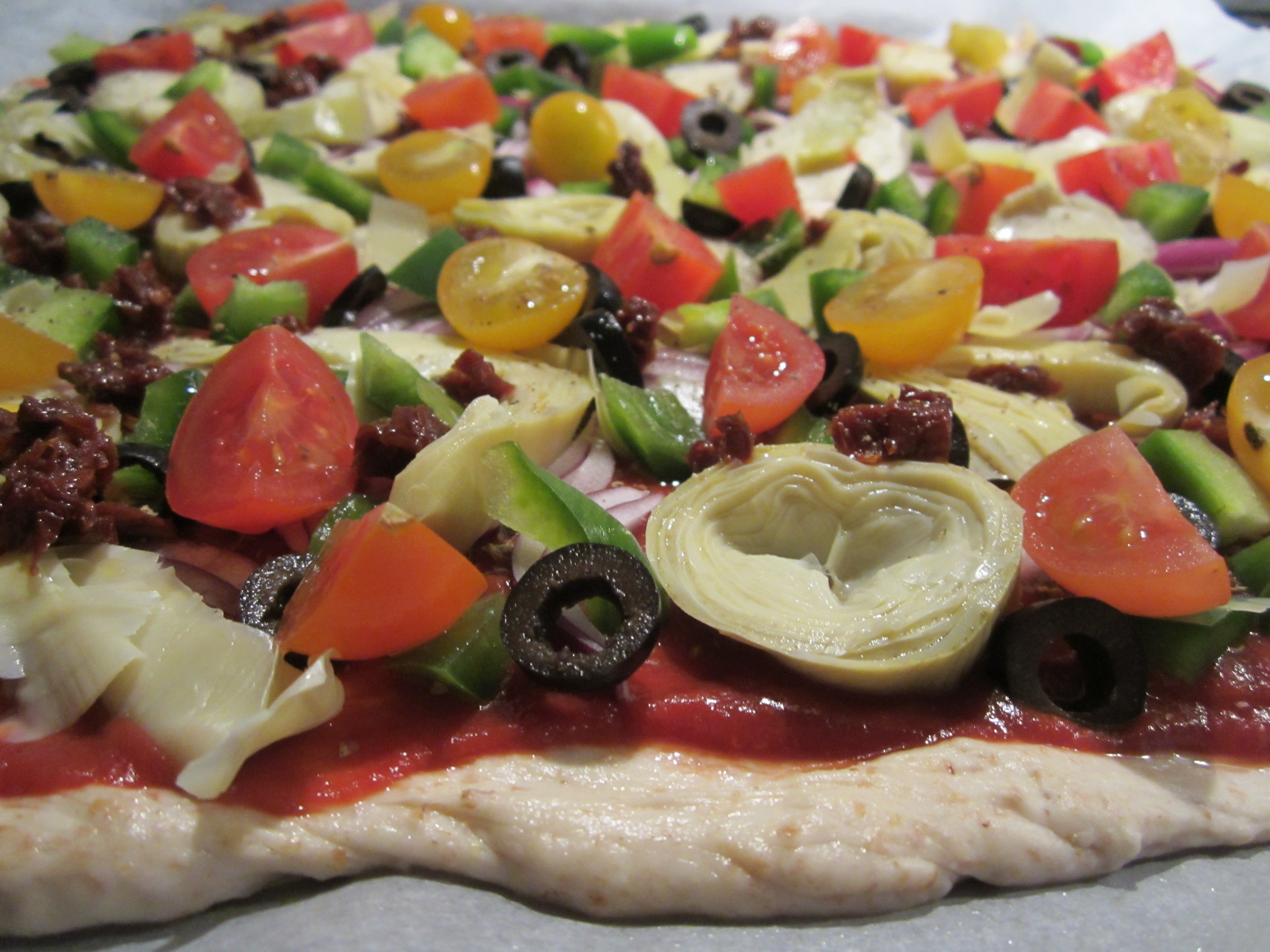 Noen ganger er det en skikkelig tykk pizzabunn jeg vil ha, og denne gangen ble det det. Det passer fint med tykk bunn, for jeg er glad i masse topping også. Artisjokk på pizza syns jeg i utgangspunktet var litt fremmed, men godt likevel. Dette er første gangen jeg prøver meg frem med det på hjemmebane og resultatet ble bra.