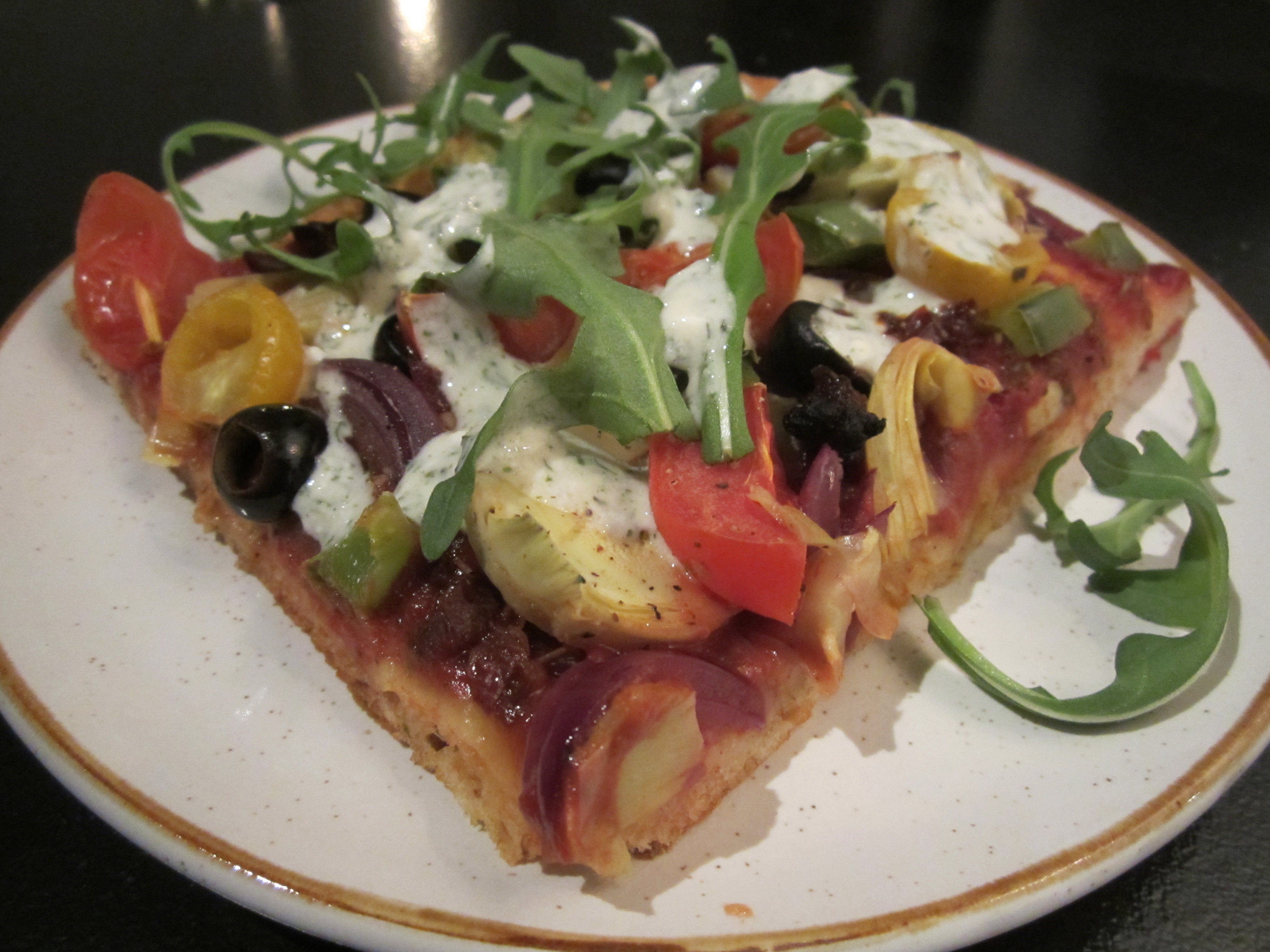 Server gjerne pizzaen toppet med ruccola og rømmedressing, knallgodt!