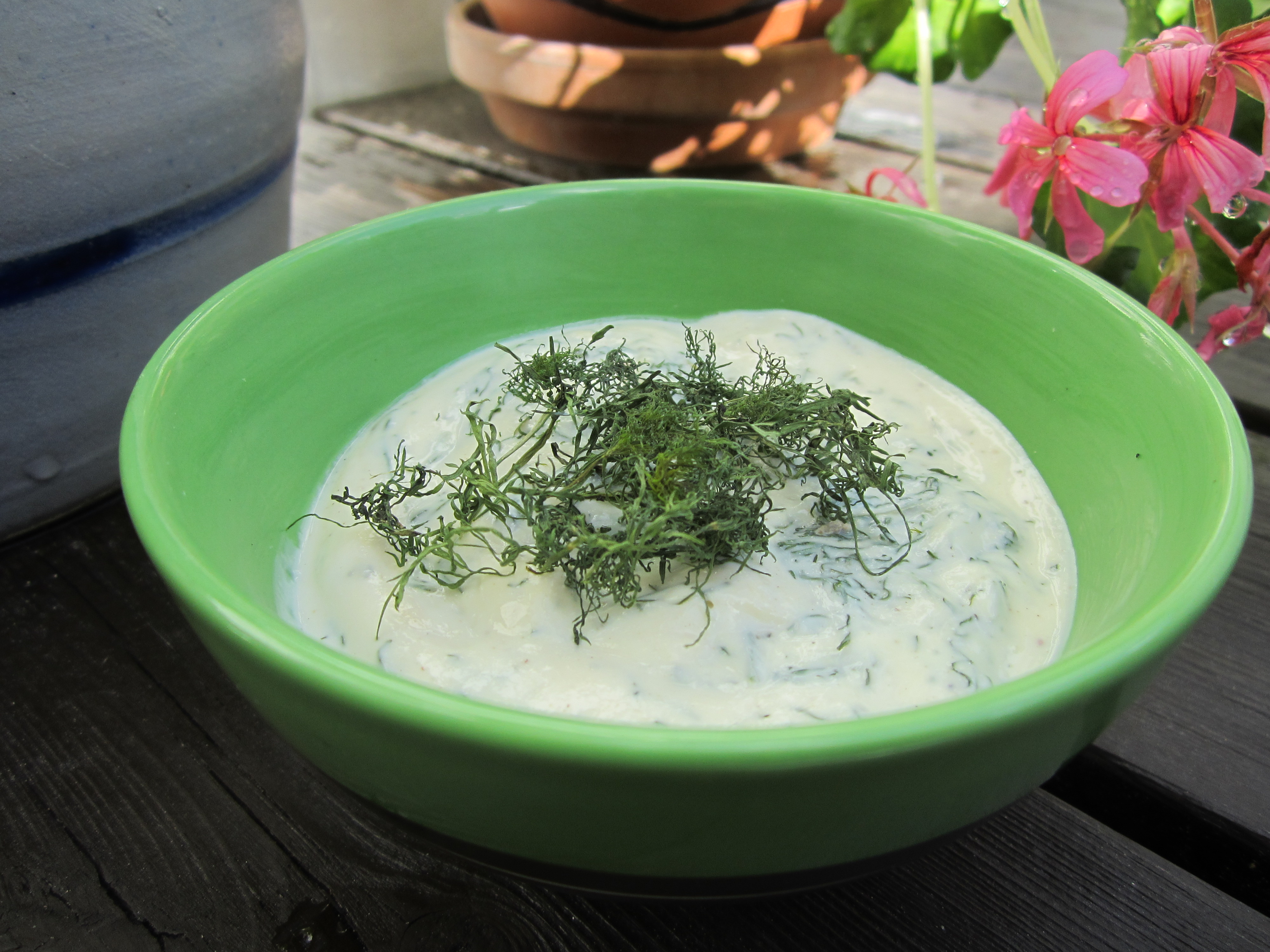 Yoghurten røres sammen med tahini og finklippet dill. Jeg gir den i tillegg et ørlite dryss av salt og noen runder nykvernet pepper.